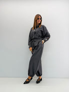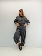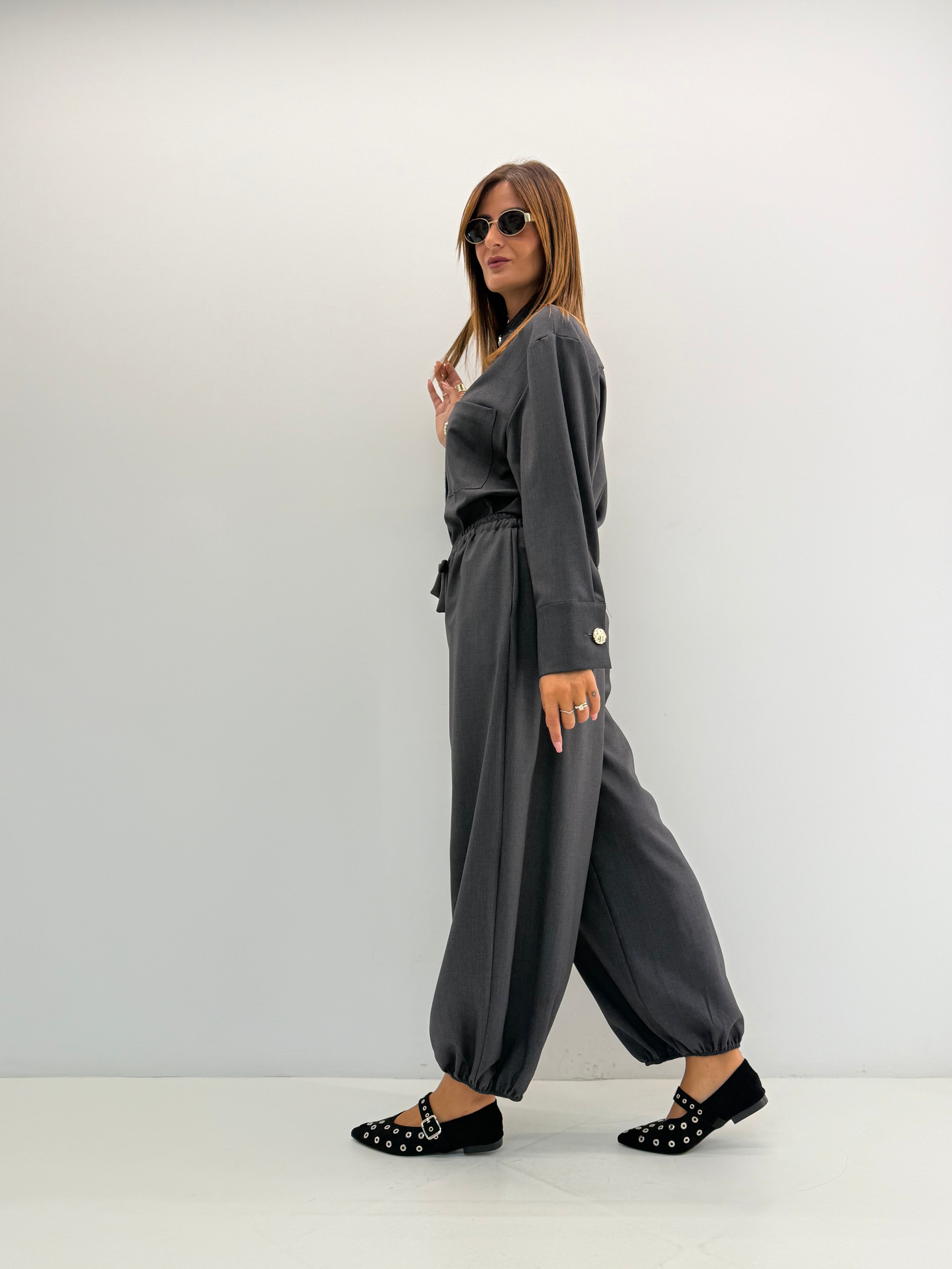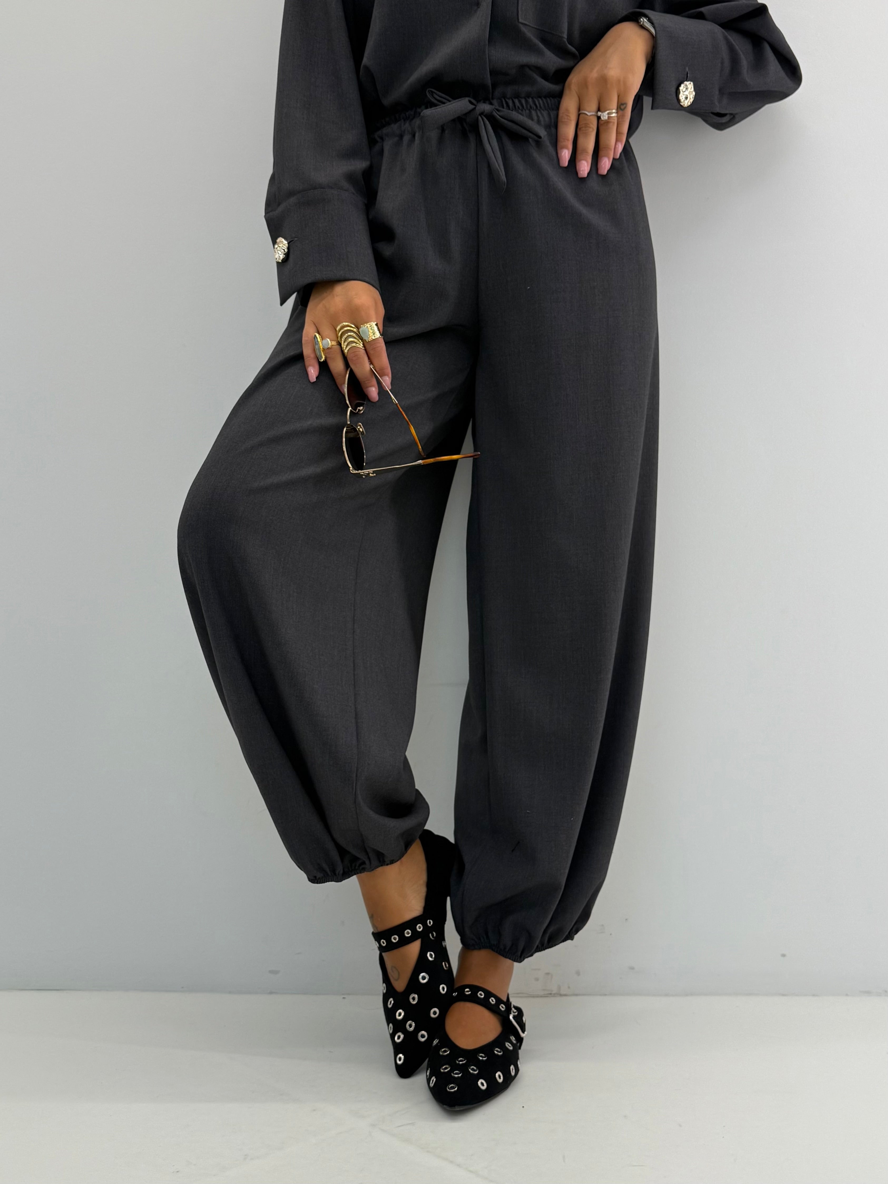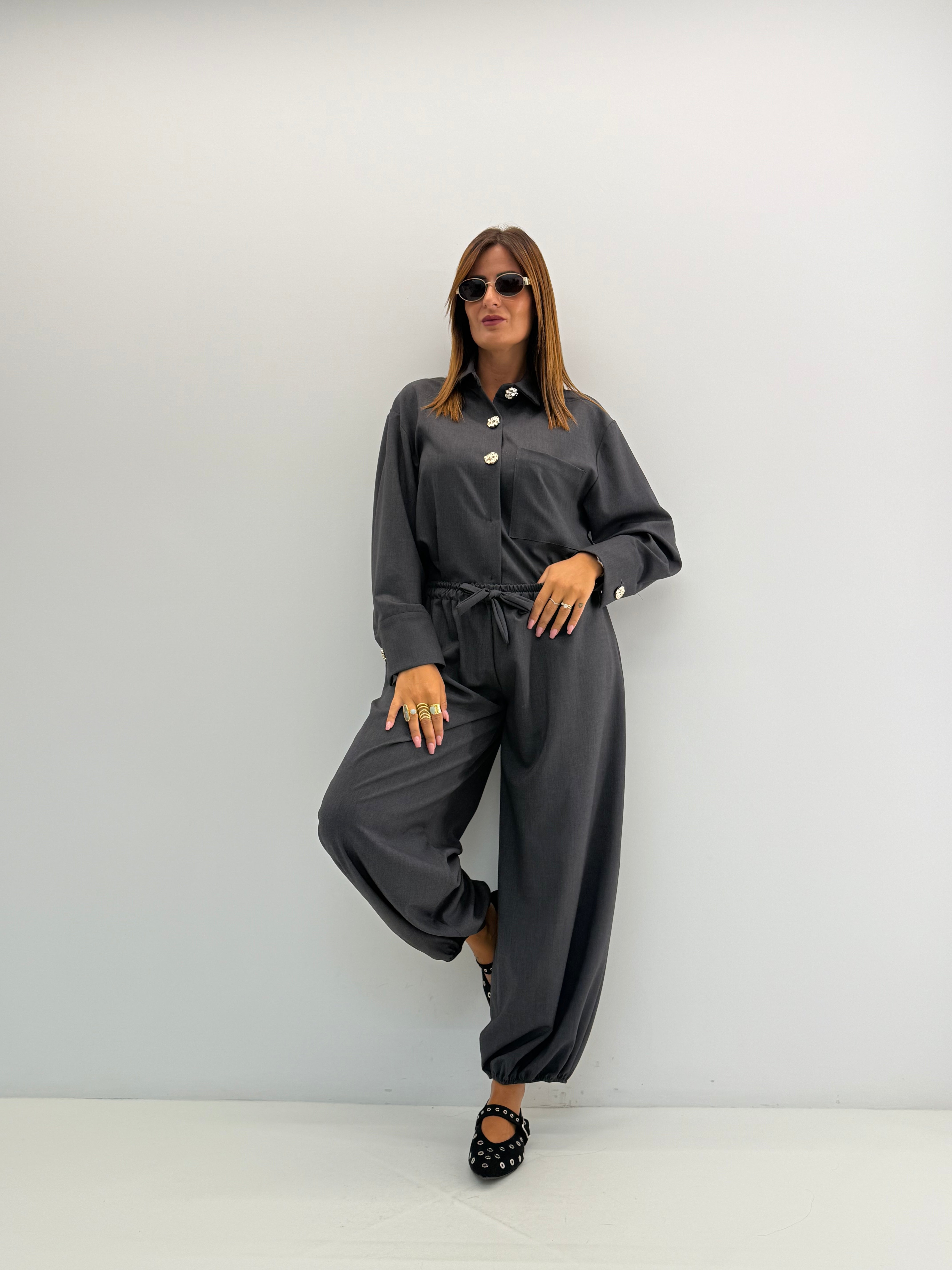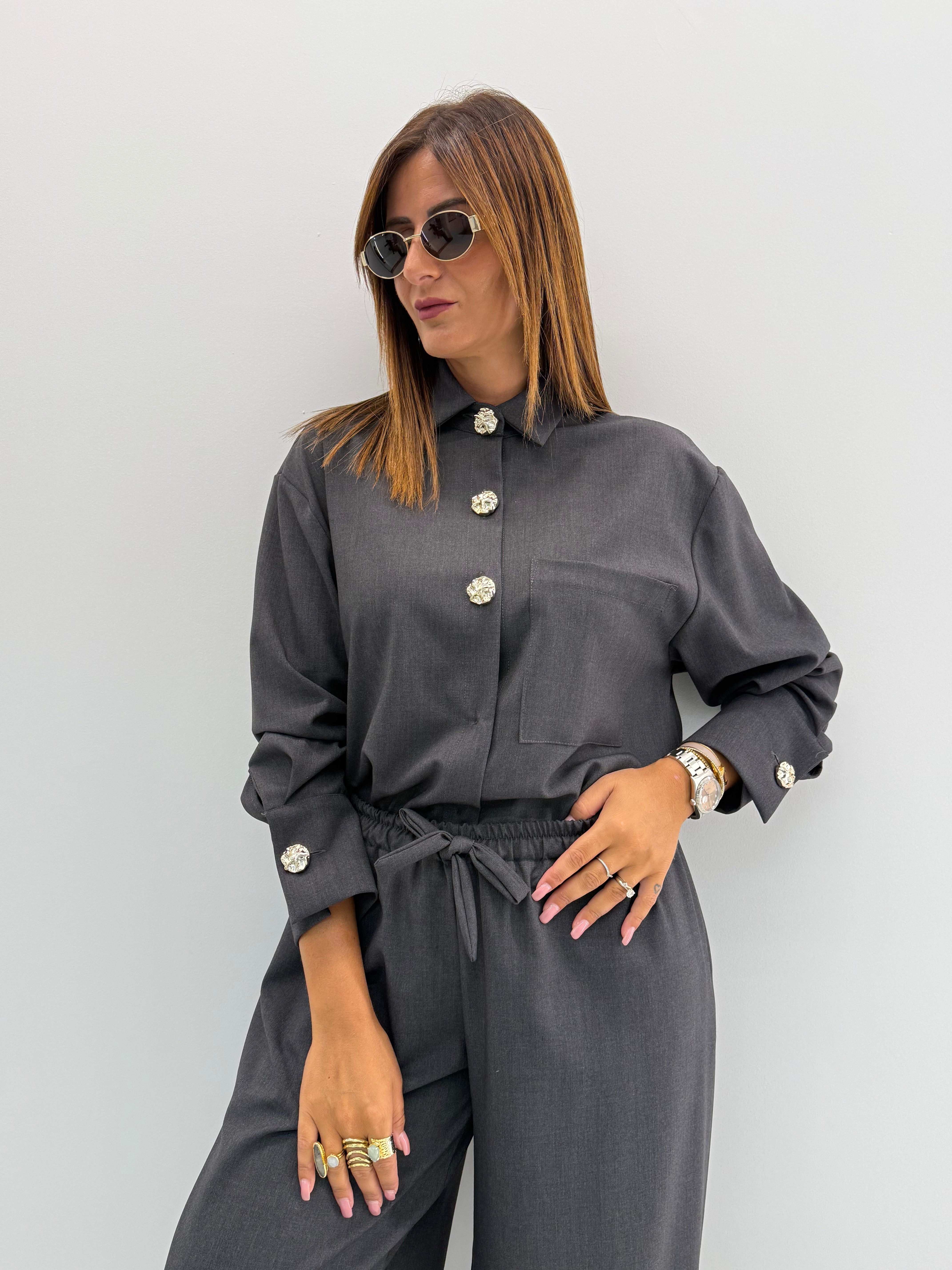 Coordinato composto da 2 pezzi: camicia over, con bottoncini gold. Pantalone con elastico in vita.