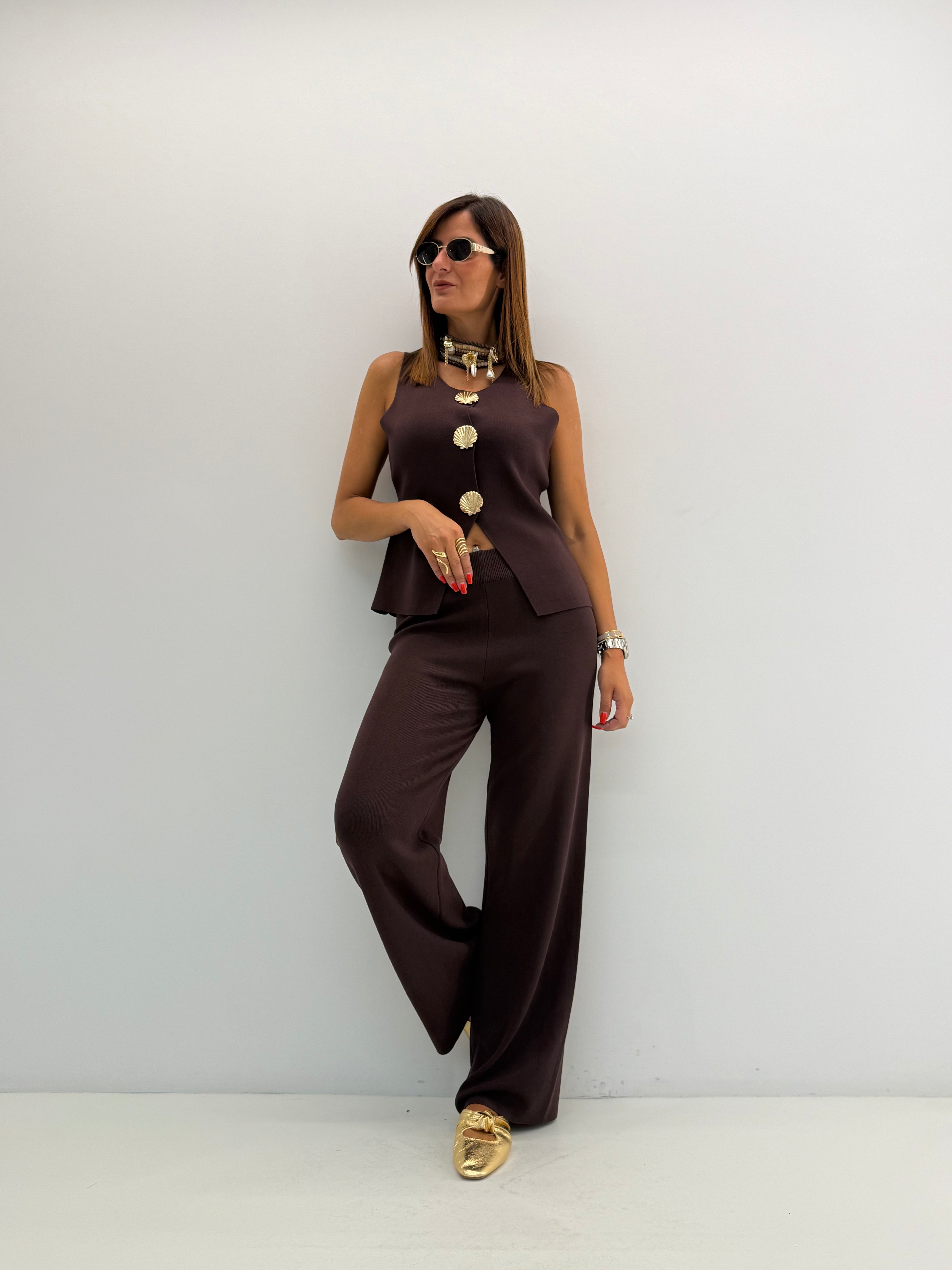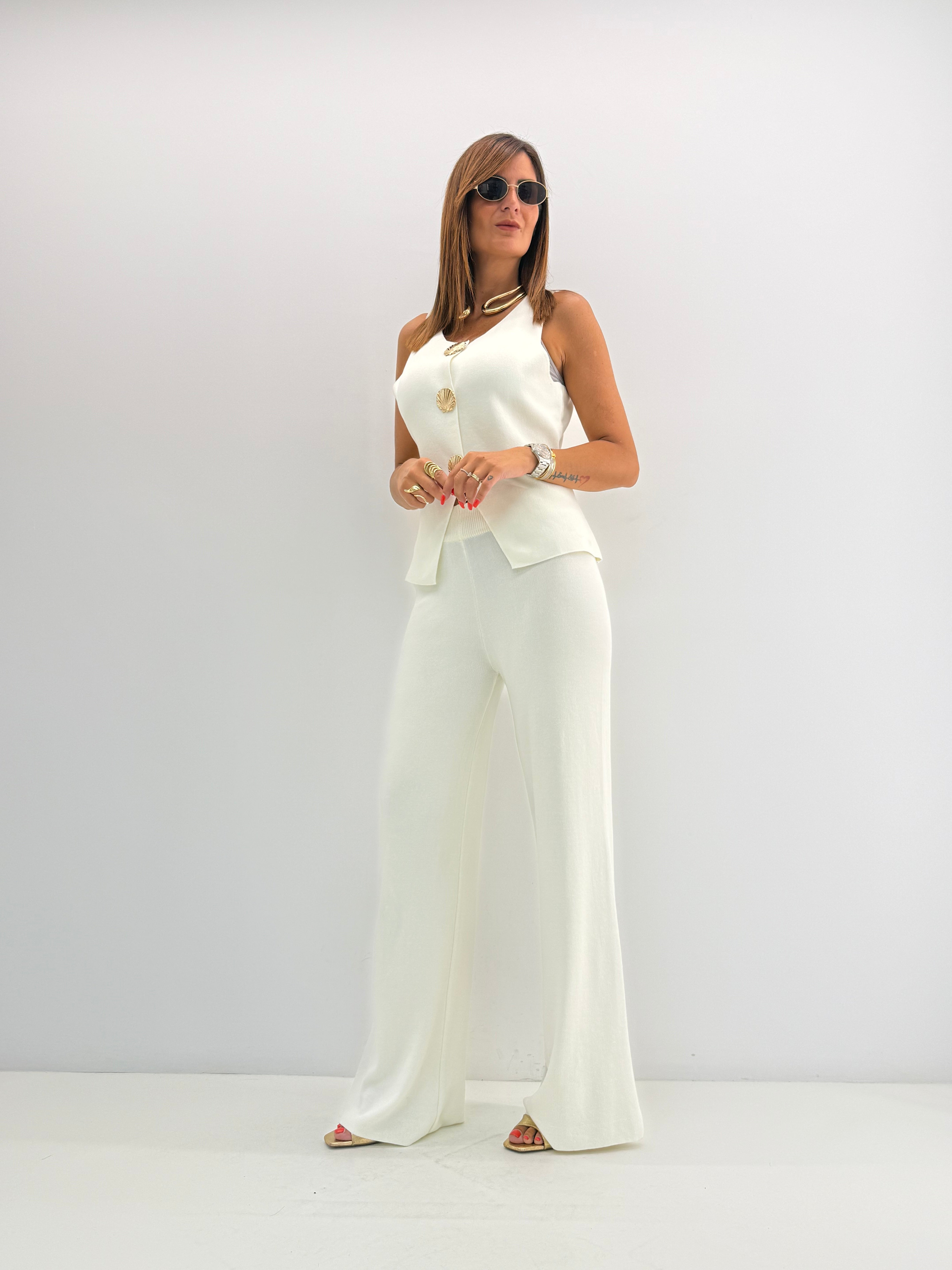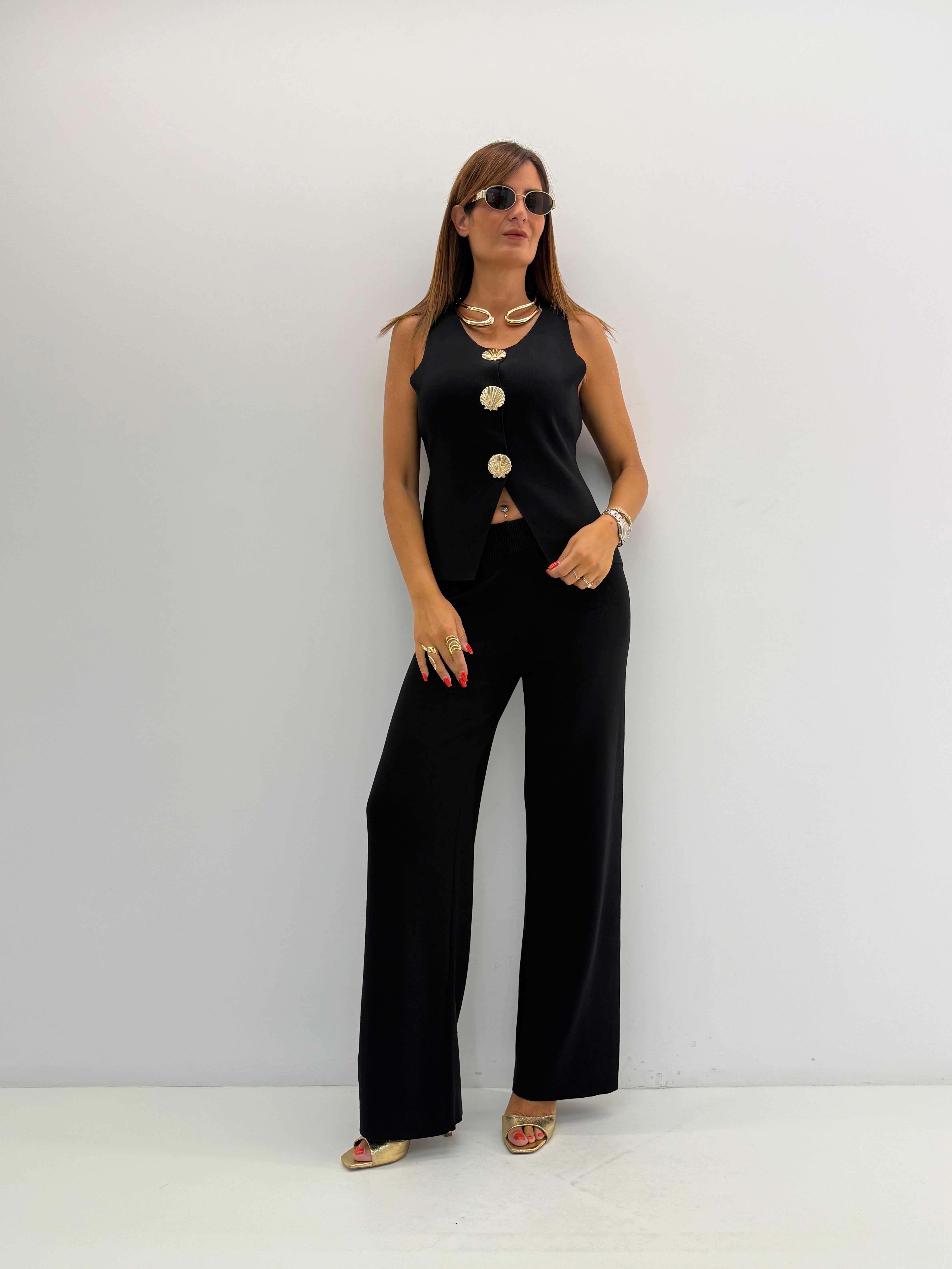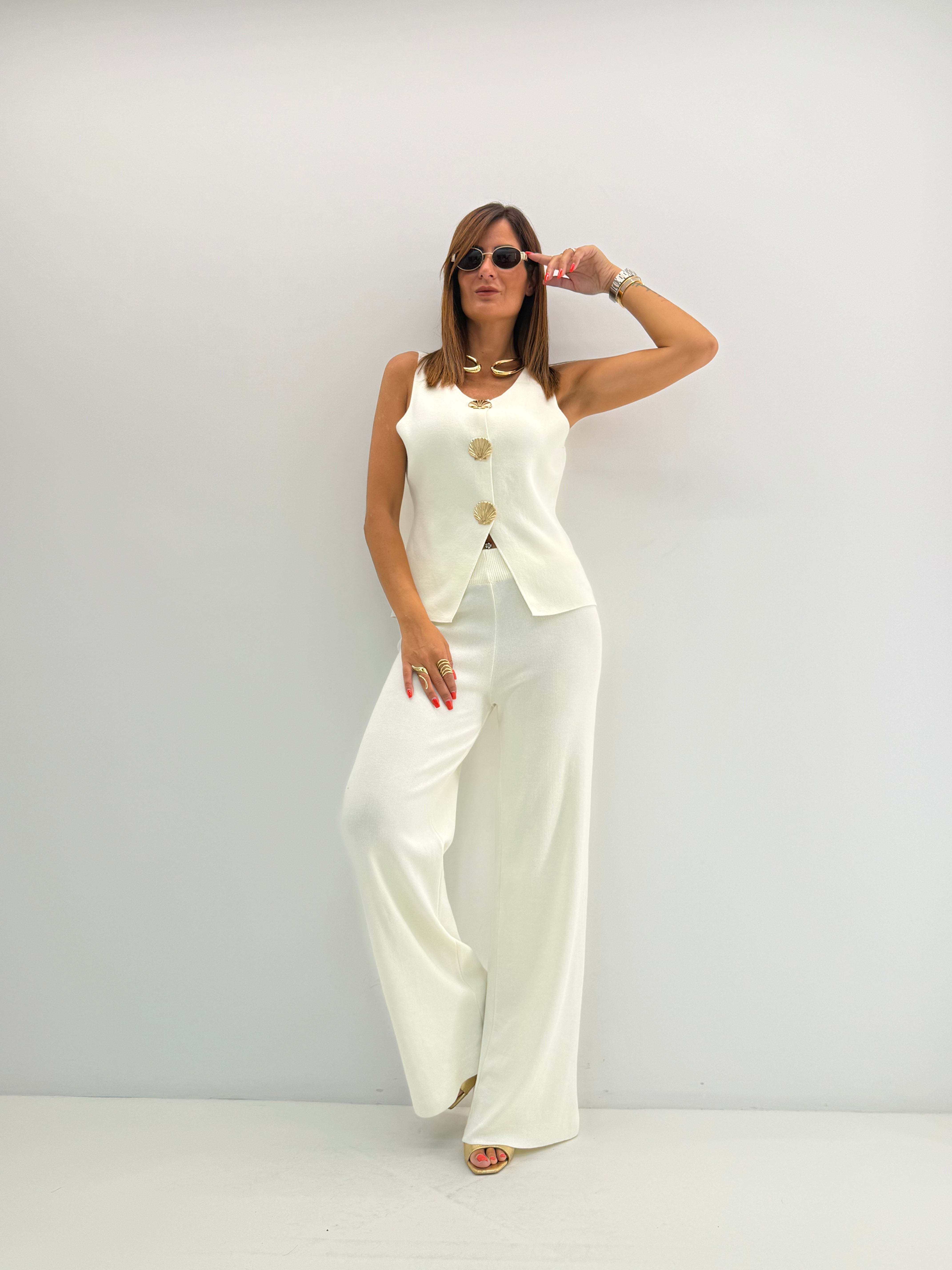 Coordinato composto da 2 pezzi: Top senza maniche lavorazione a costine svasato sul fondo con piccolo spacco frontale, chiusura con tre max bottoni dorati. Pantaloni a palazzo, a vita media con vestibilità morbida e fluida, senza chiusure e vita elastica