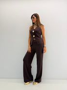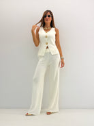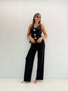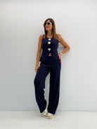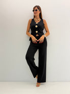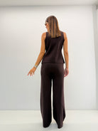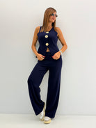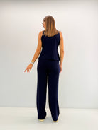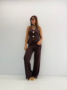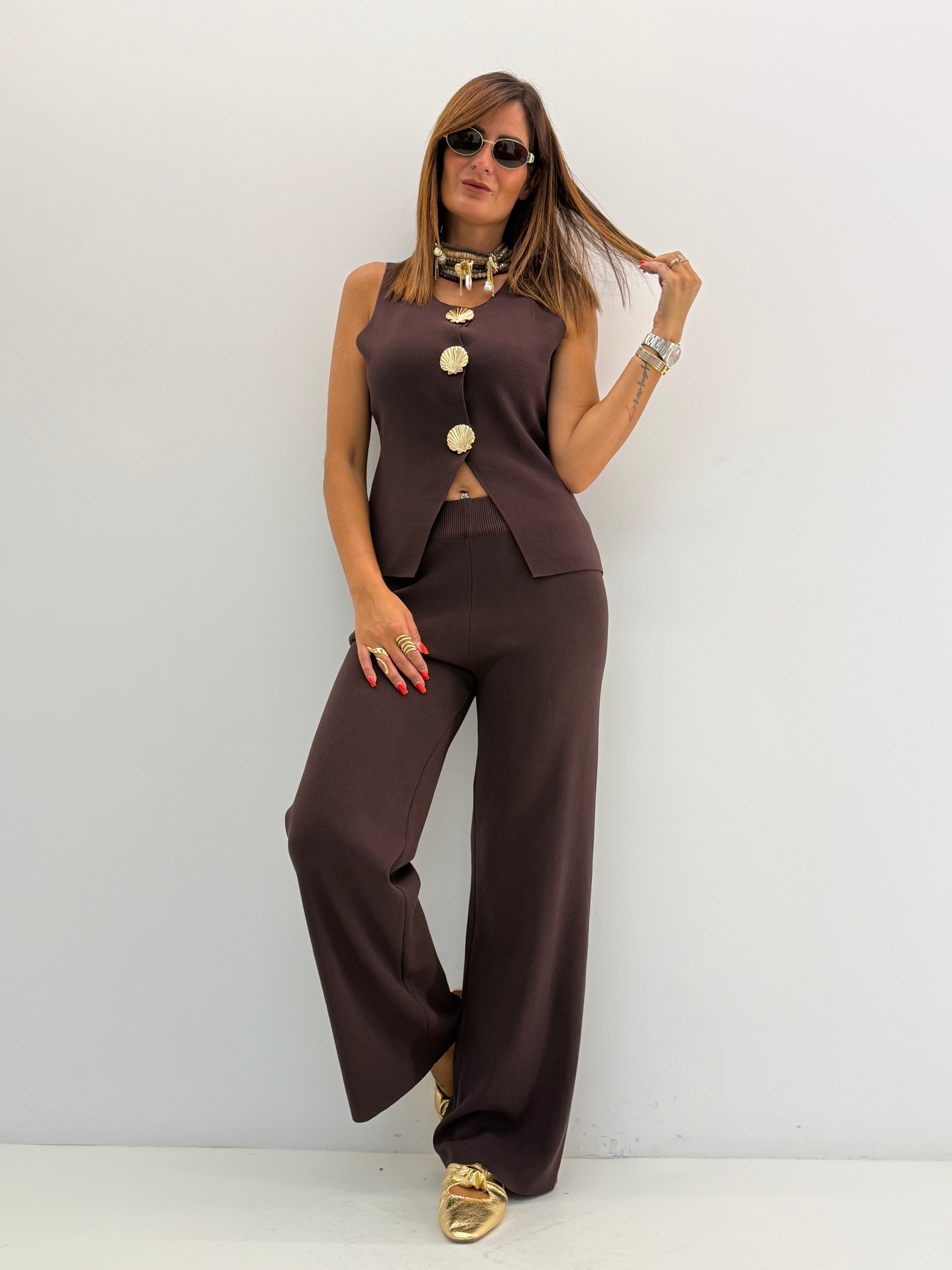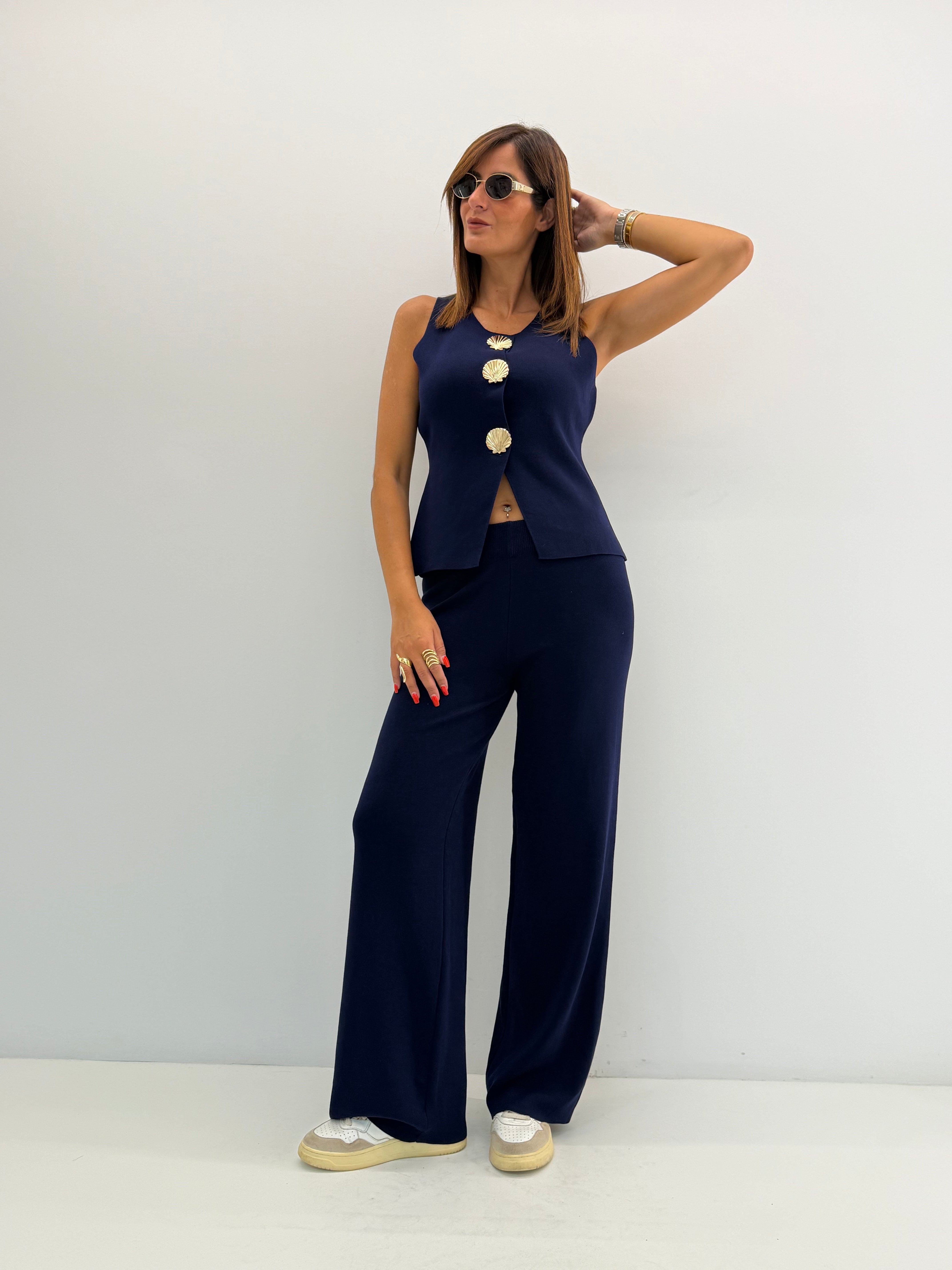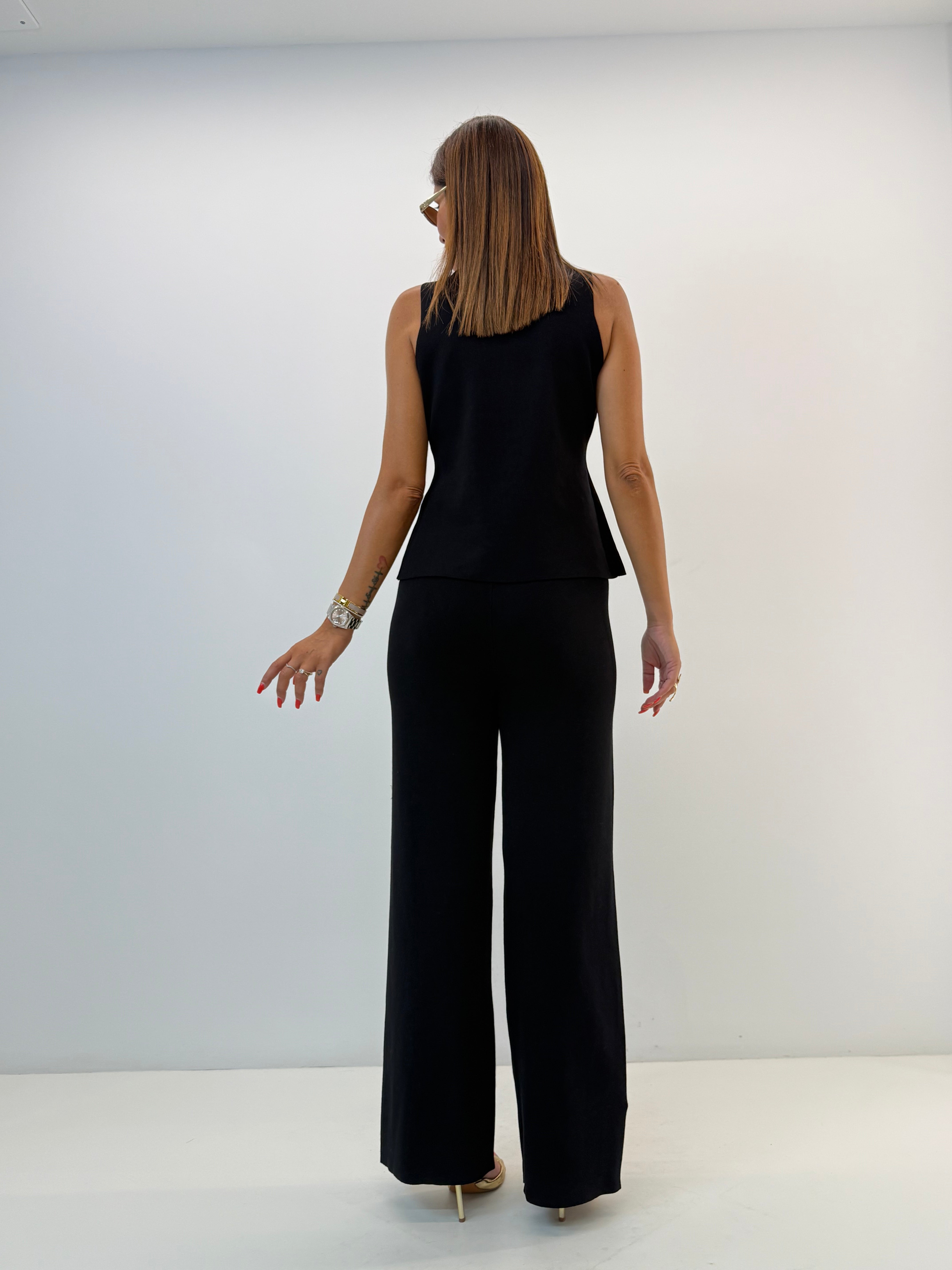 Coordinato composto da 2 pezzi: Top senza maniche lavorazione a costine svasato sul fondo con piccolo spacco frontale, chiusura con tre max bottoni dorati. Pantaloni a palazzo, a vita media con vestibilità morbida e fluida, senza chiusure e vita elastica