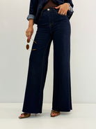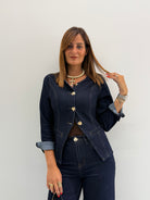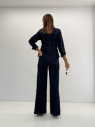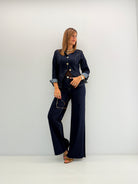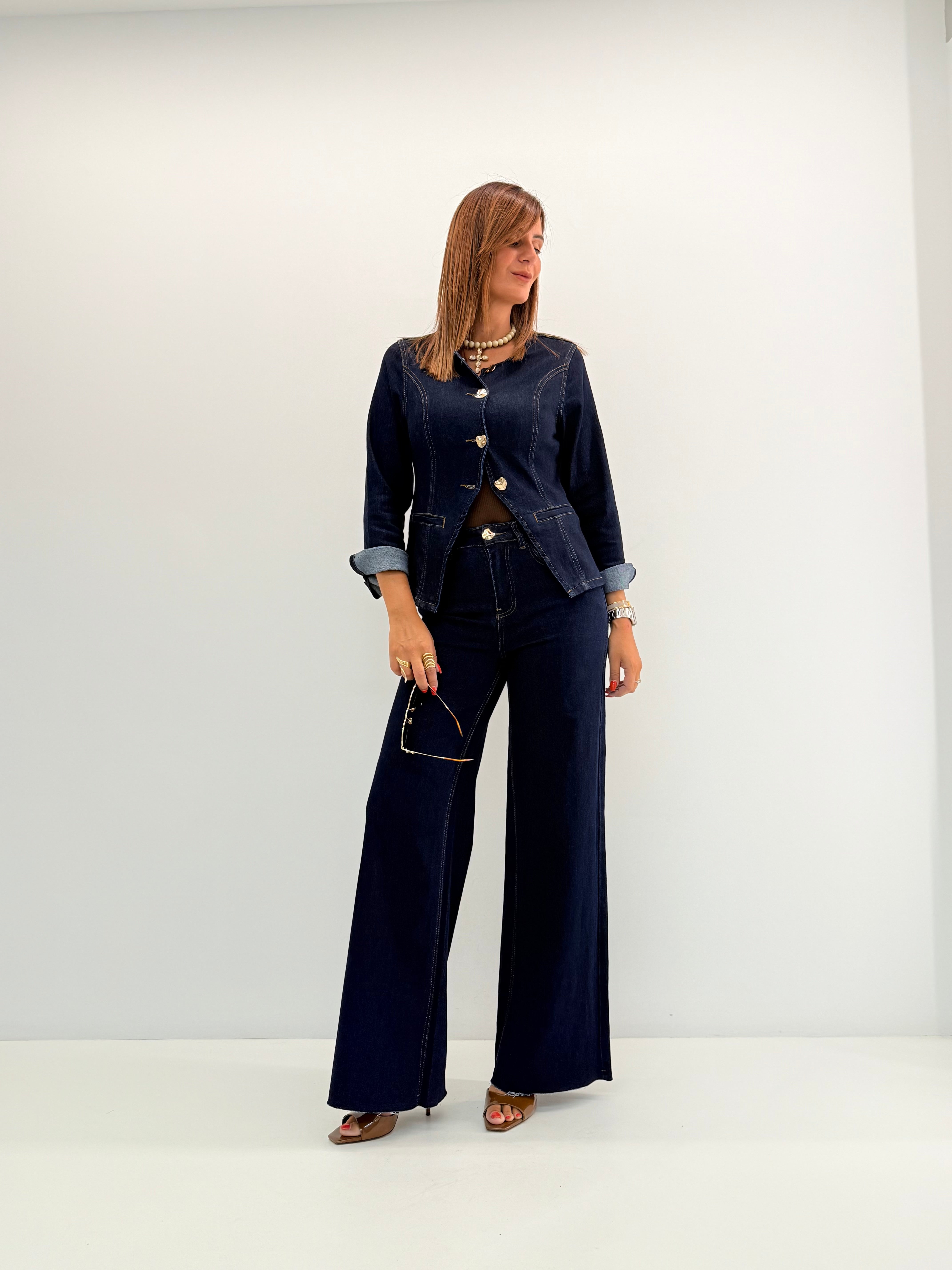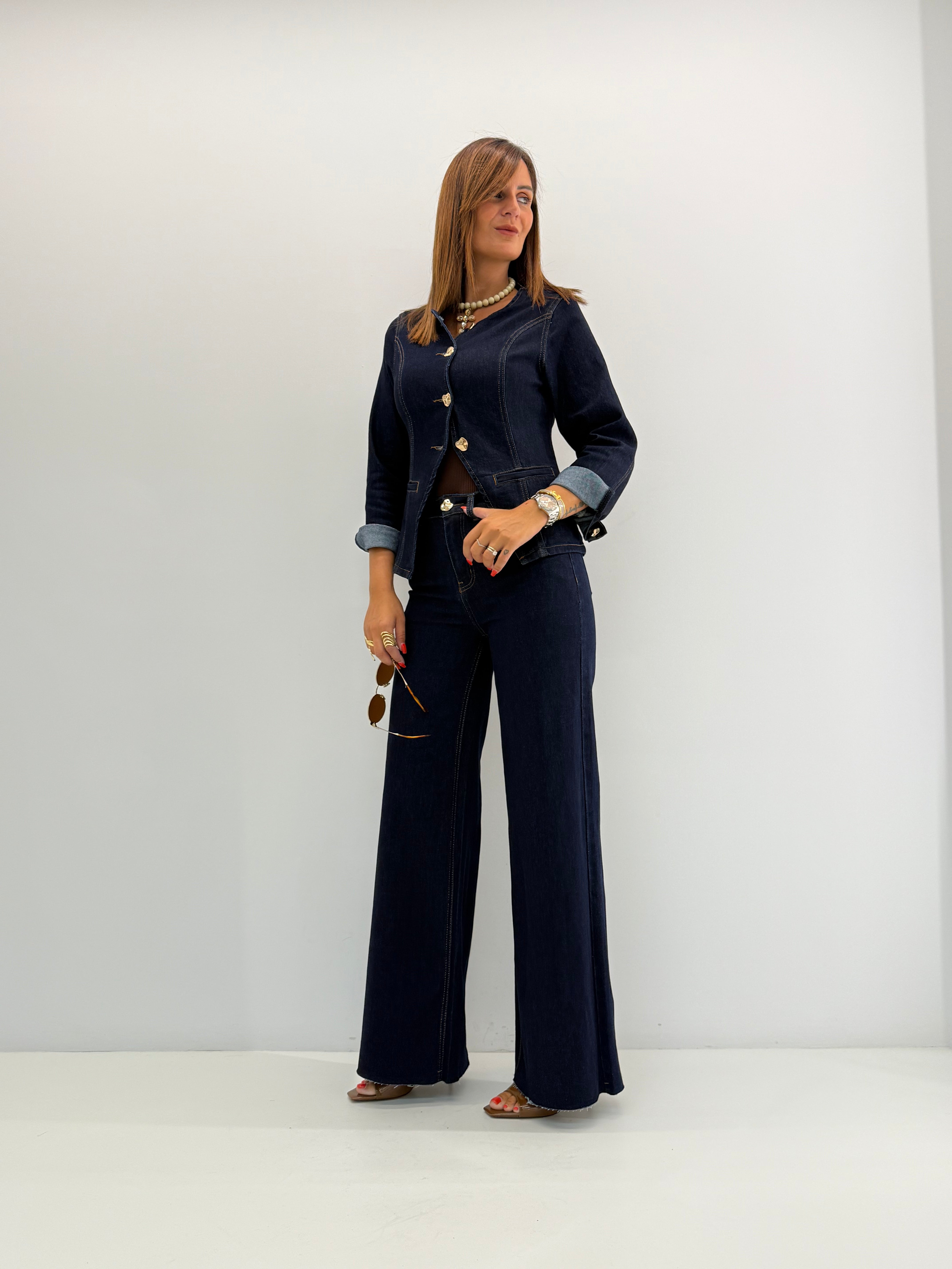 Coordinato in denim misto cotone composto da 2 pezzi. Giacca con scollo rotondo, chiusura davanti con bottoncini gold, manica lunga con bottoncino per chiusura, spacchetto davanti e dietro. Finte tasche a filetto davanti. Pantalone a gamba larga, passanti per cintura. Chiusura con zip e bottone. Tasche laterali a lunetta e tasche dietro. Vestibilità a taglie.