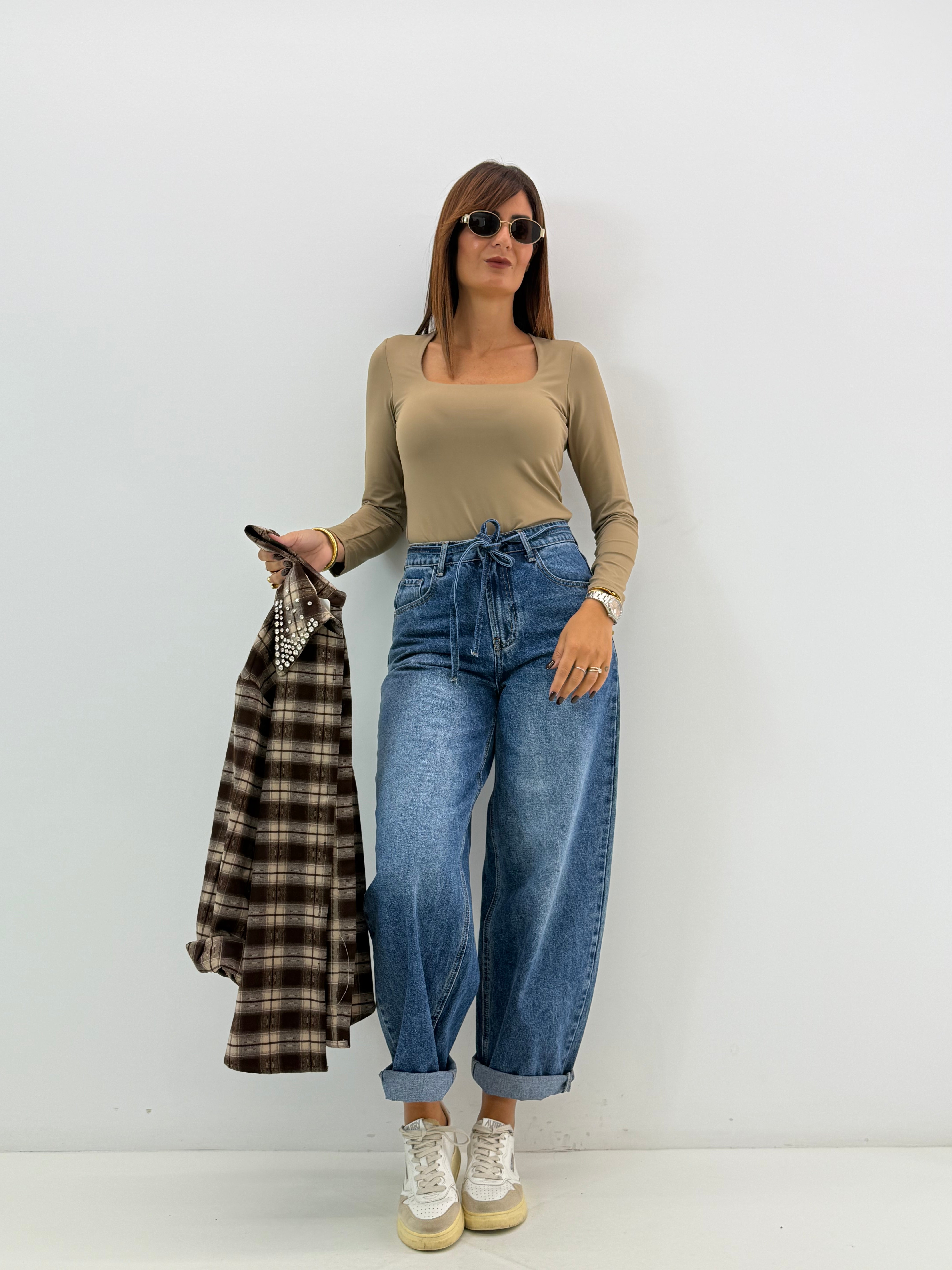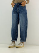 Jeans a vita alta, in cotone, modello baggy. Chiusura frontale con cerniera e bottone, modello 5 tasche. Vestibilità a taglie