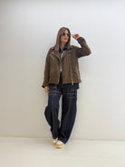 la modella in foto è alta 171 cm veste una 42 e indossa la tg S