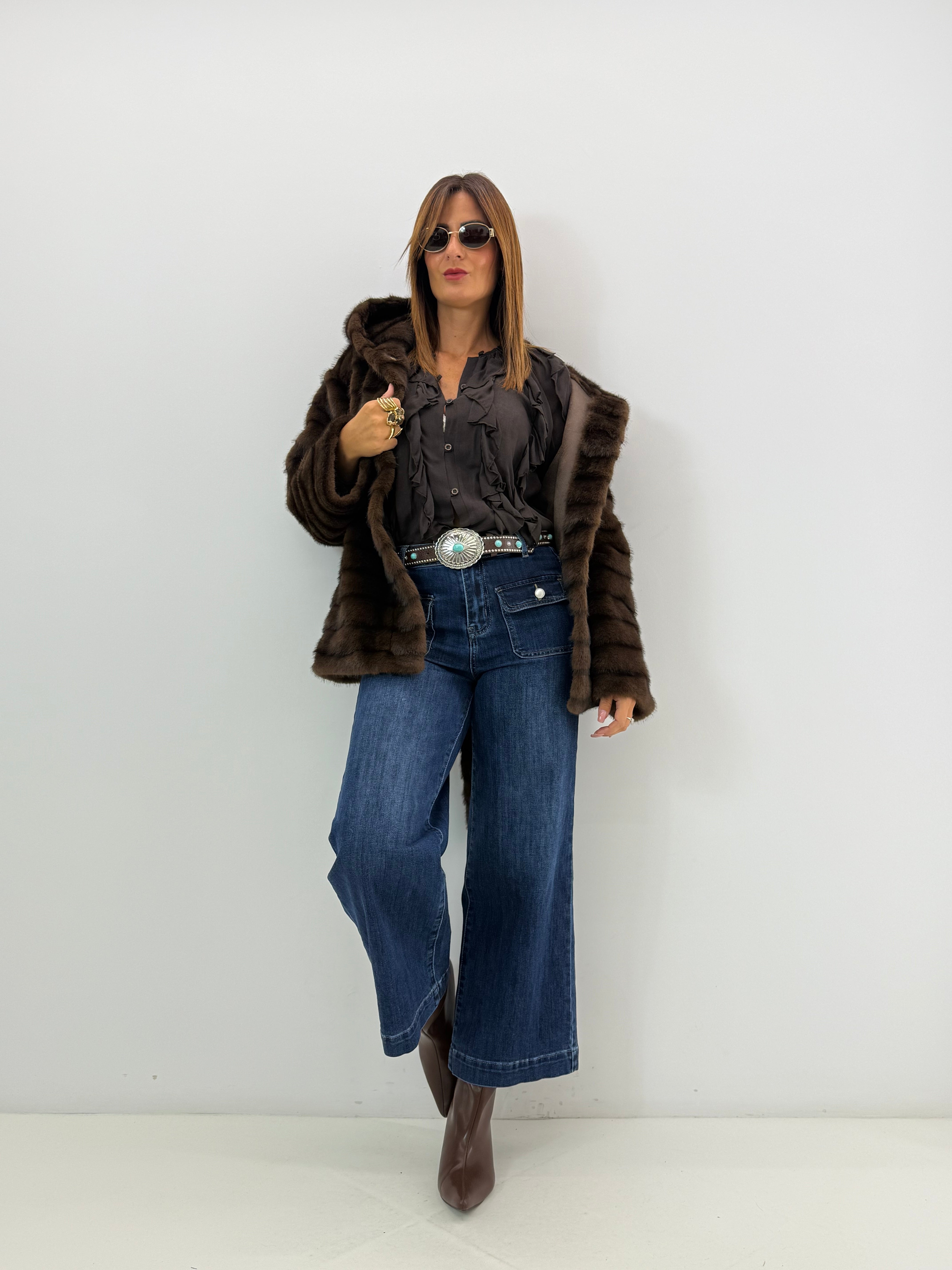 la modella in foto è alta 171 cm veste una 42 e indossa la tg S