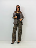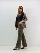 la modella in foto è alta 171 cm veste una 42 e indossa la tg S