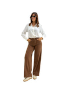 Jeans a vita alta, in cotone, modello a gamba larga. Chiusura frontale con cerniera e bottone, tasche davanti. Vestibilità a taglie