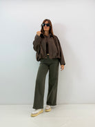 la modella in foto è alta 171 cm veste una 42 e indossa la tg S
