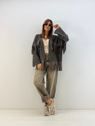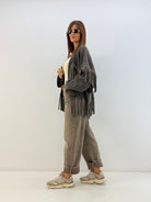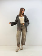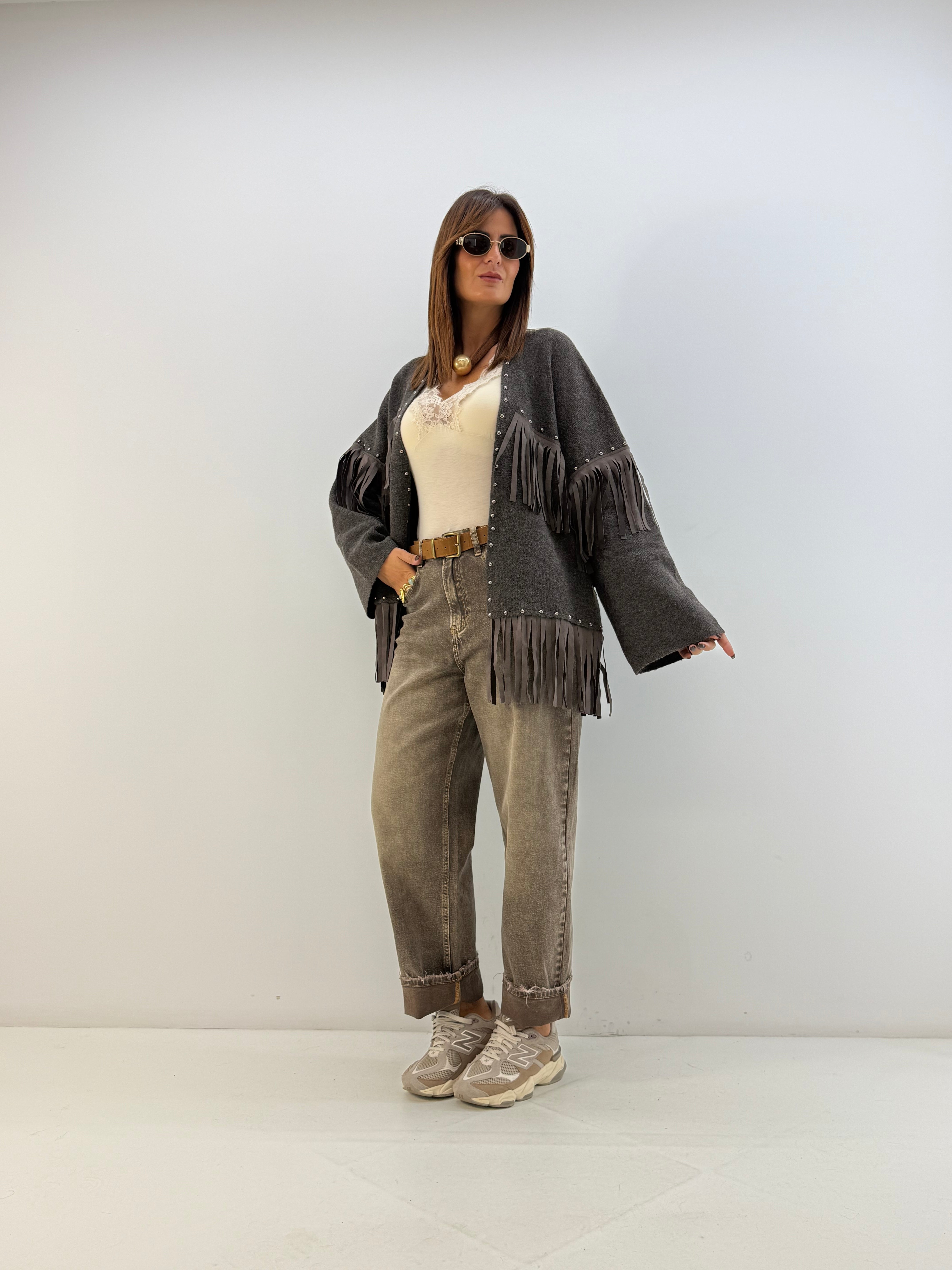 la modella in foto è alta 171 cm veste una 42 e indossa la tg S