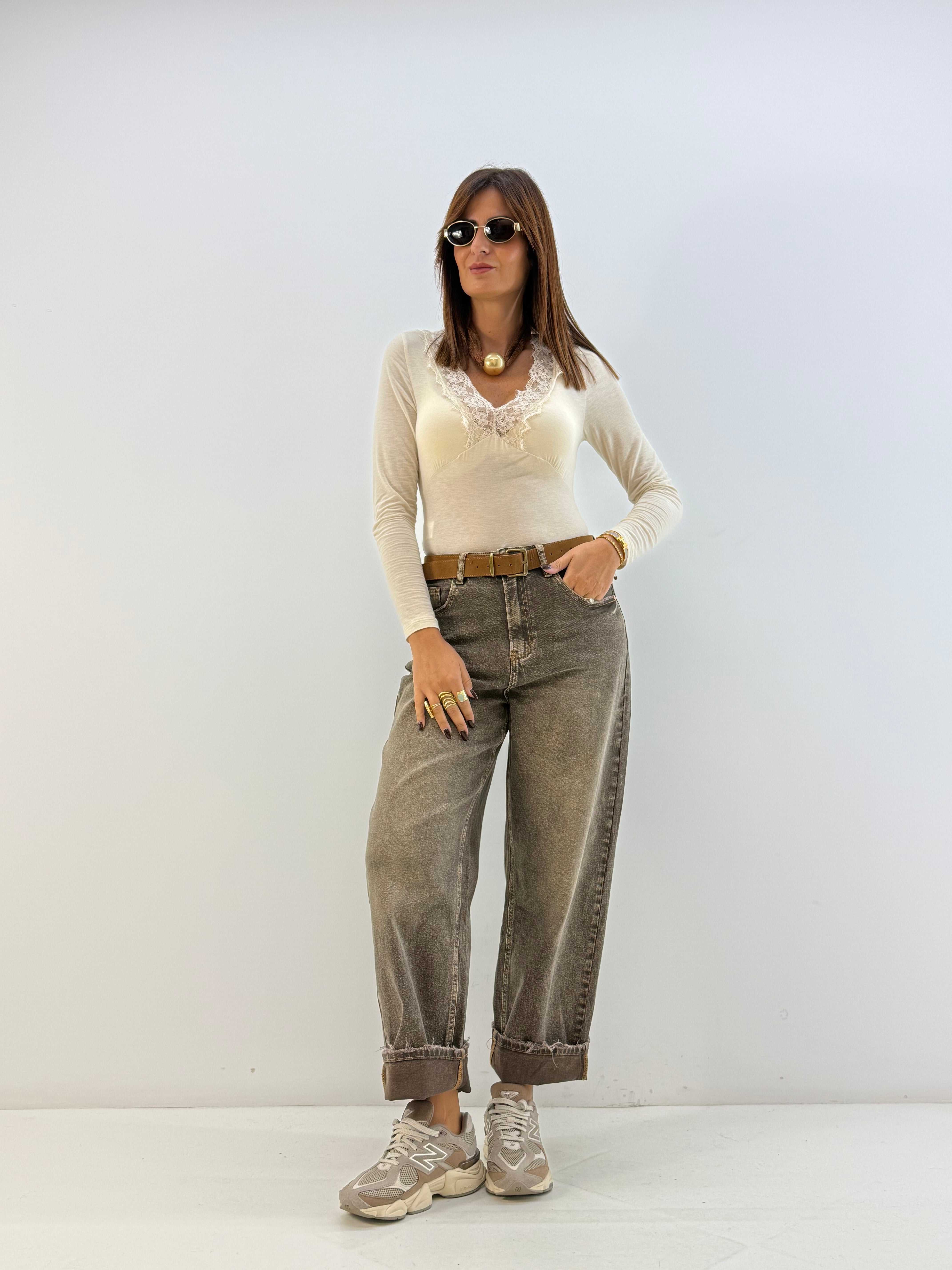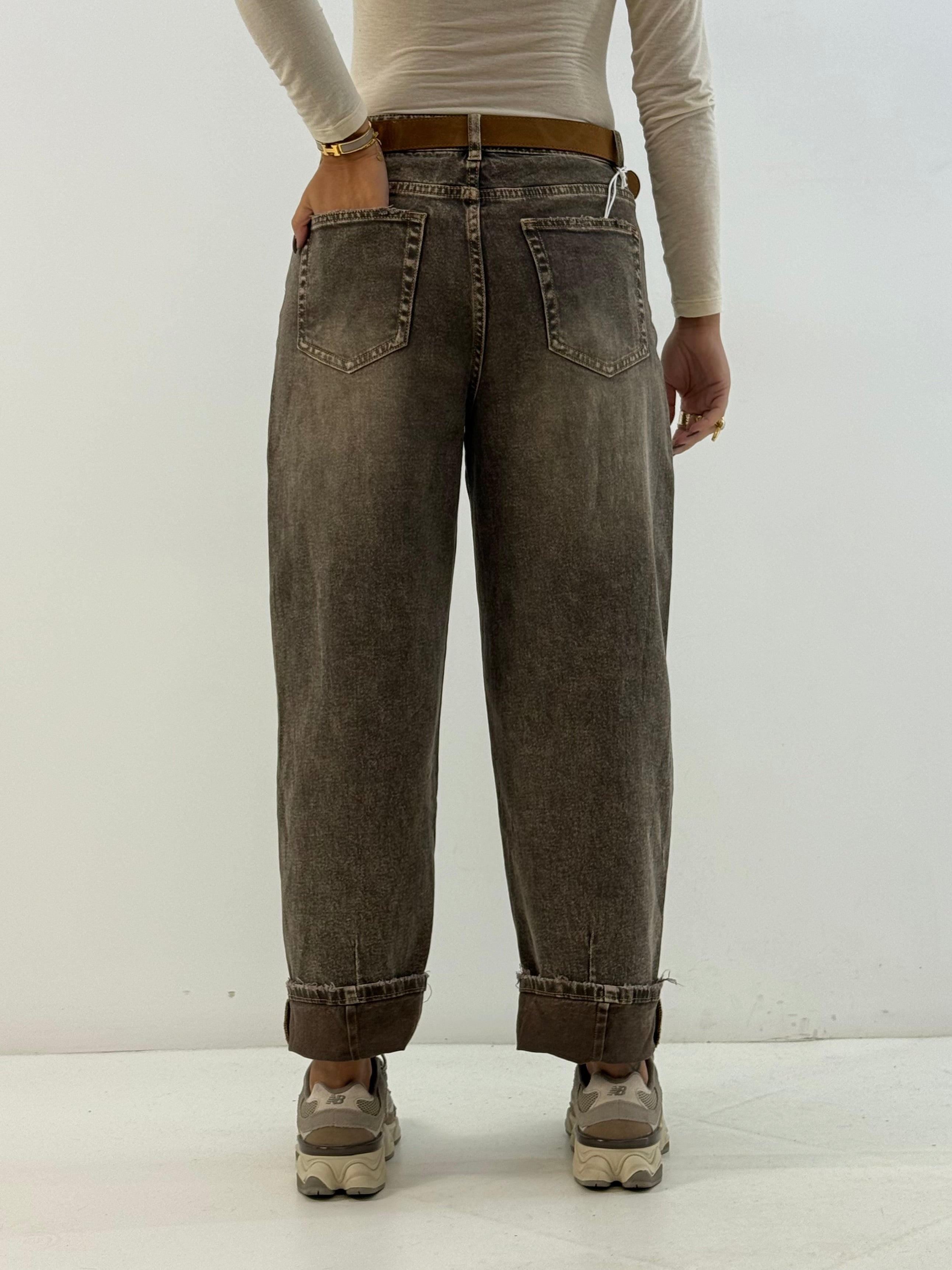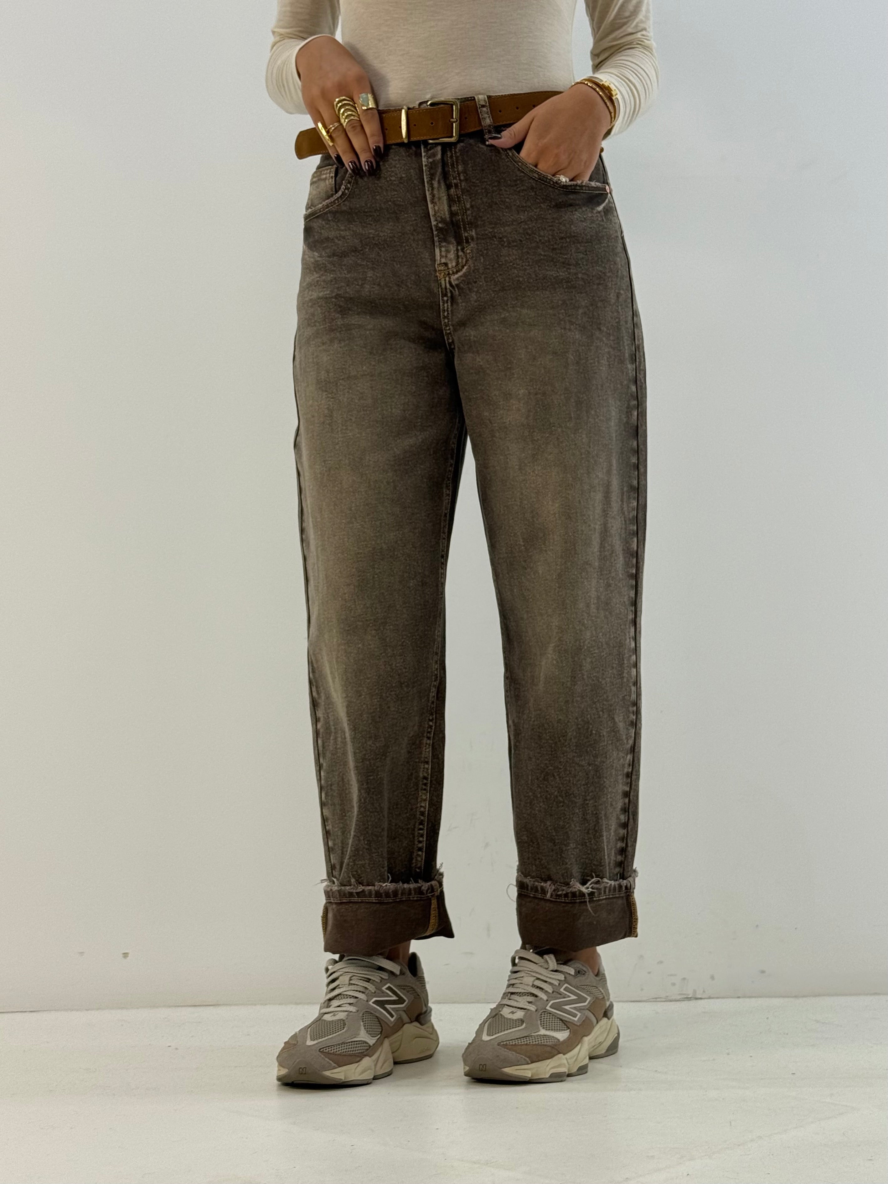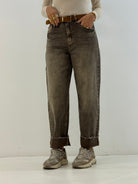 Jeans a vita alta, in cotone, modello baggy. Chiusura frontale con cerniera e bottone, modello 5 tasche, passanti per cintura. Vestibilità a taglie