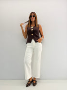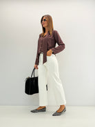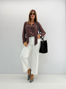 la modella in foto è alta 171 cm veste una 42 e indossa la tg S