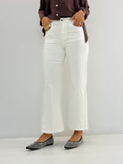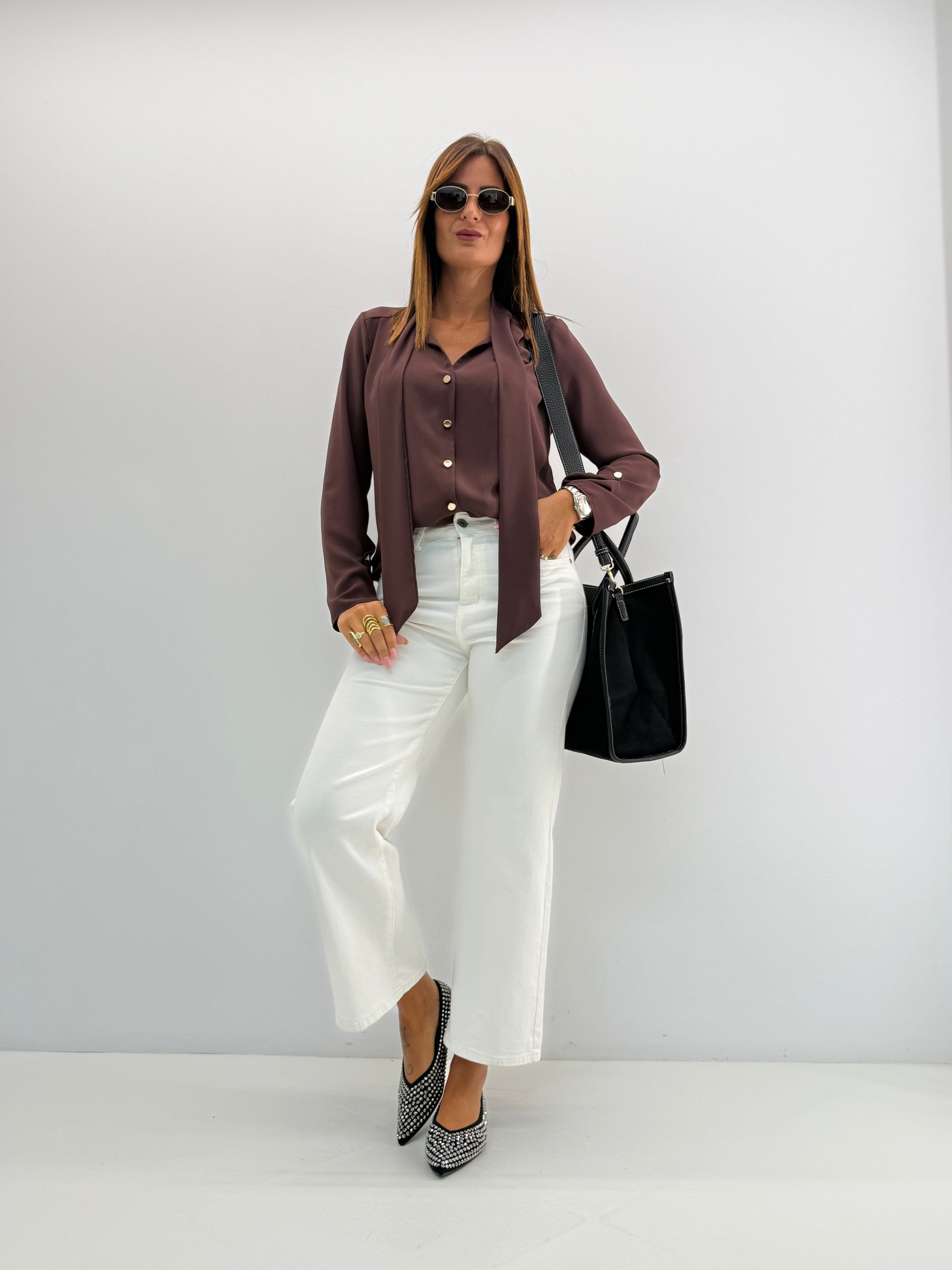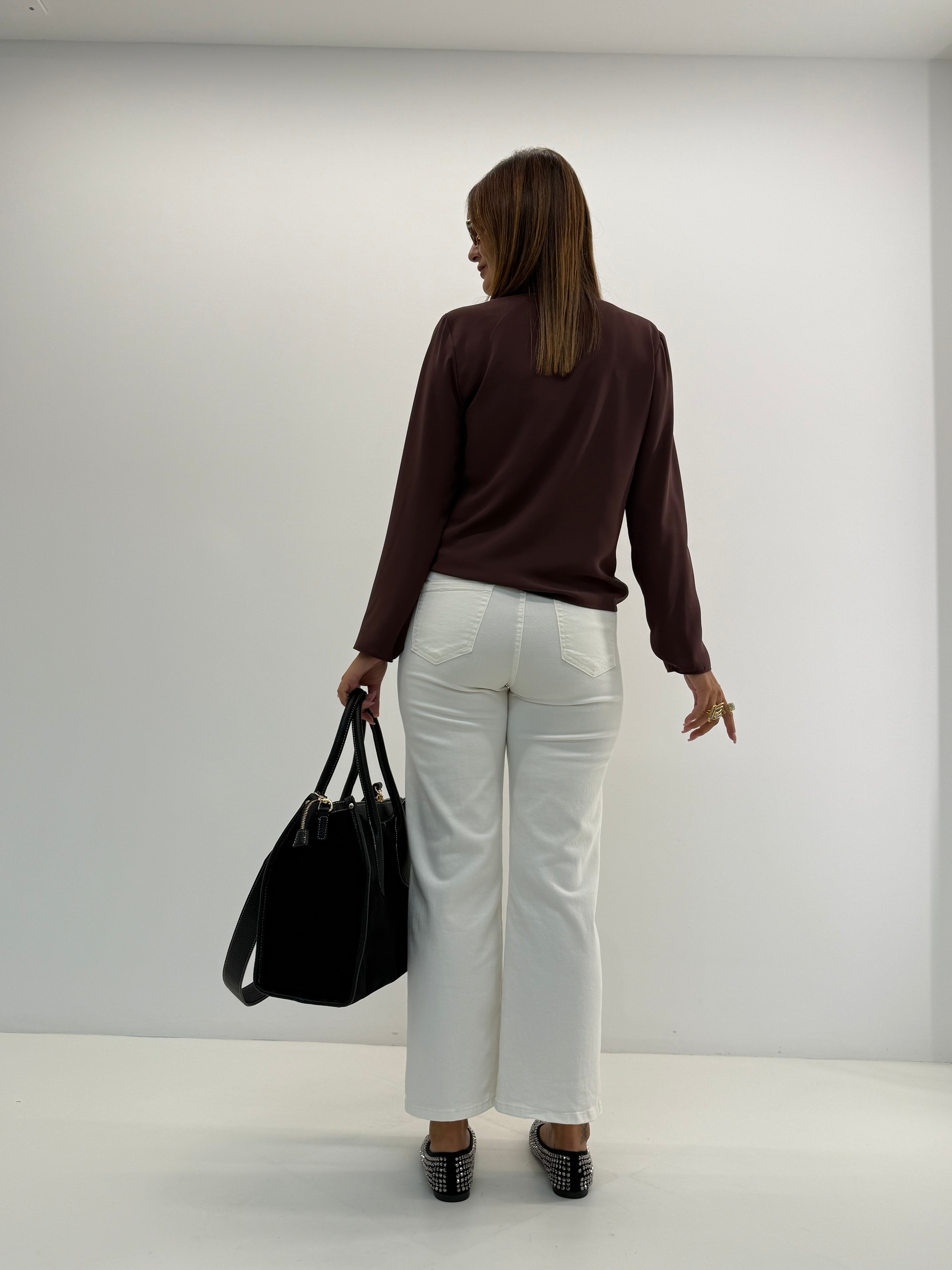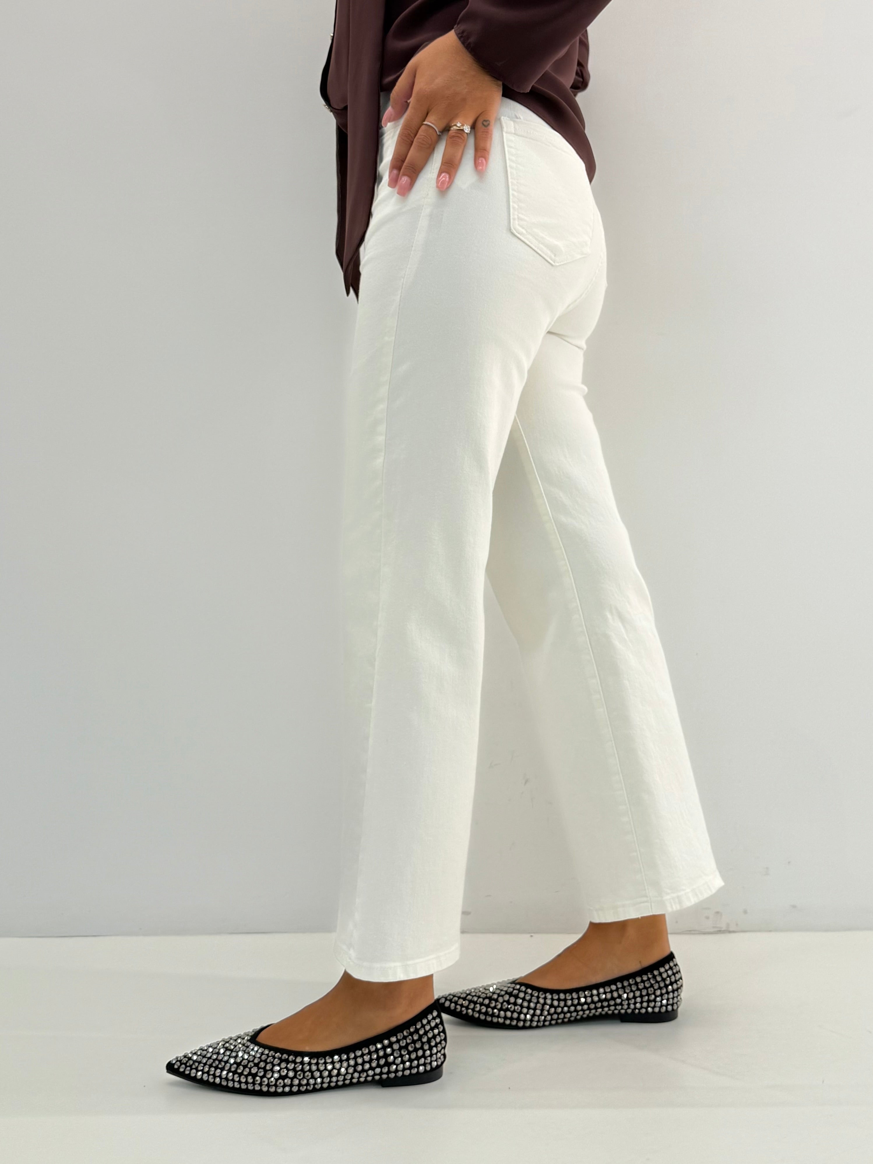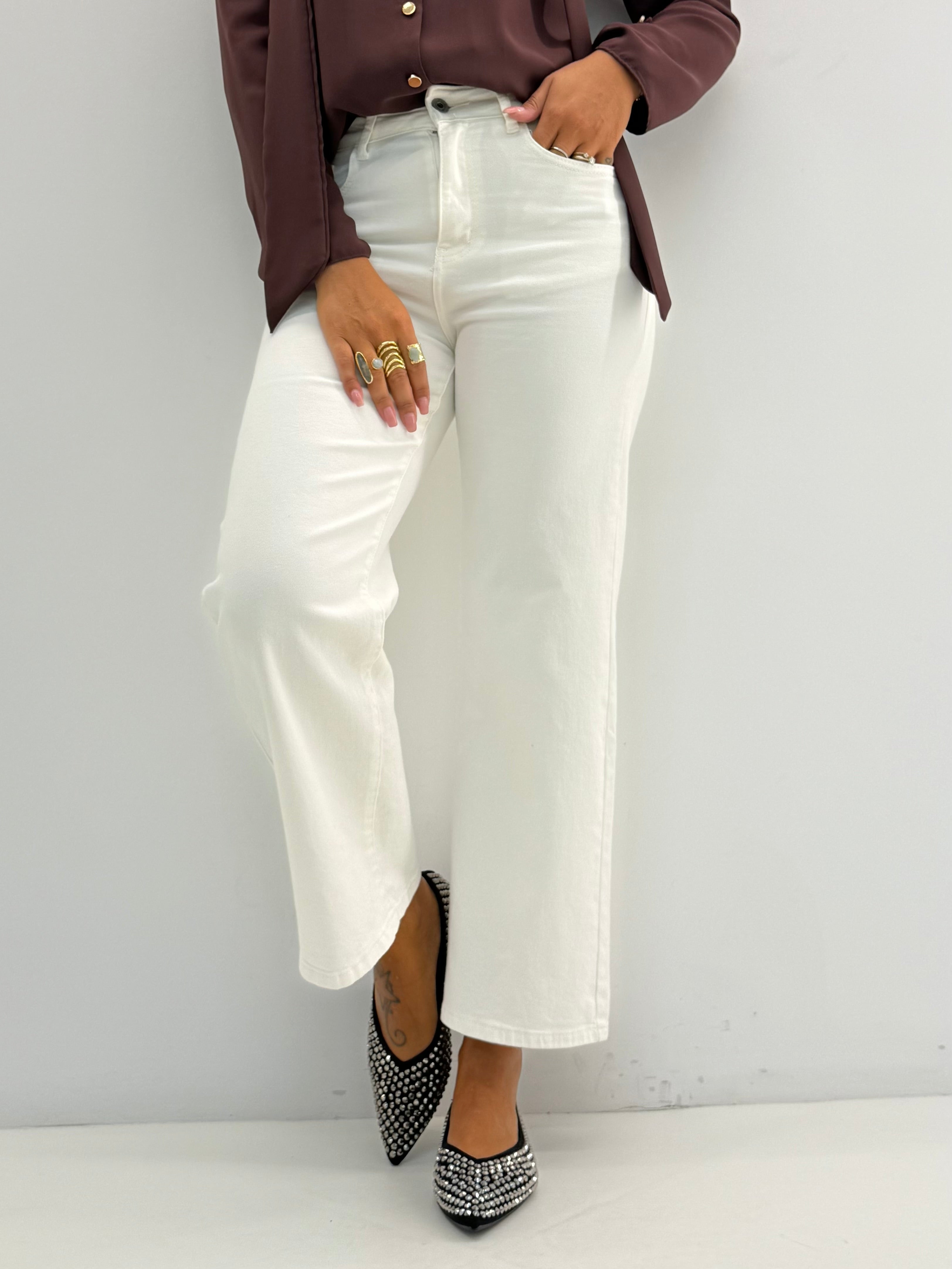 Jeans a vita alta, in cotone, modello dritto. Chiusura frontale con cerniera e bottone, tasche a lunetta laterali e 2 tasche dietro. Vestibilità a taglie