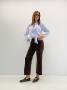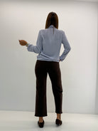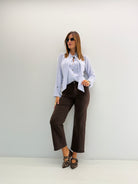 la modella in foto è alta 171 cm veste una 42 e indossa la tg S
