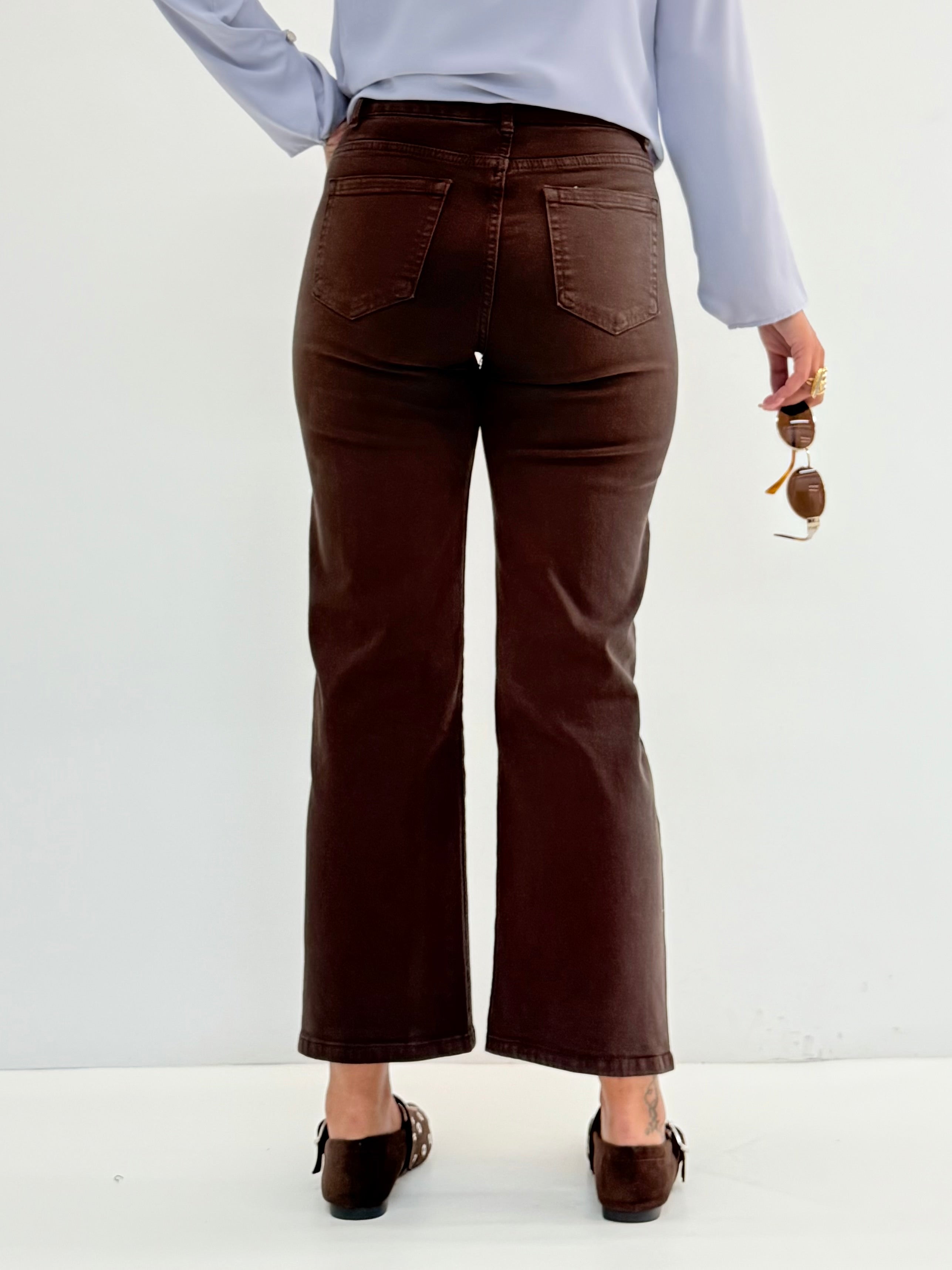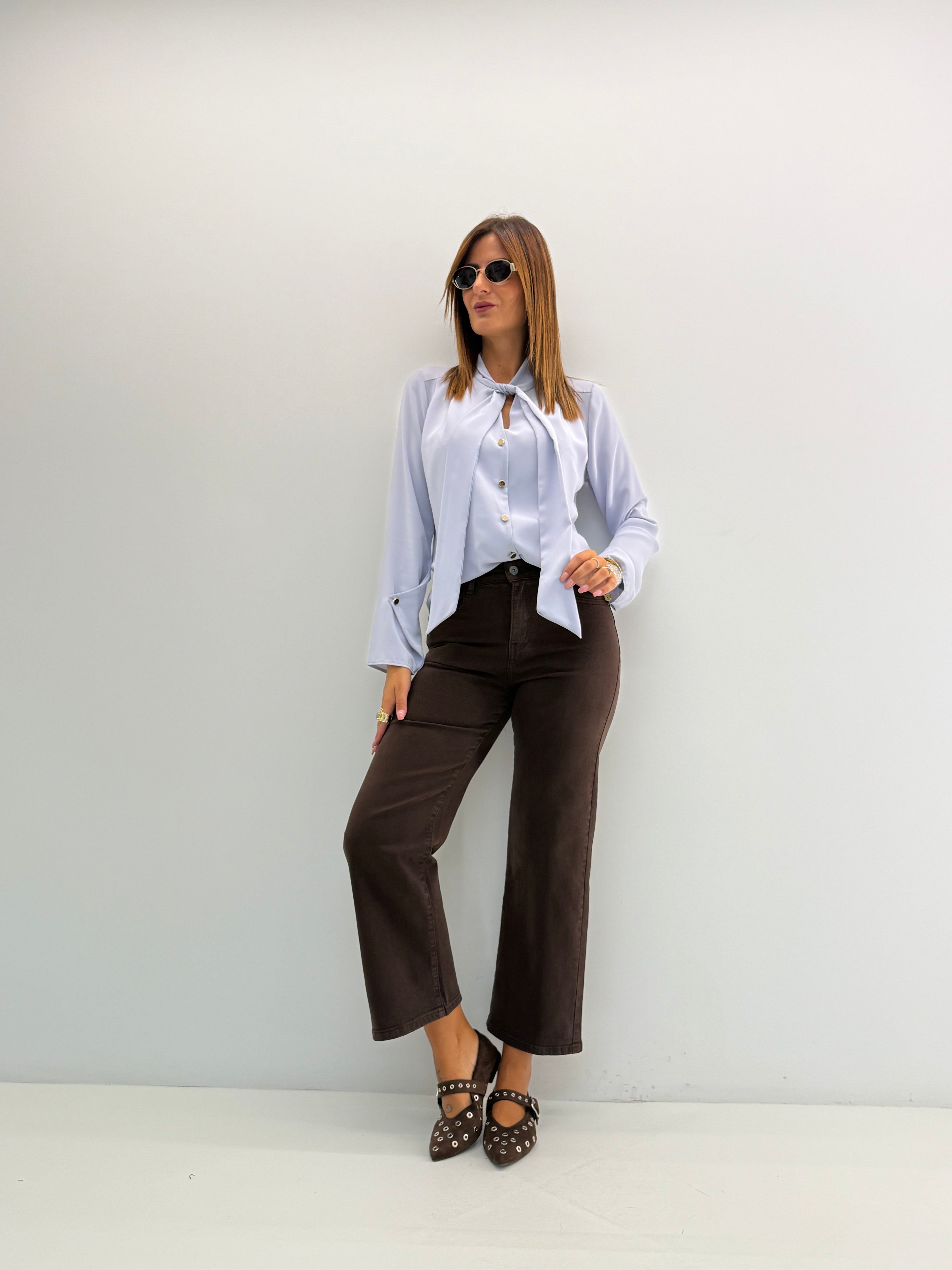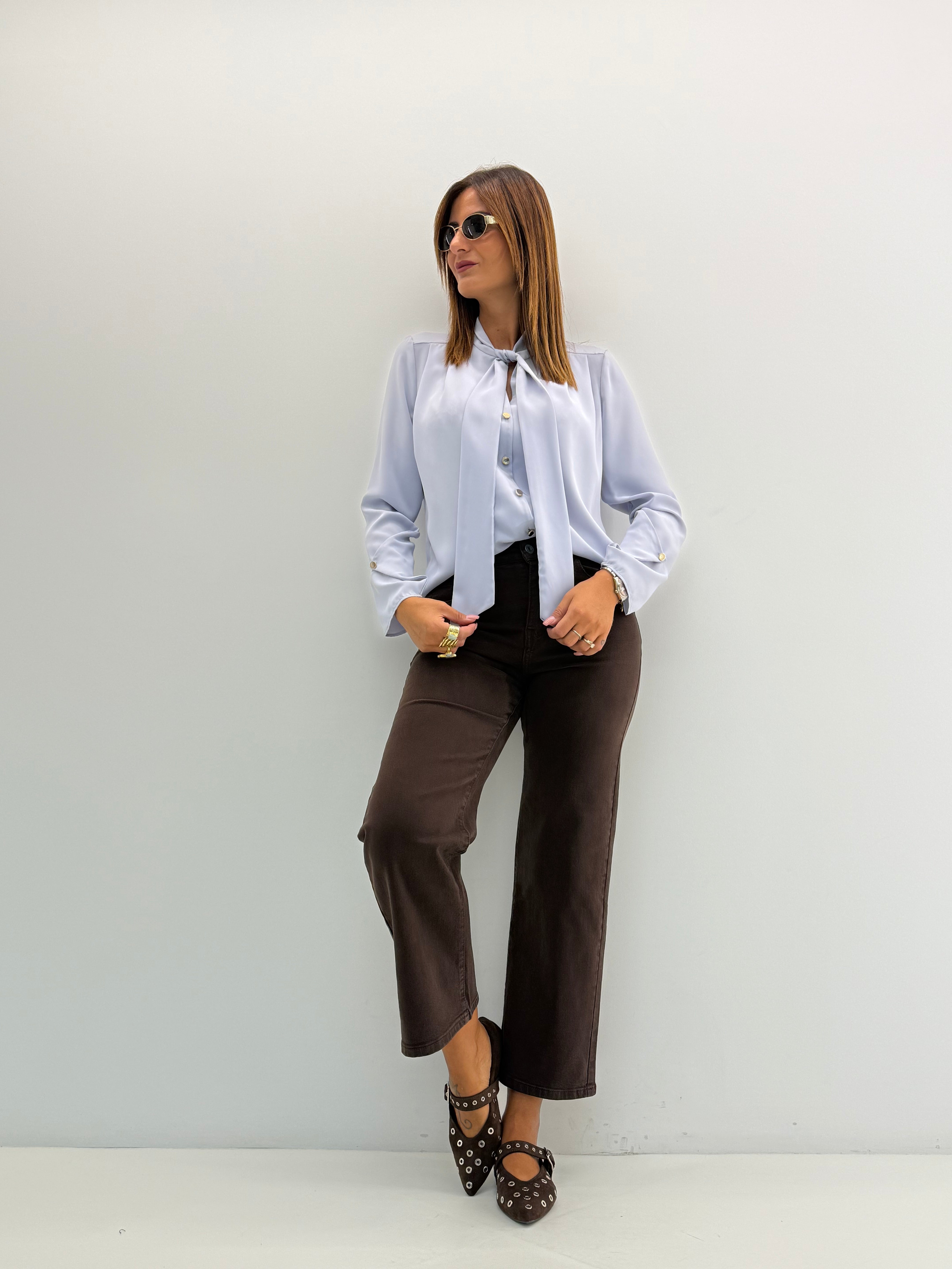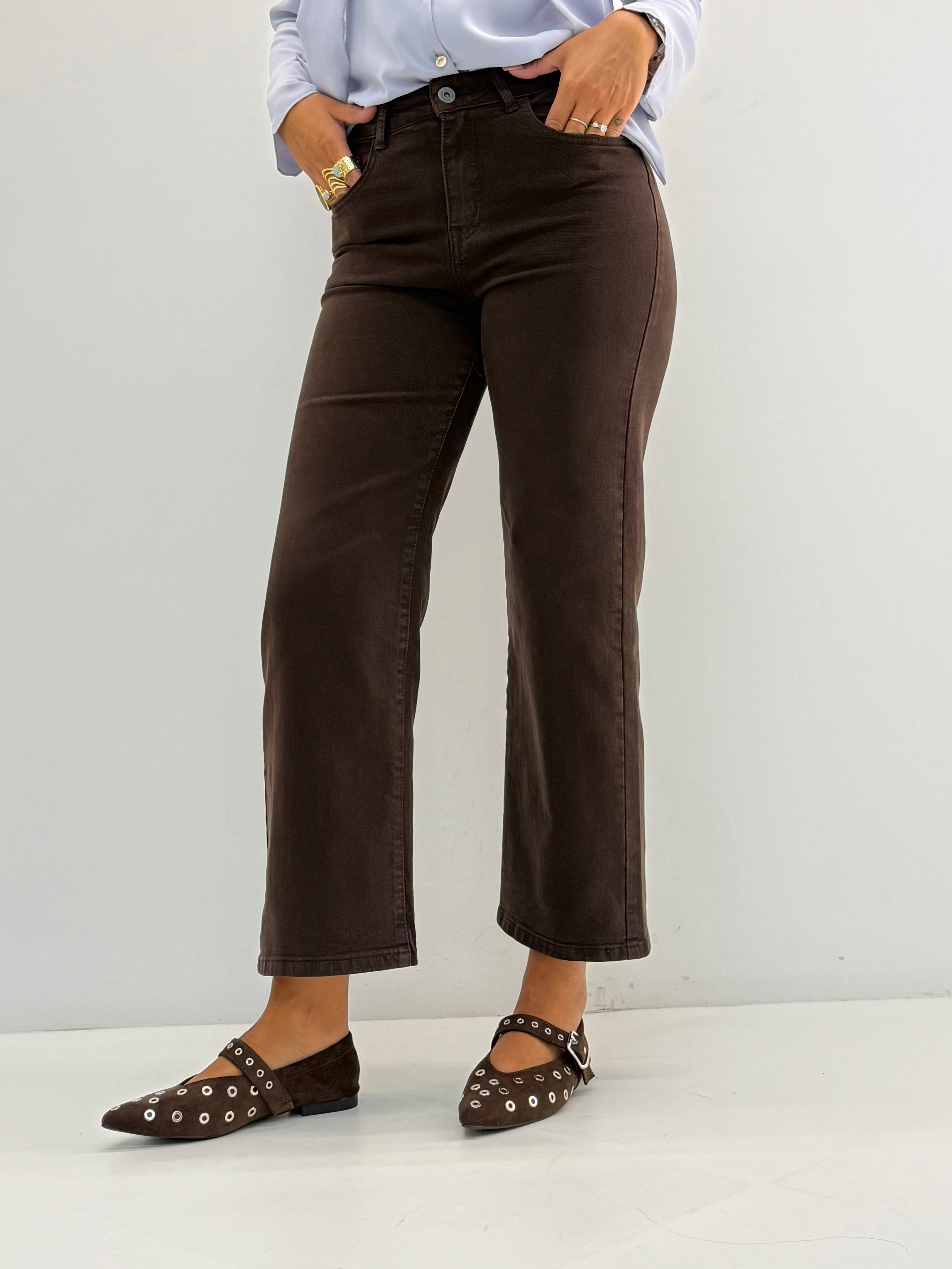 Jeans a vita alta, in cotone, modello dritto. Chiusura frontale con cerniera e bottone, tasche a lunetta laterali e 2 tasche dietro. Vestibilità a taglie