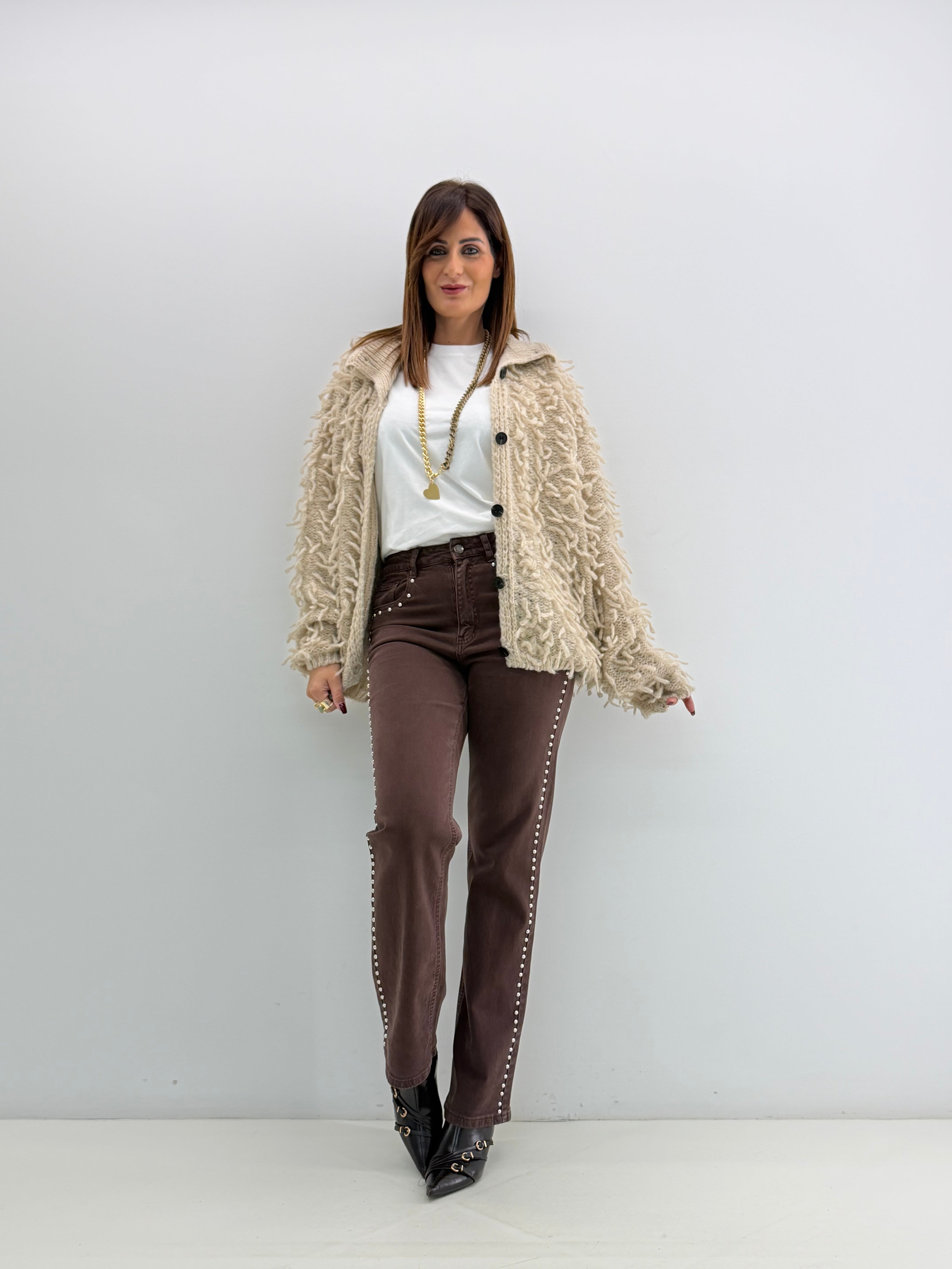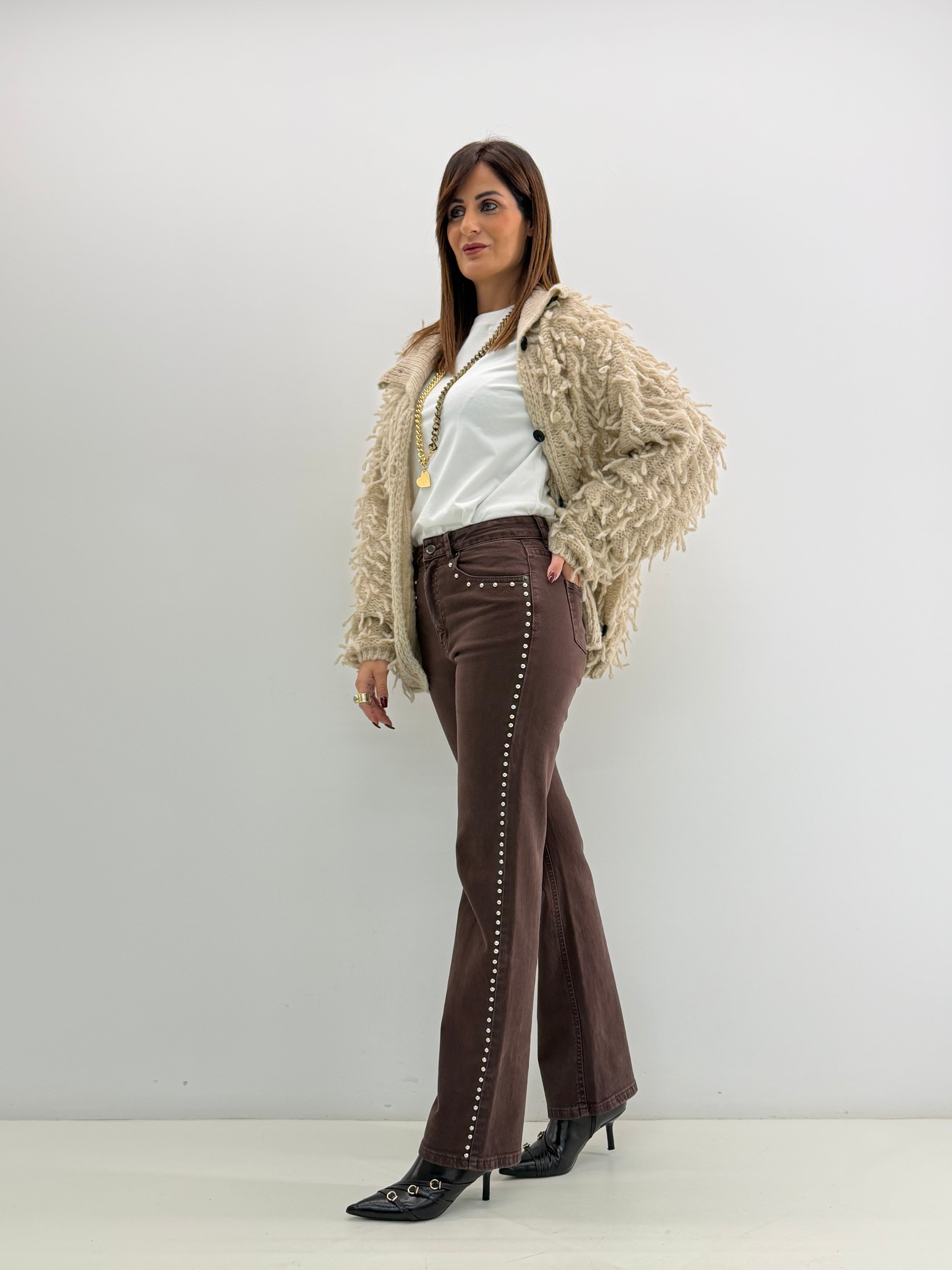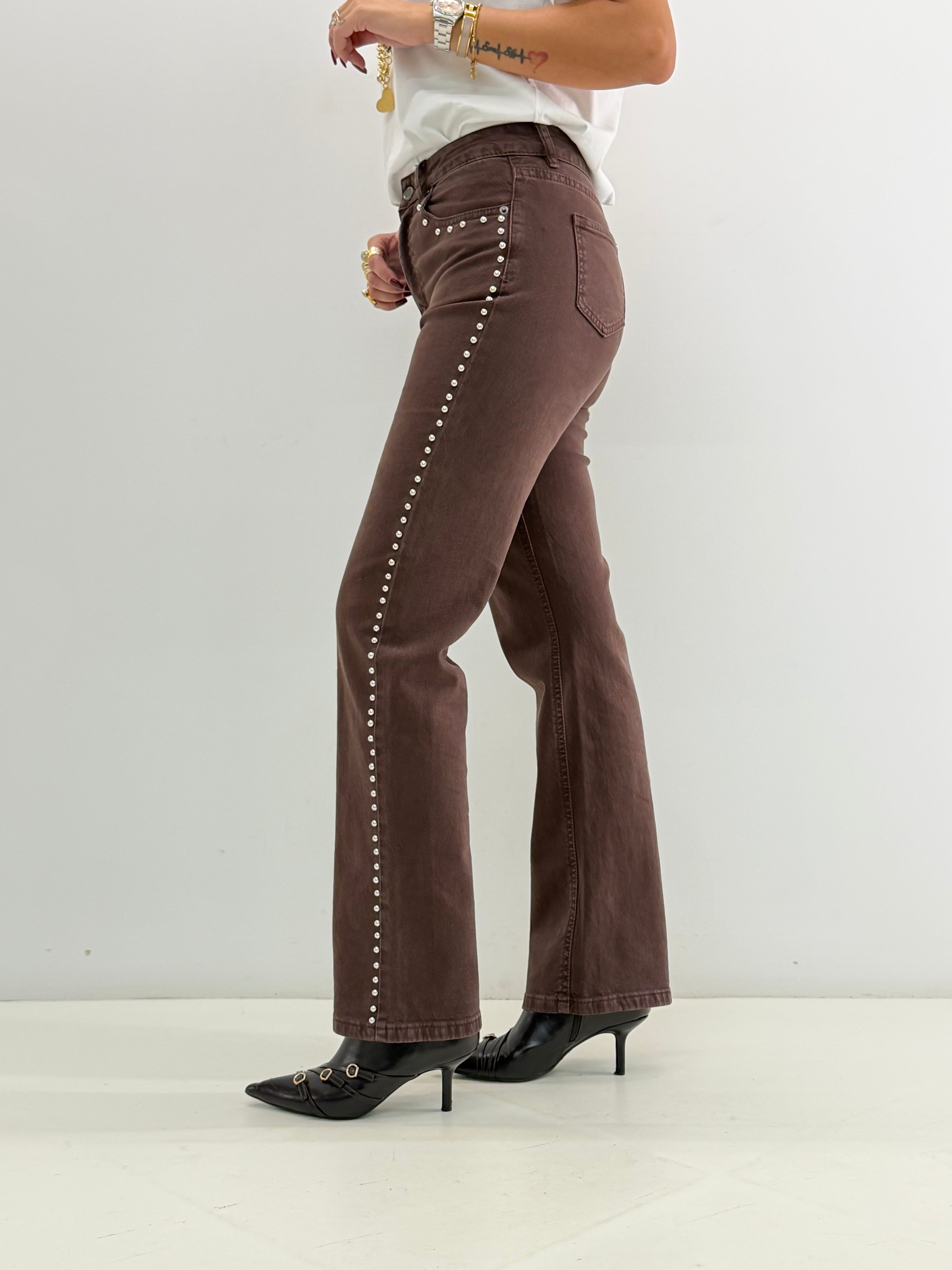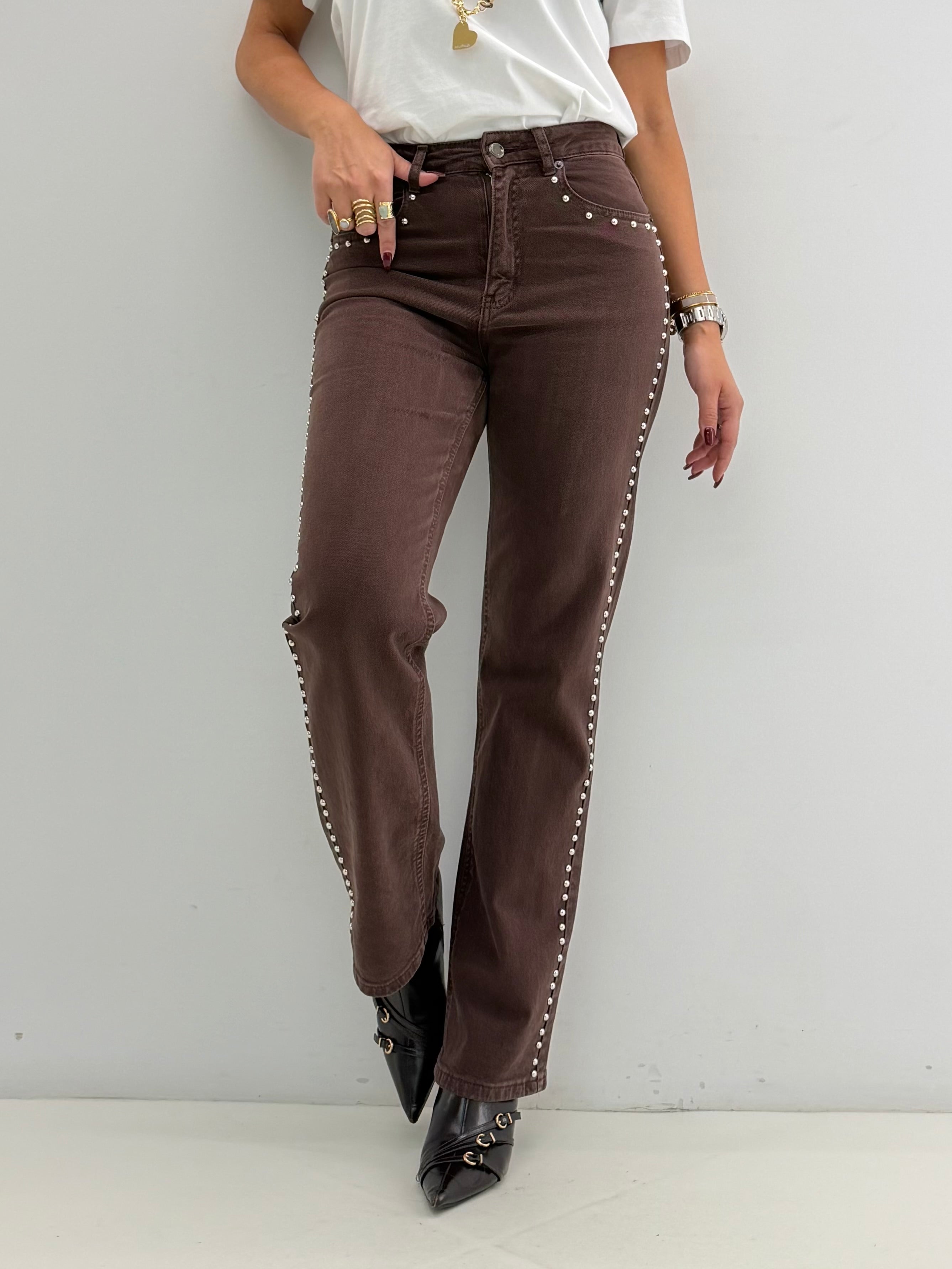 Jeans a vita alta, in cotone, modello regular. Chiusura frontale con cerniera e bottone, tasche davanti, borchiette laterali.