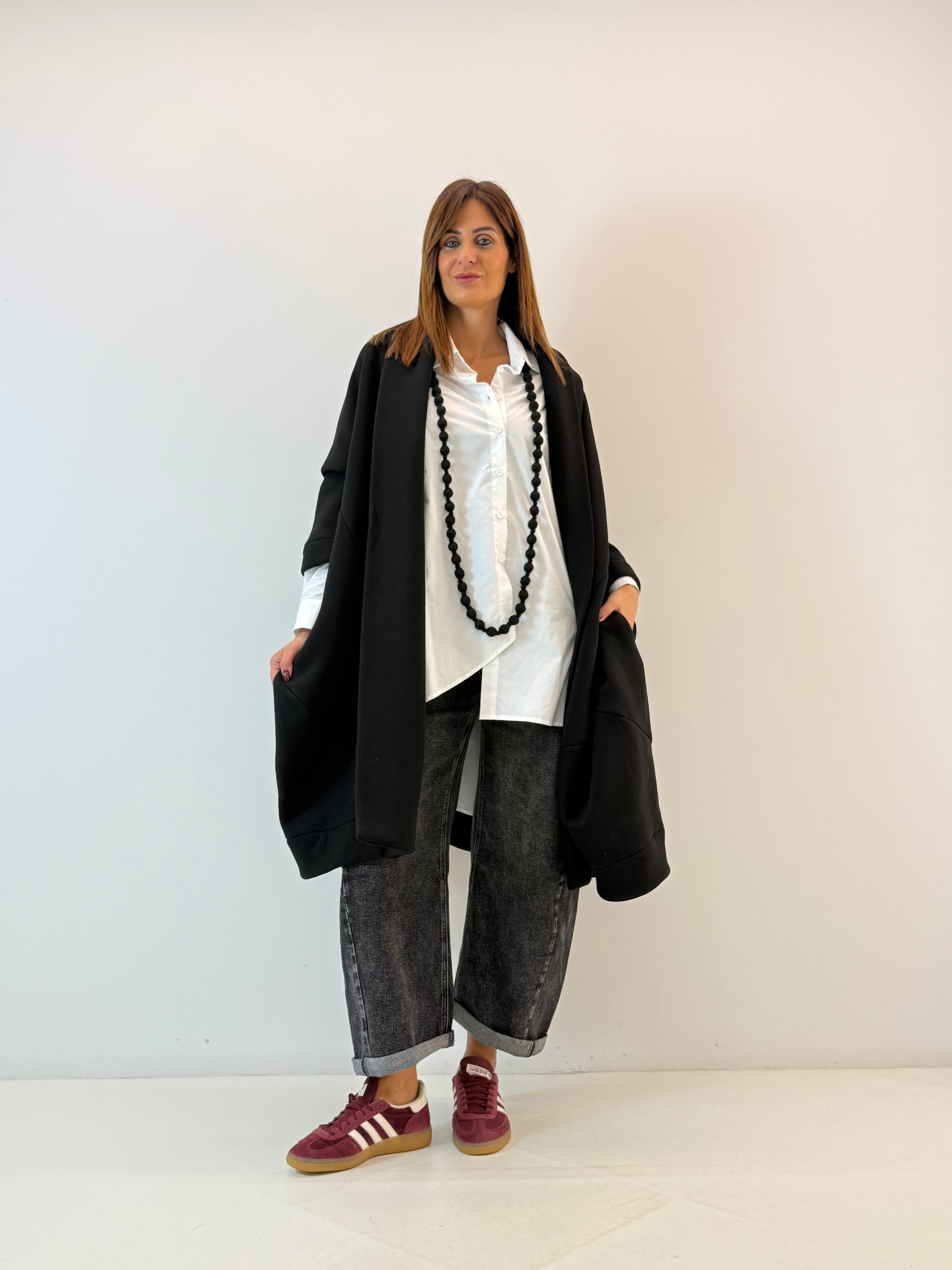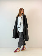 la modella in foto è alta 171 cm veste una 42 e indossa la tg S