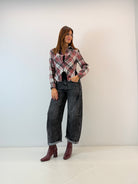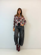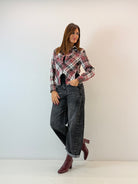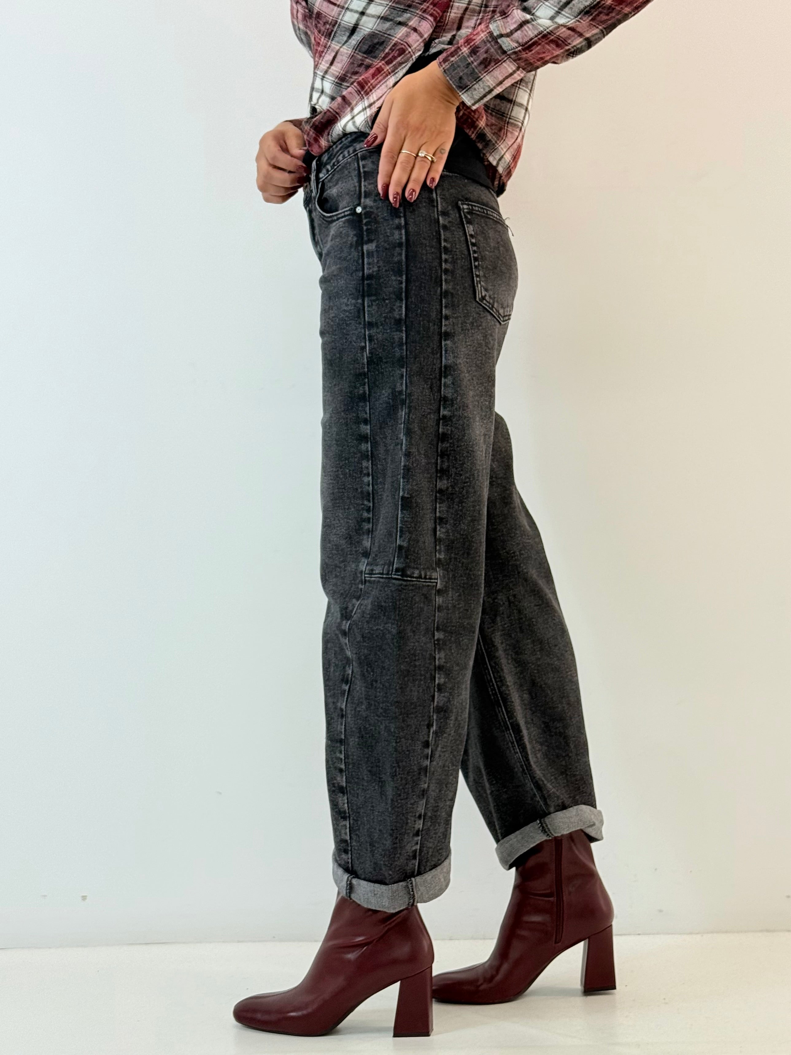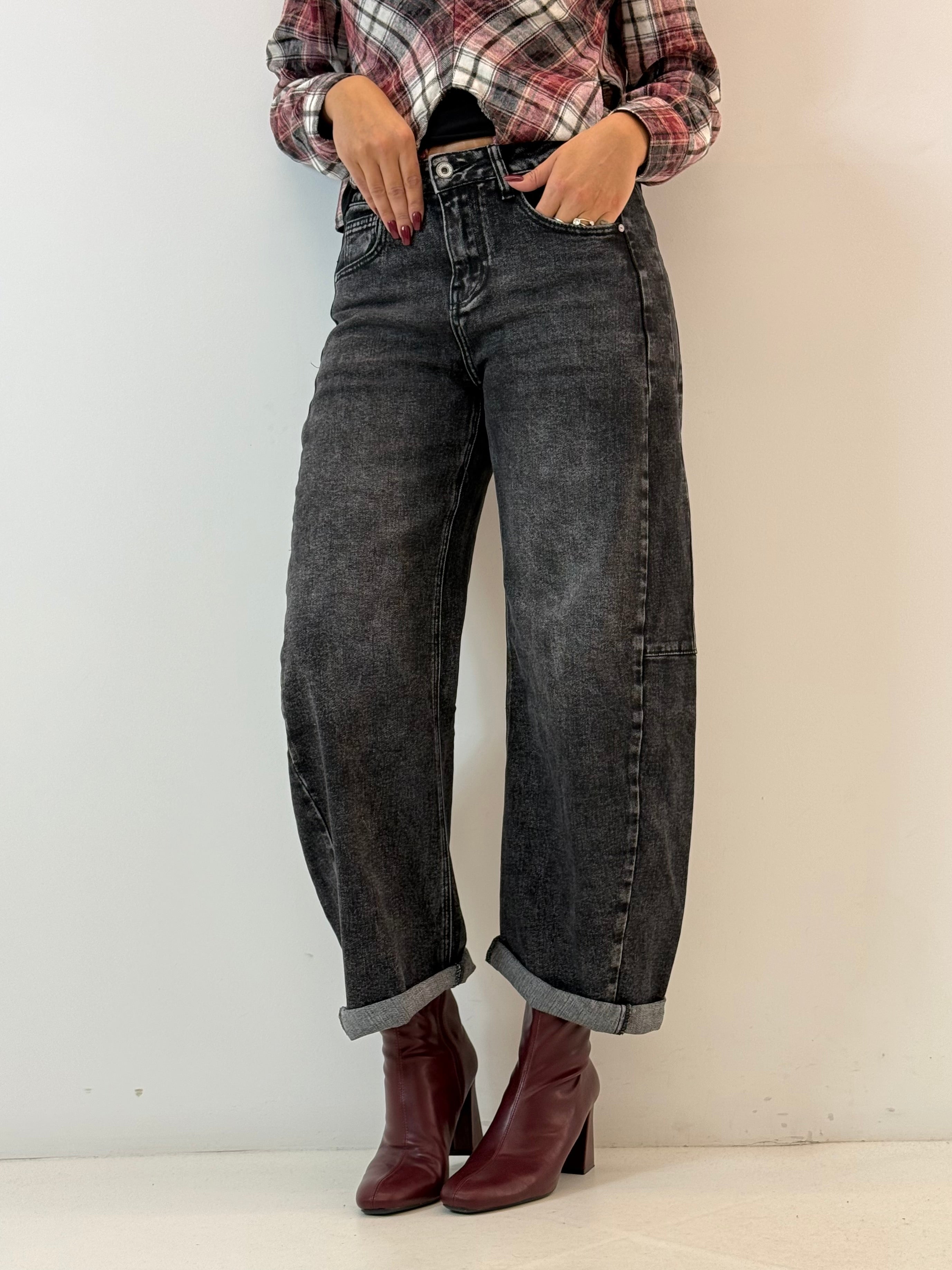 Jeans a vita alta, in cotone, modello baggy. Chiusura frontale con cerniera e bottone, modello 5 tasche. Vestibilità a taglie