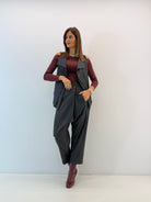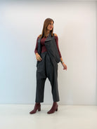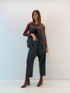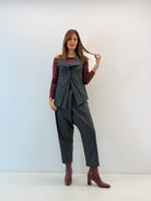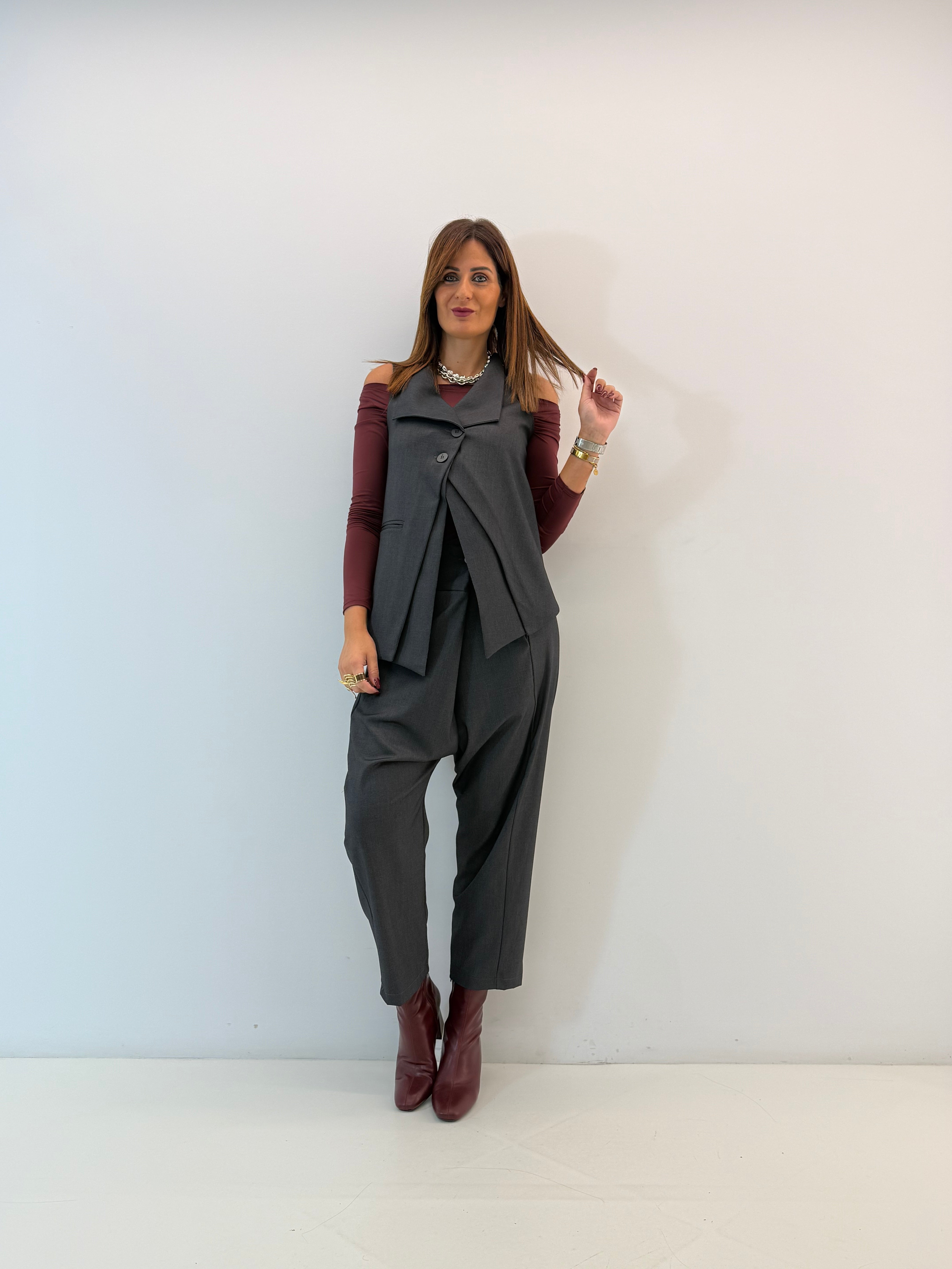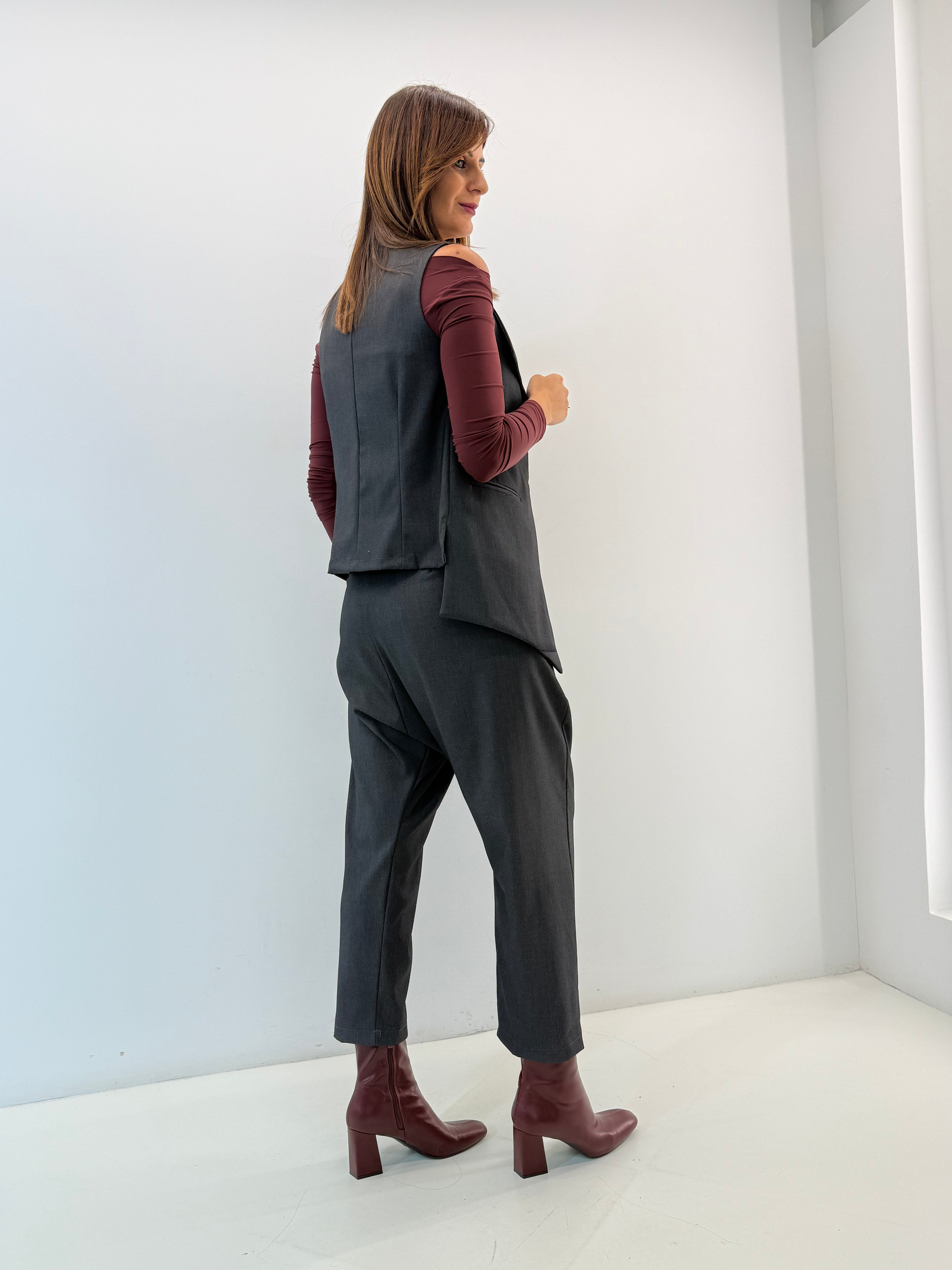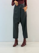 Pantalone, con cavallo morbido passanti per cintura, chiusura con bottone interno ed esterno, piega sul davanti. Ristretto alla caviglia. Vestibilità a taglie.