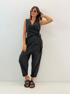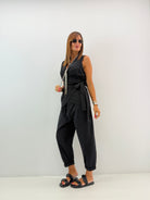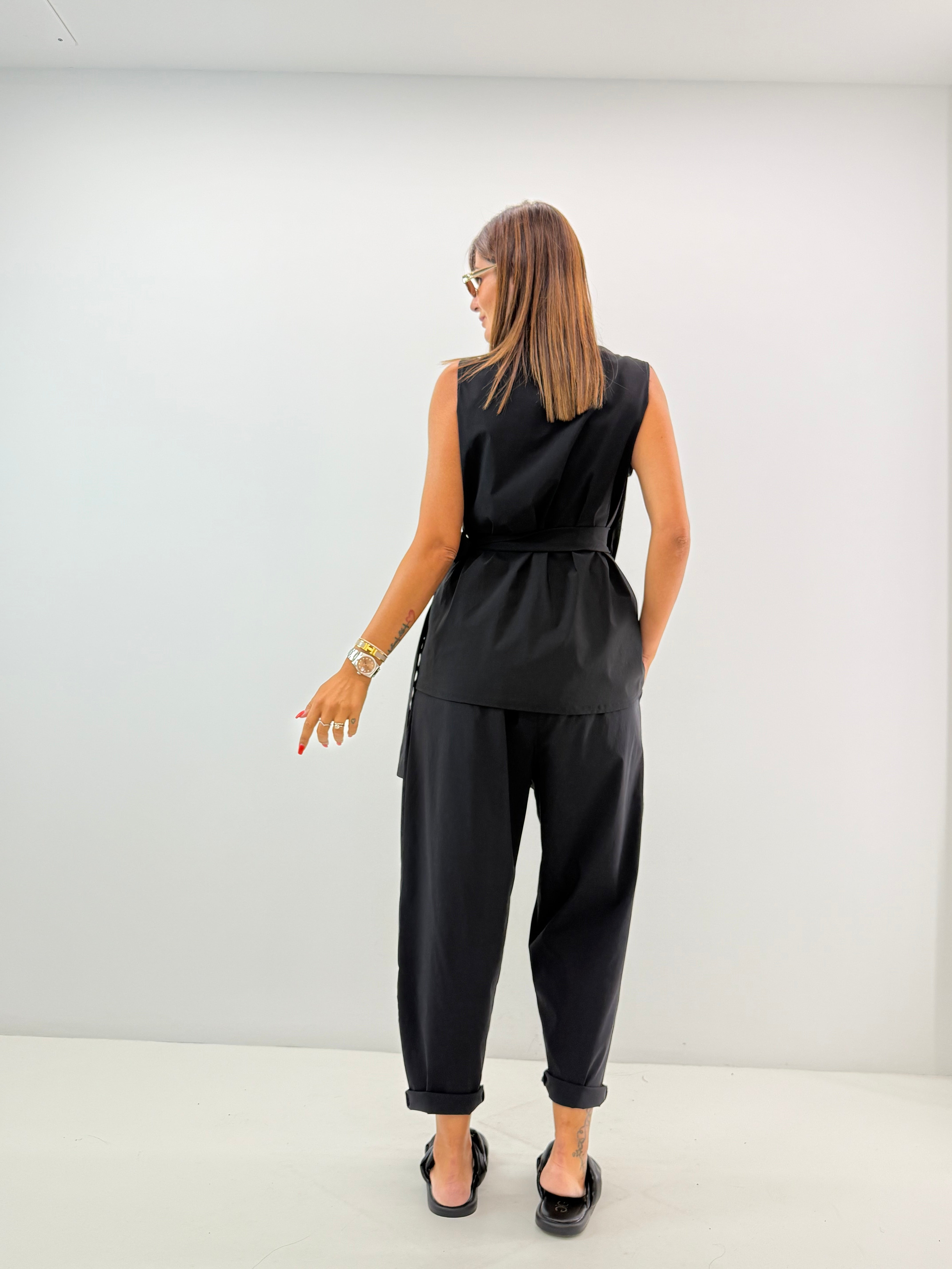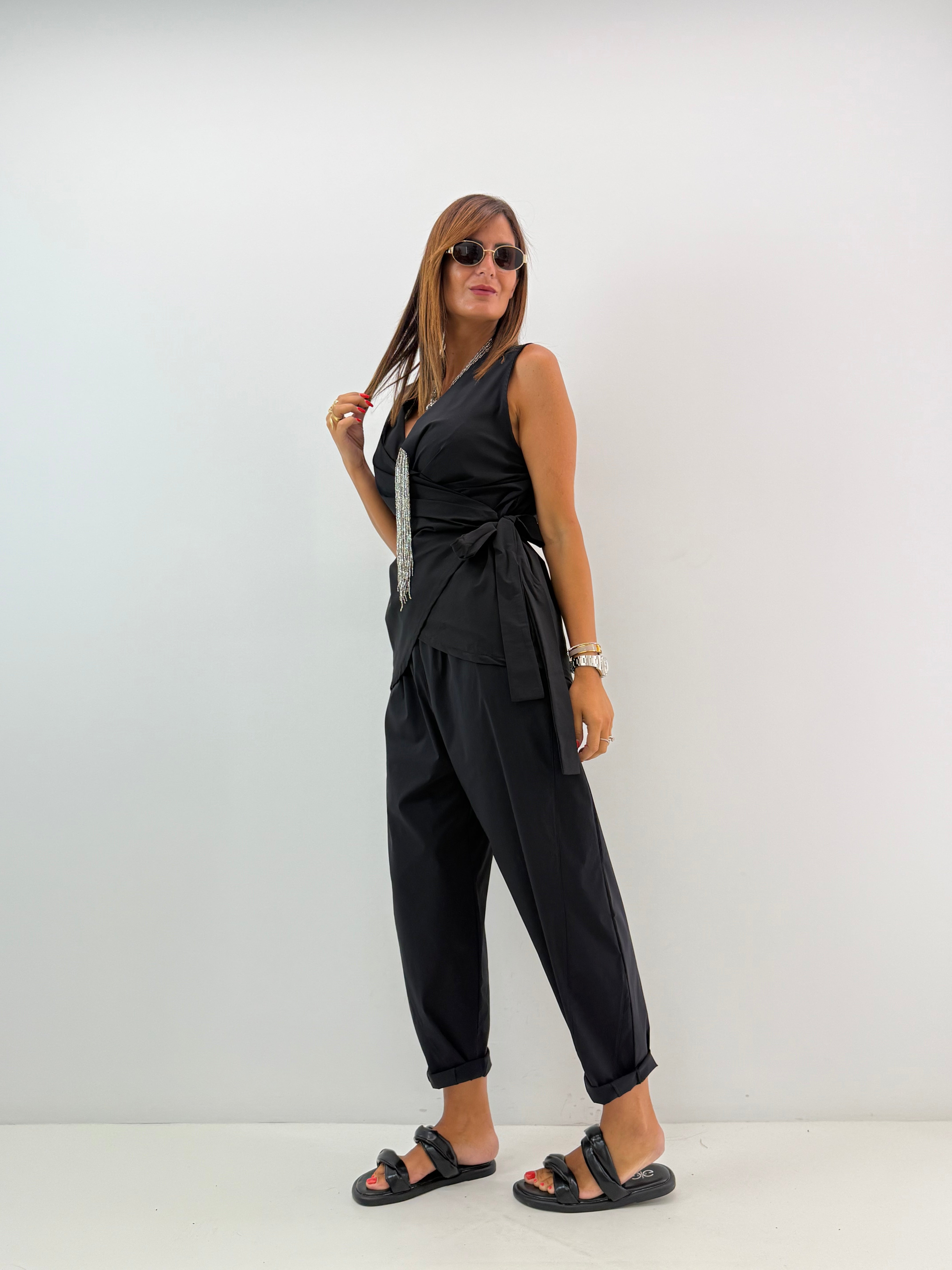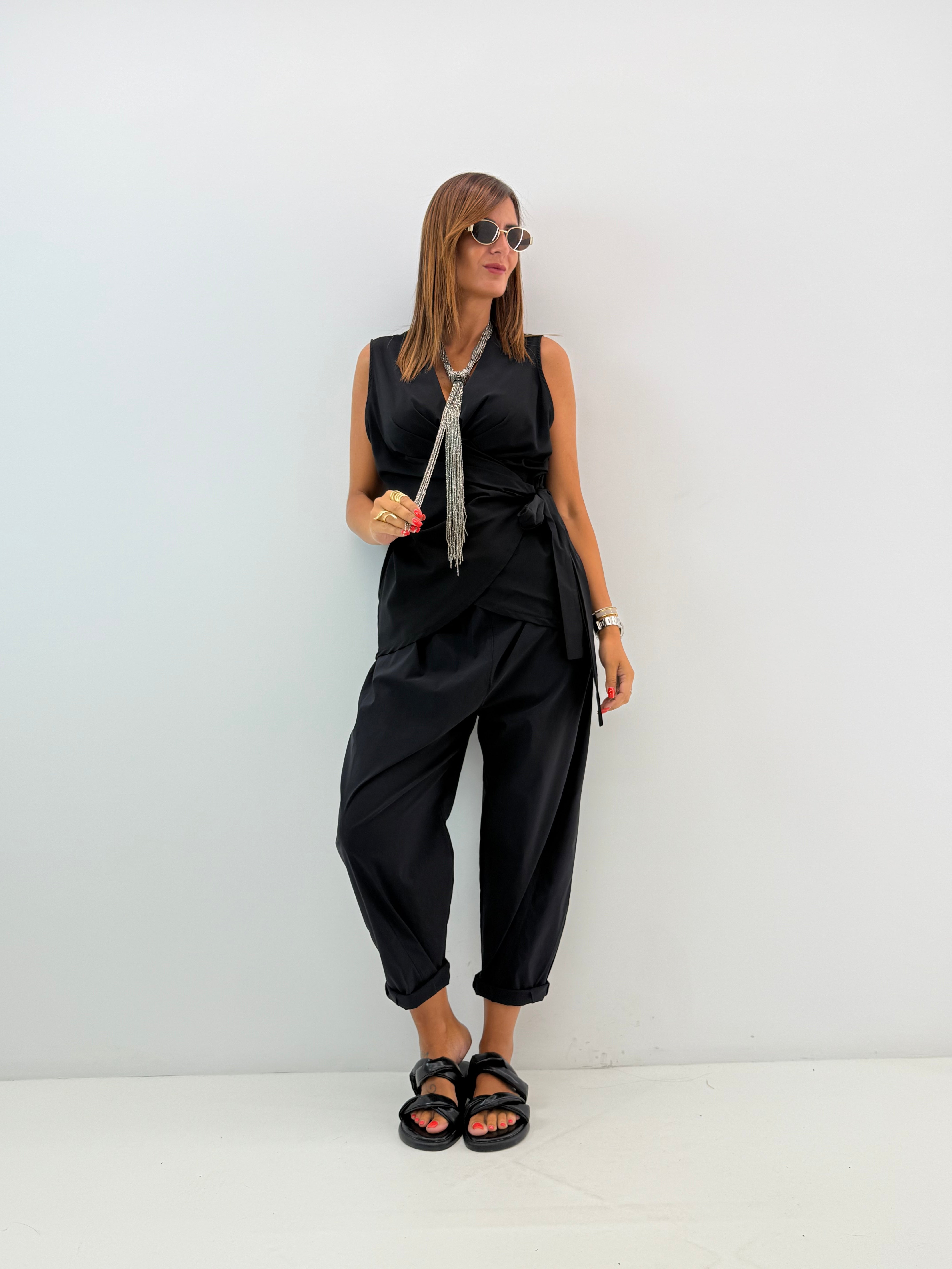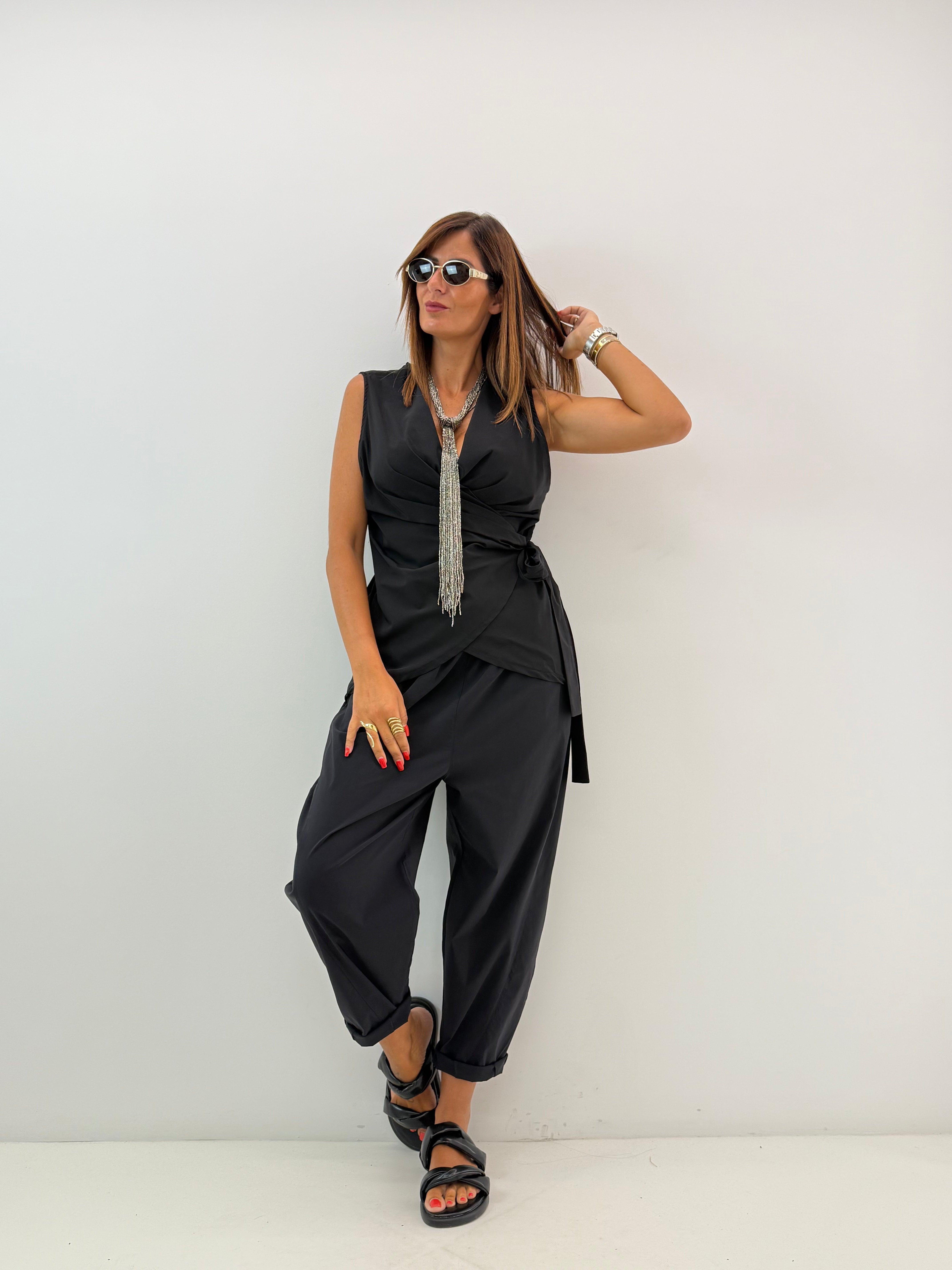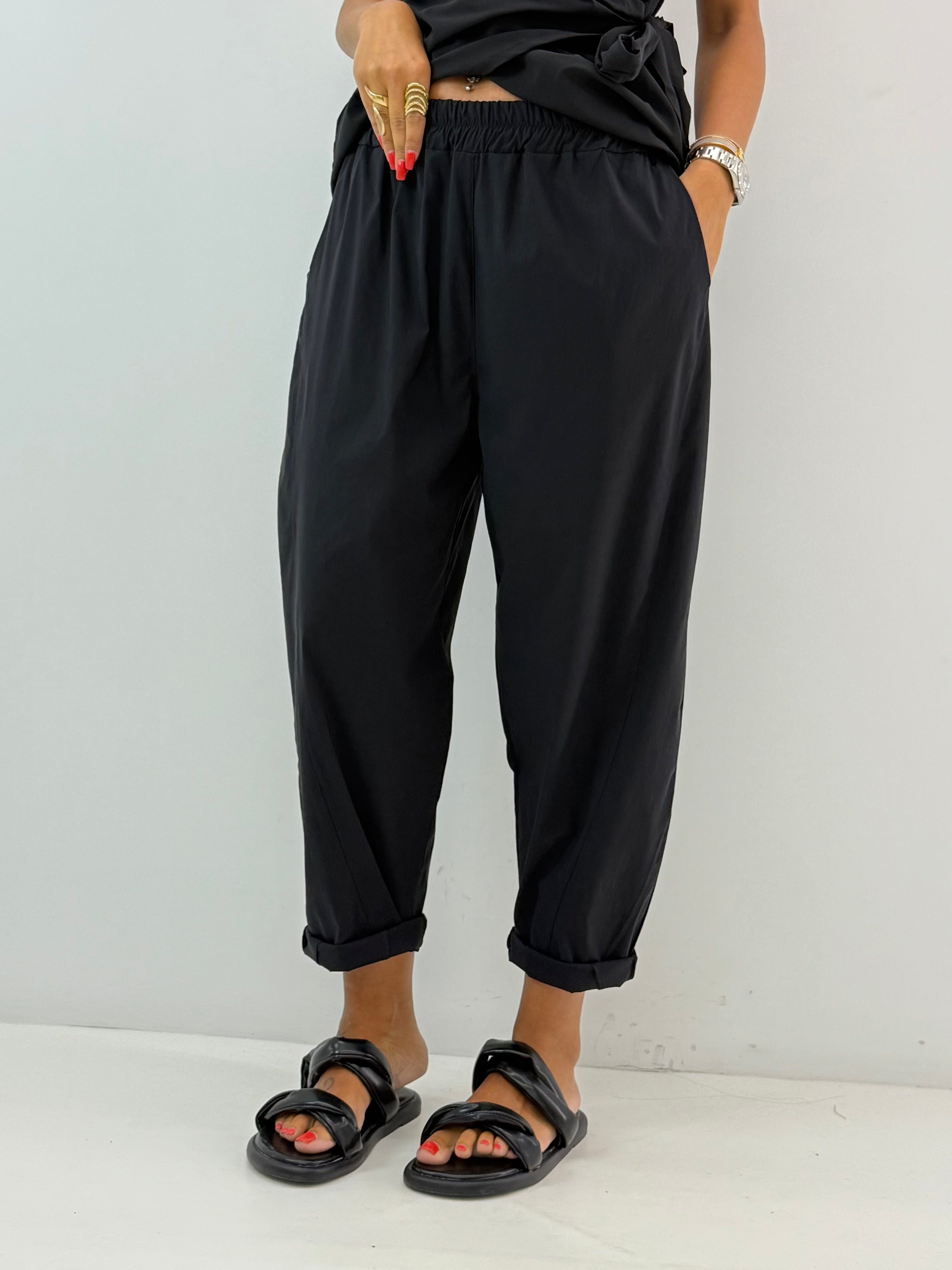 Pantalone in misto viscosa, modello baggy, fascia elastica in vita, tasche laterali a lunetta. Orlo leggermente ristretto alla caviglia. Vestibilità comoda.