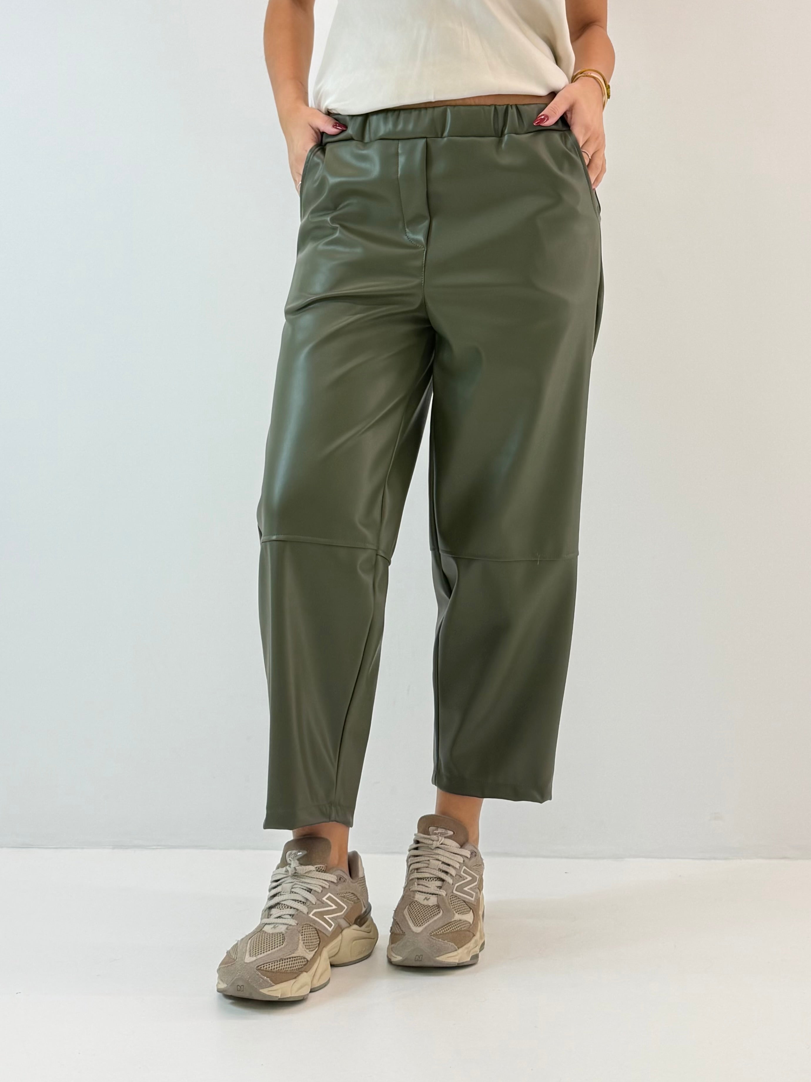 Pantalone in ecopelle. Tasche laterali a lunetta, senza chiusura, elastico in vita, cuciture a vista sul ginocchio.