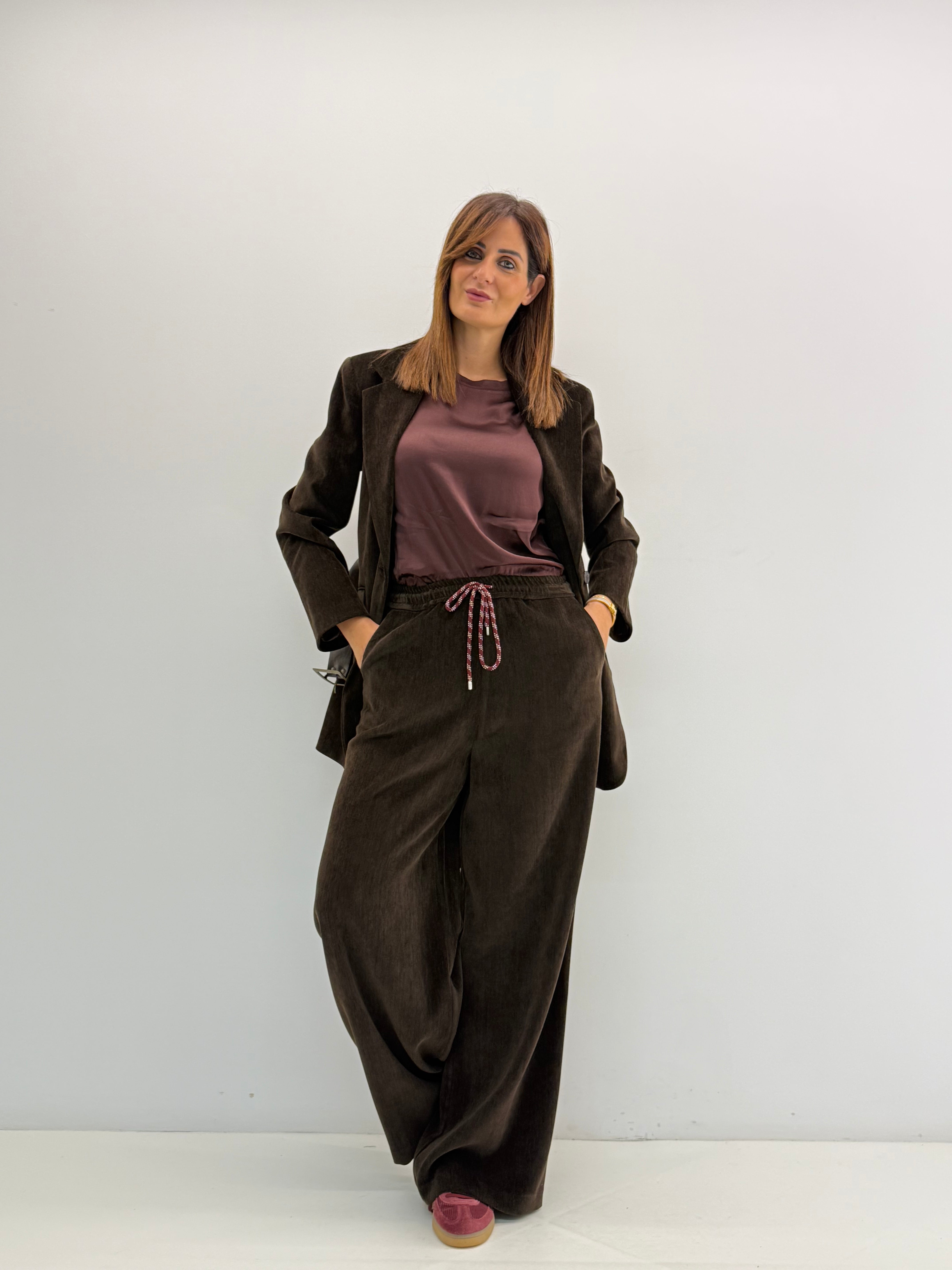 Pantalone in ciniglia, elastico in vita e coulisse regolabile, tasche laterali a lunetta, modello a palazzo. Vestibilità a taglie.