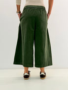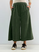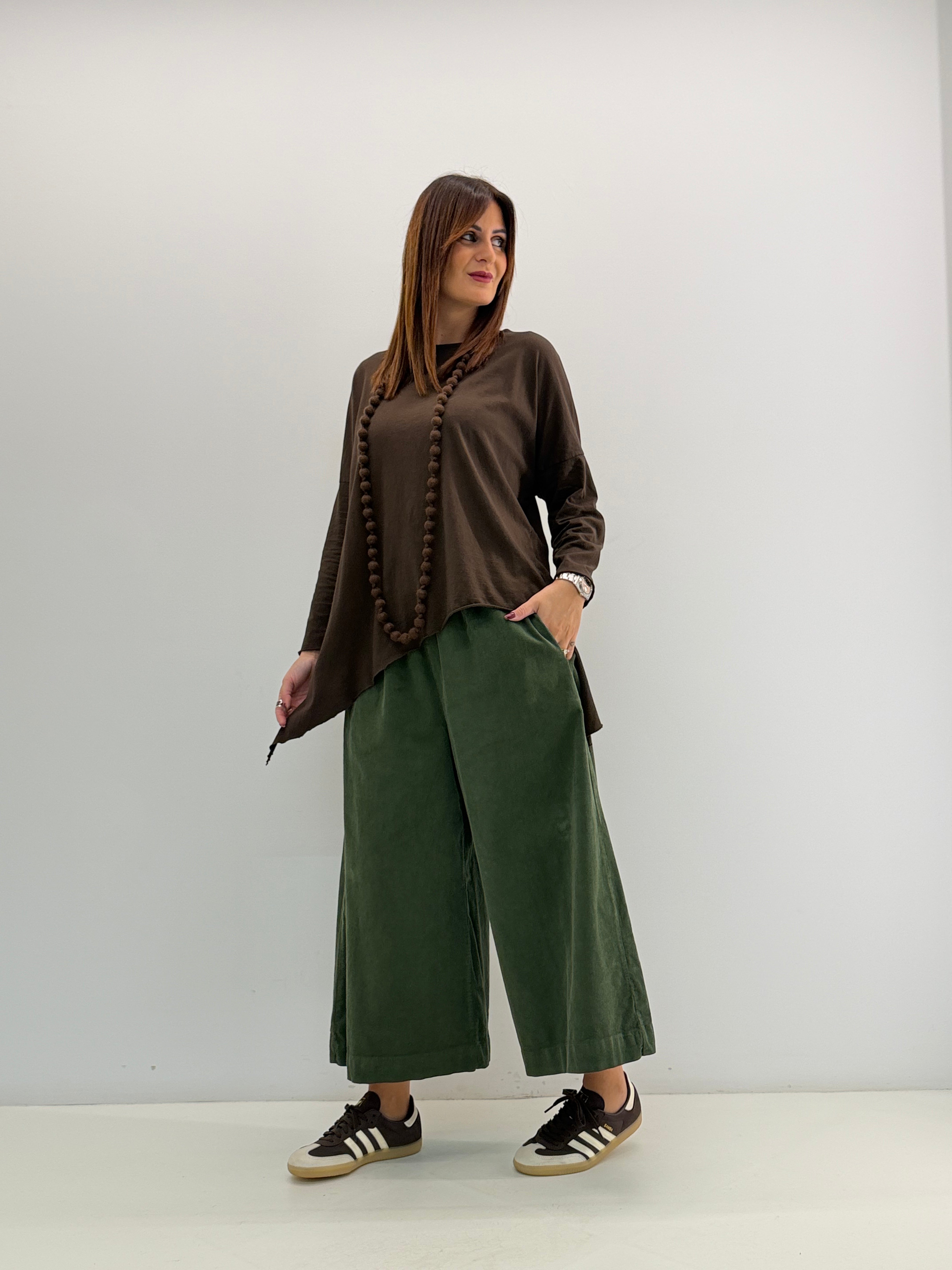 Pantalone effetto velluto. Fascia elasticizzata in vita. Tasche laterali a scomparsa. Modello a gamba larga.