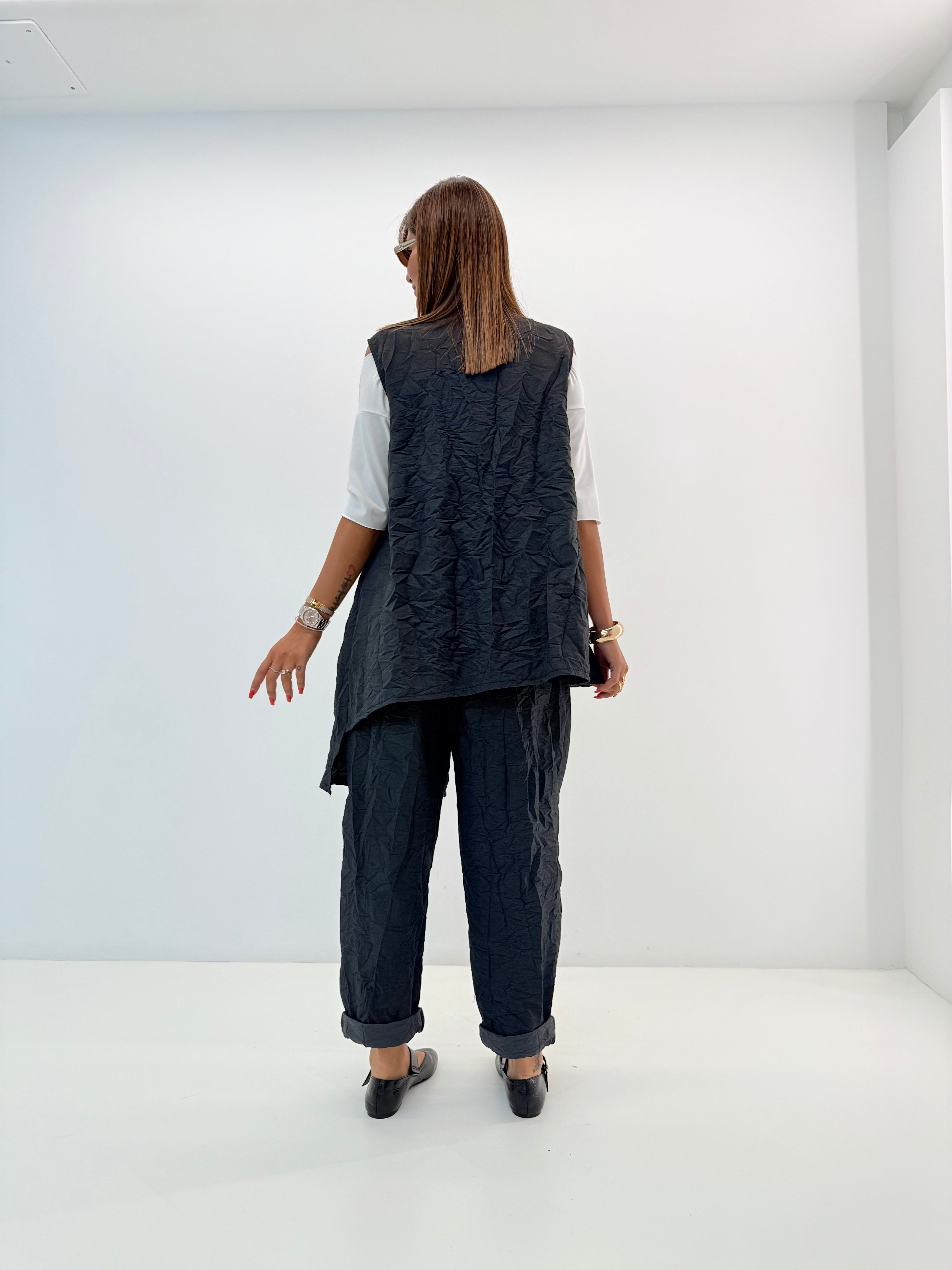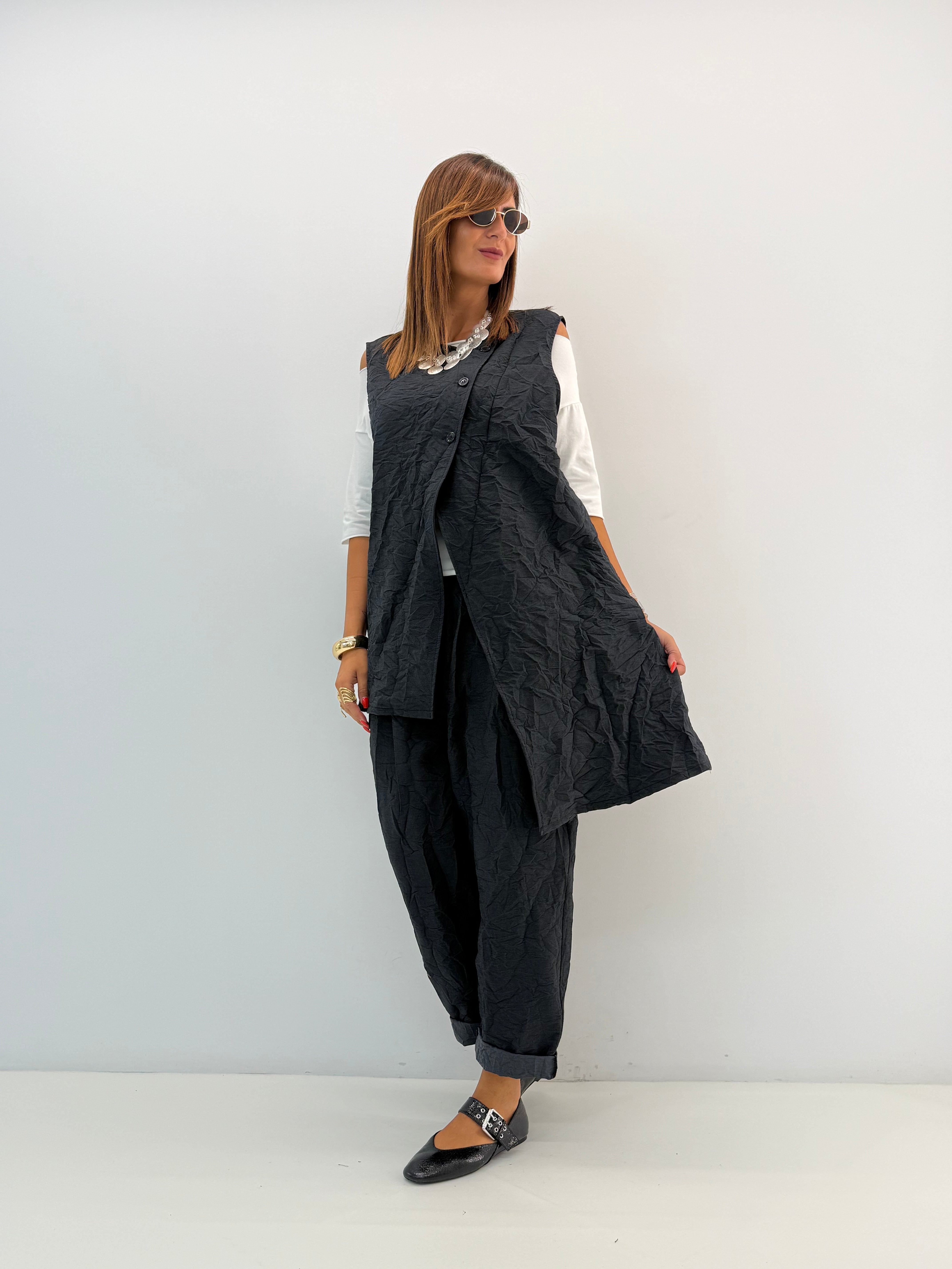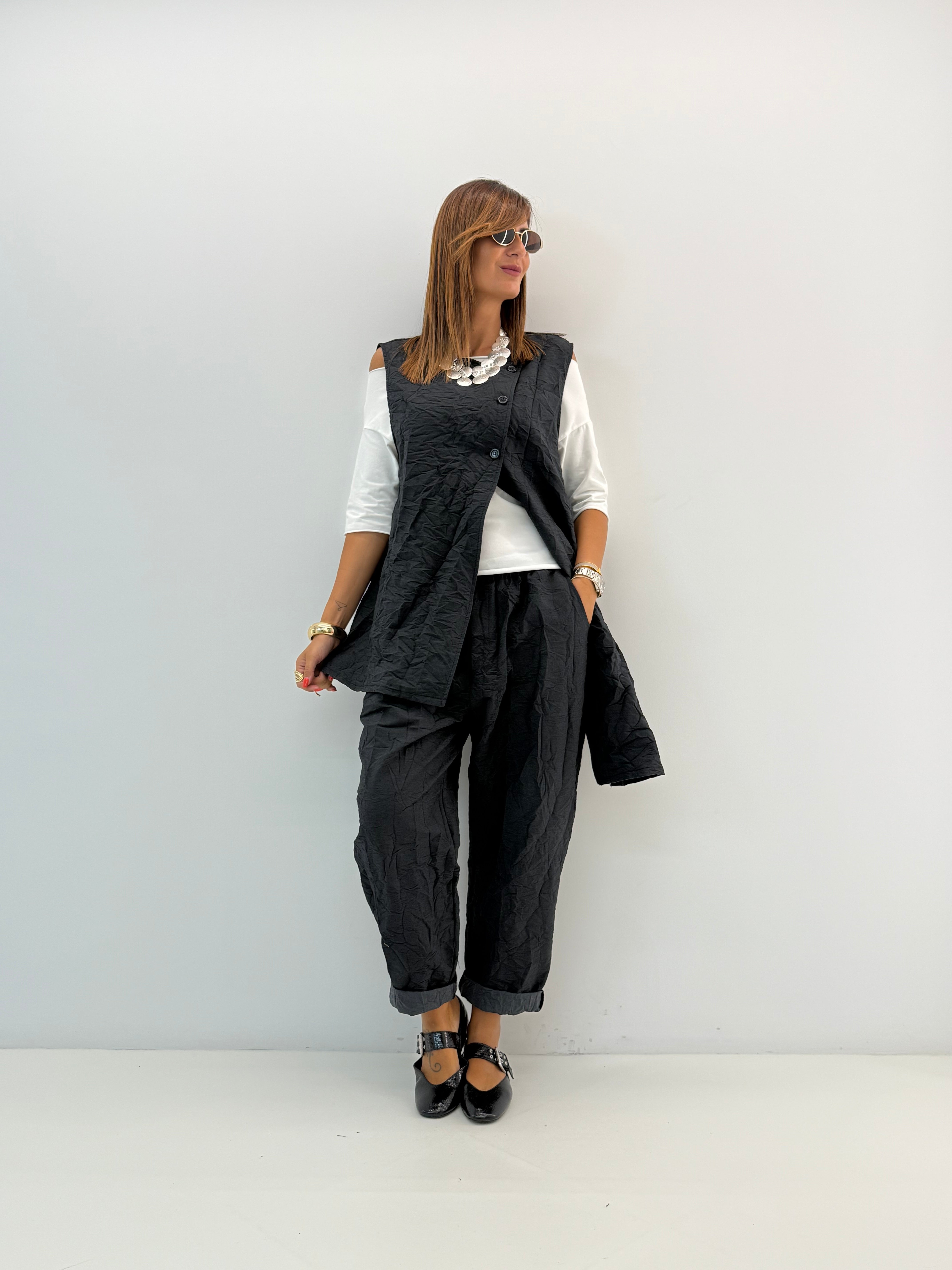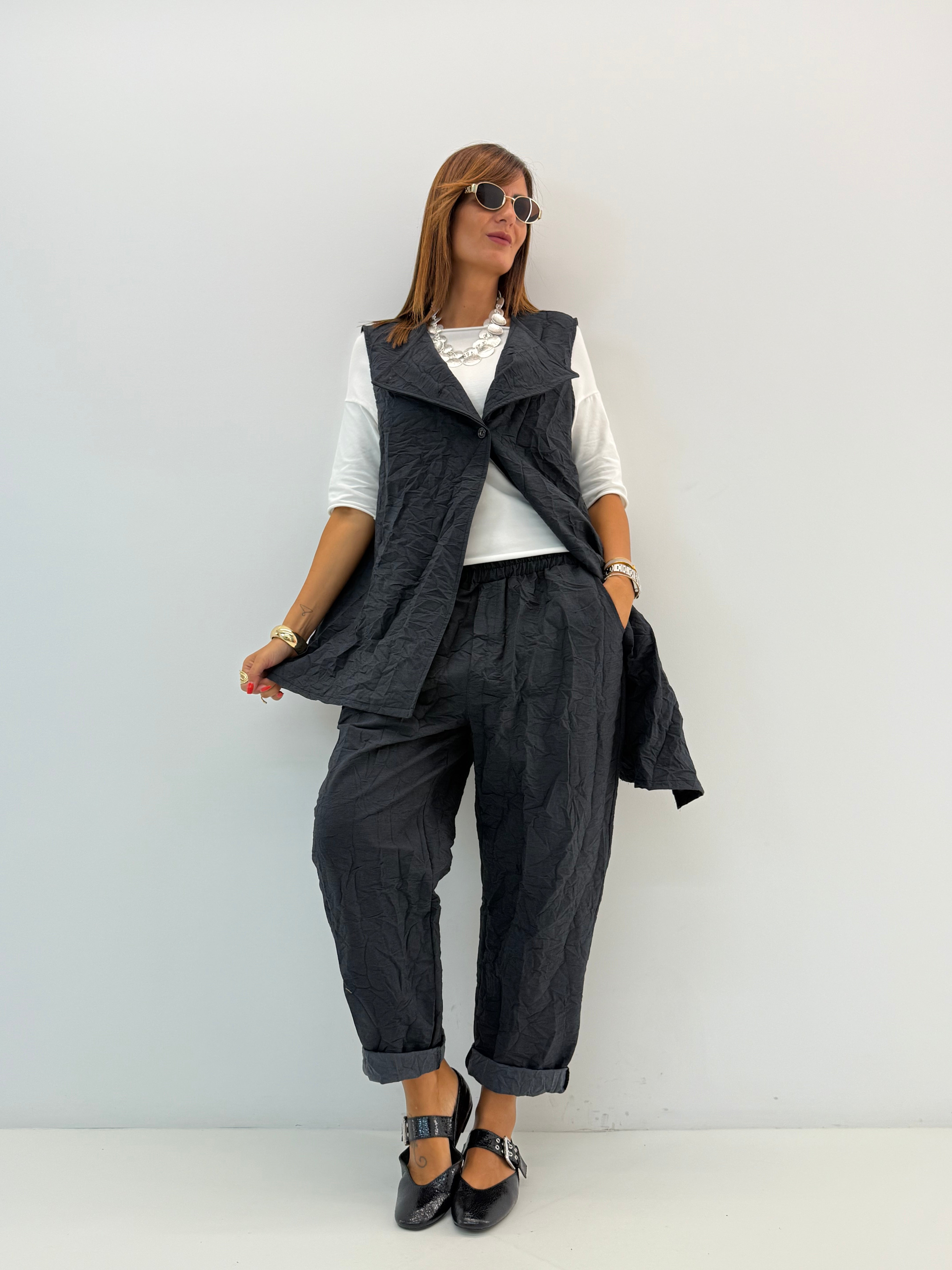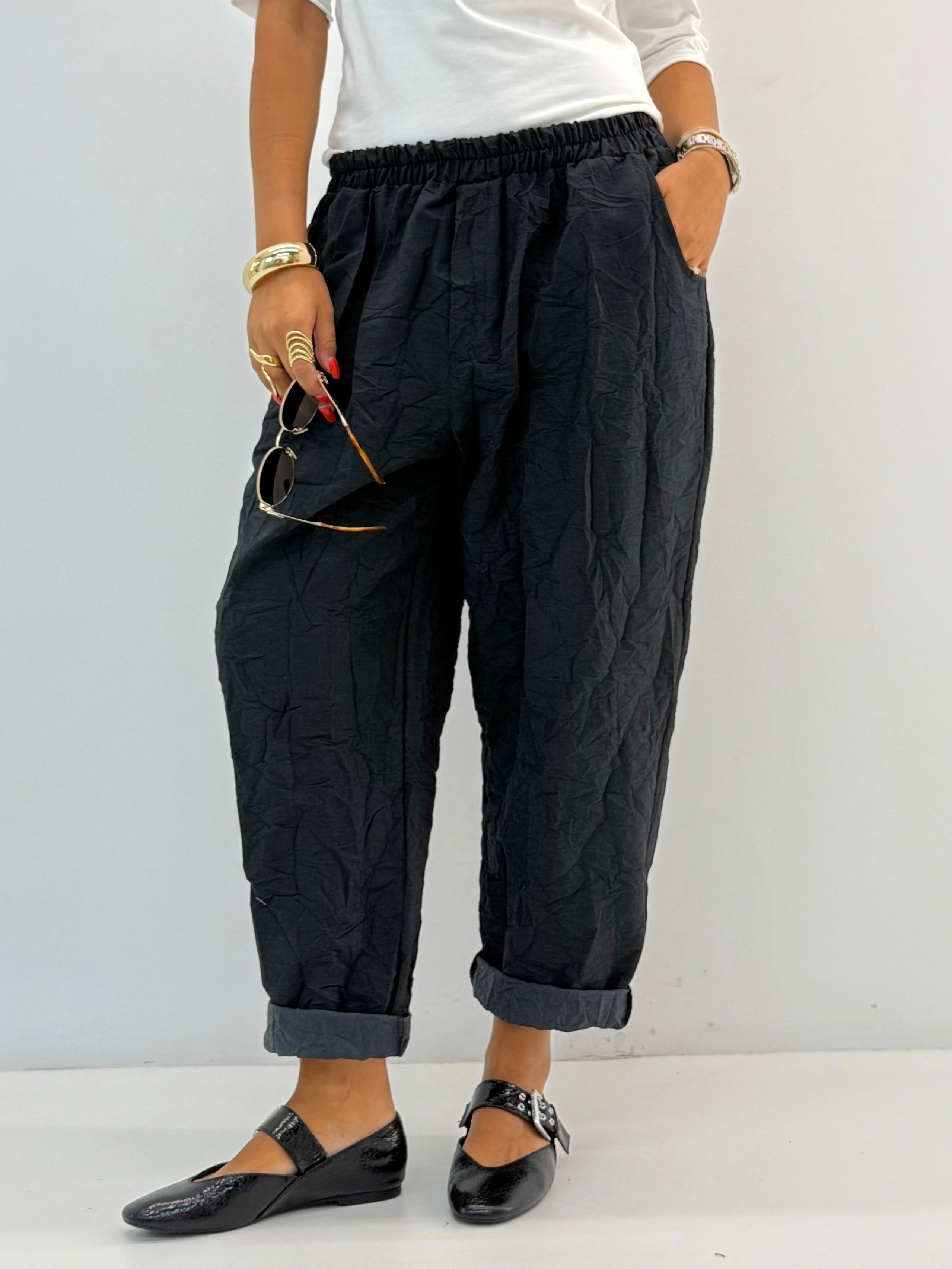 Pantalone in misto cotone, effetto stropicciato, modello baggy, fascia elastica in vita, tasche laterali a lunetta e tasche dietro. Orlo leggermente ristretto alla caviglia. Vestibilità comoda.
