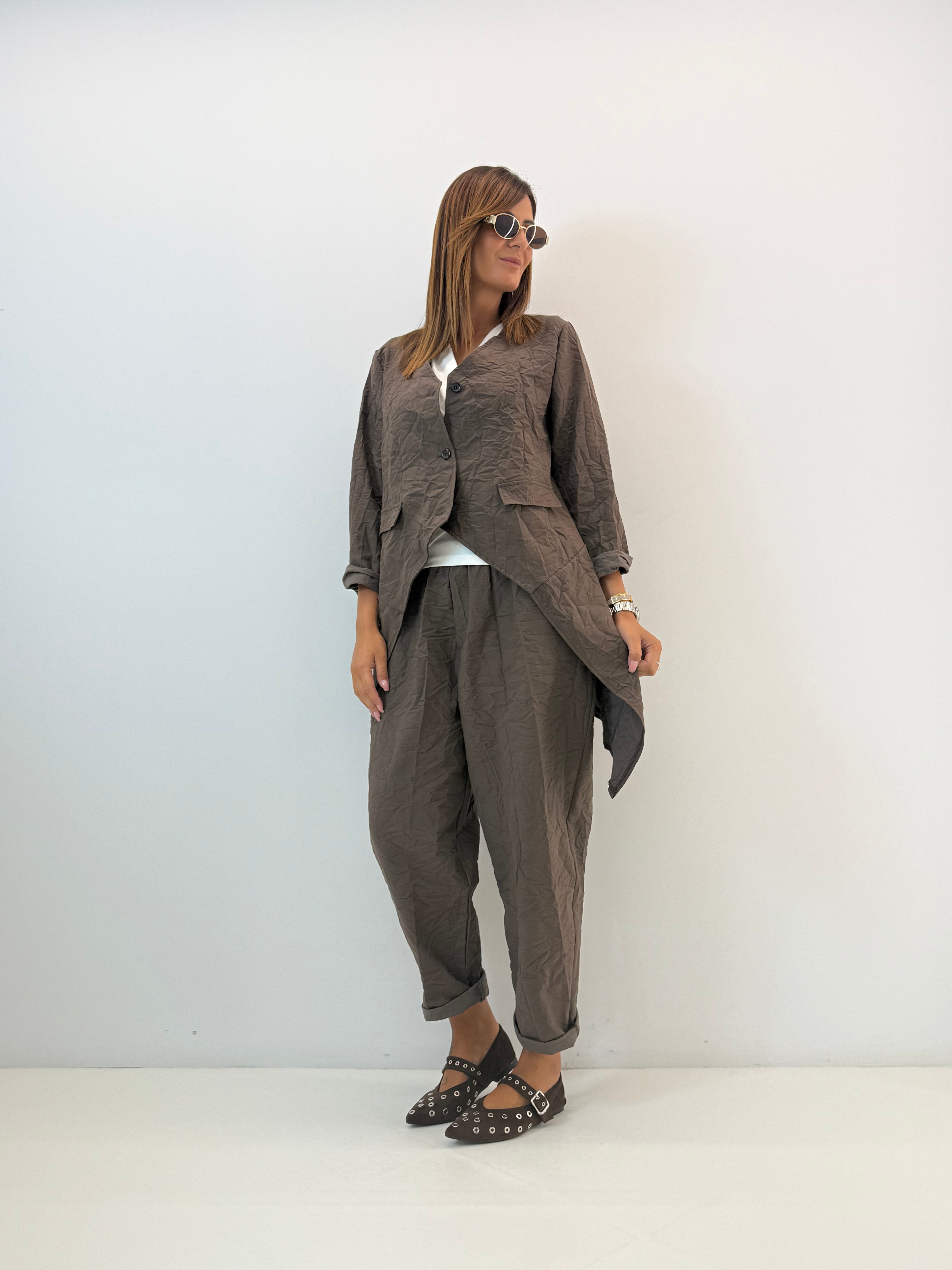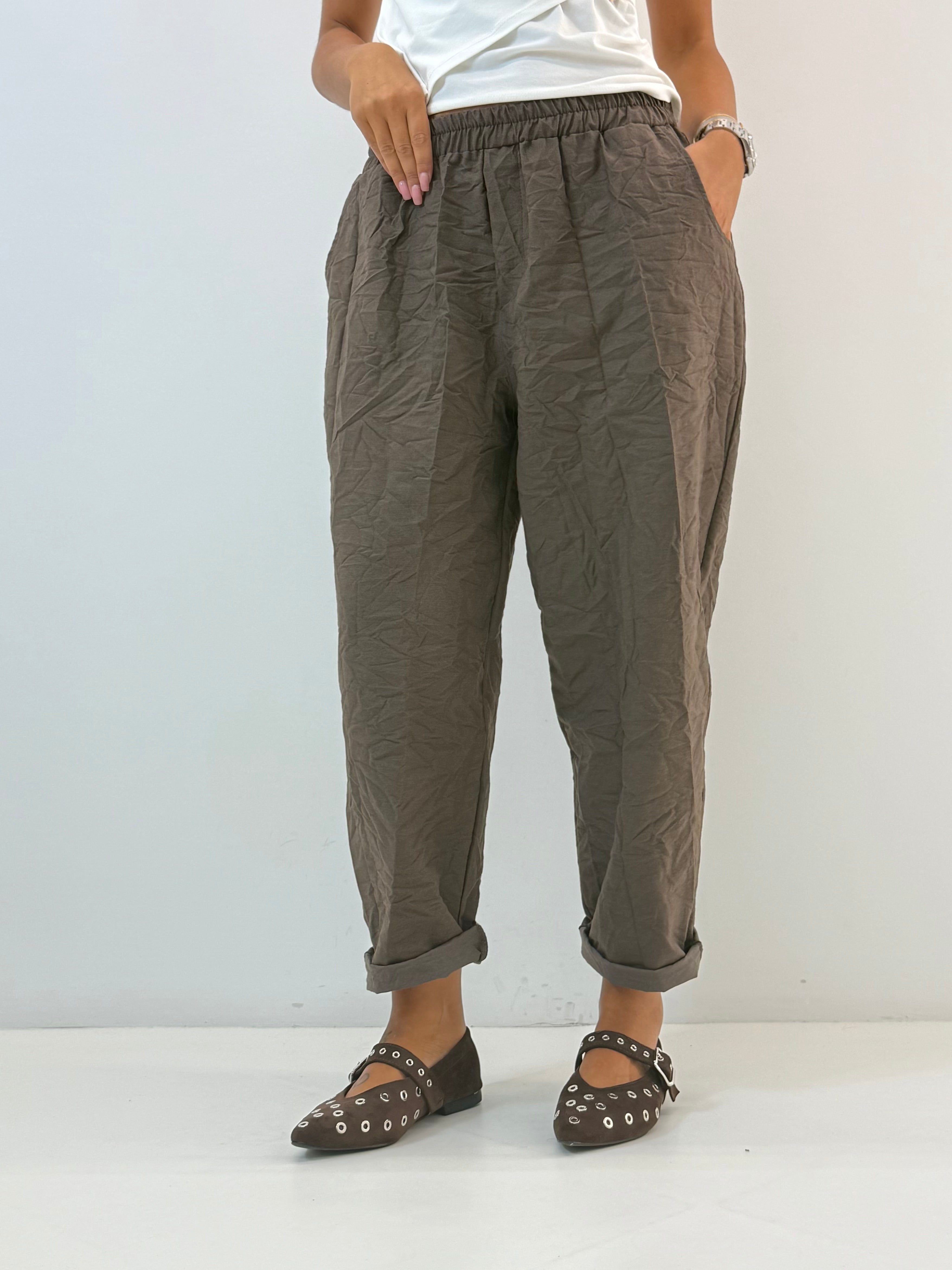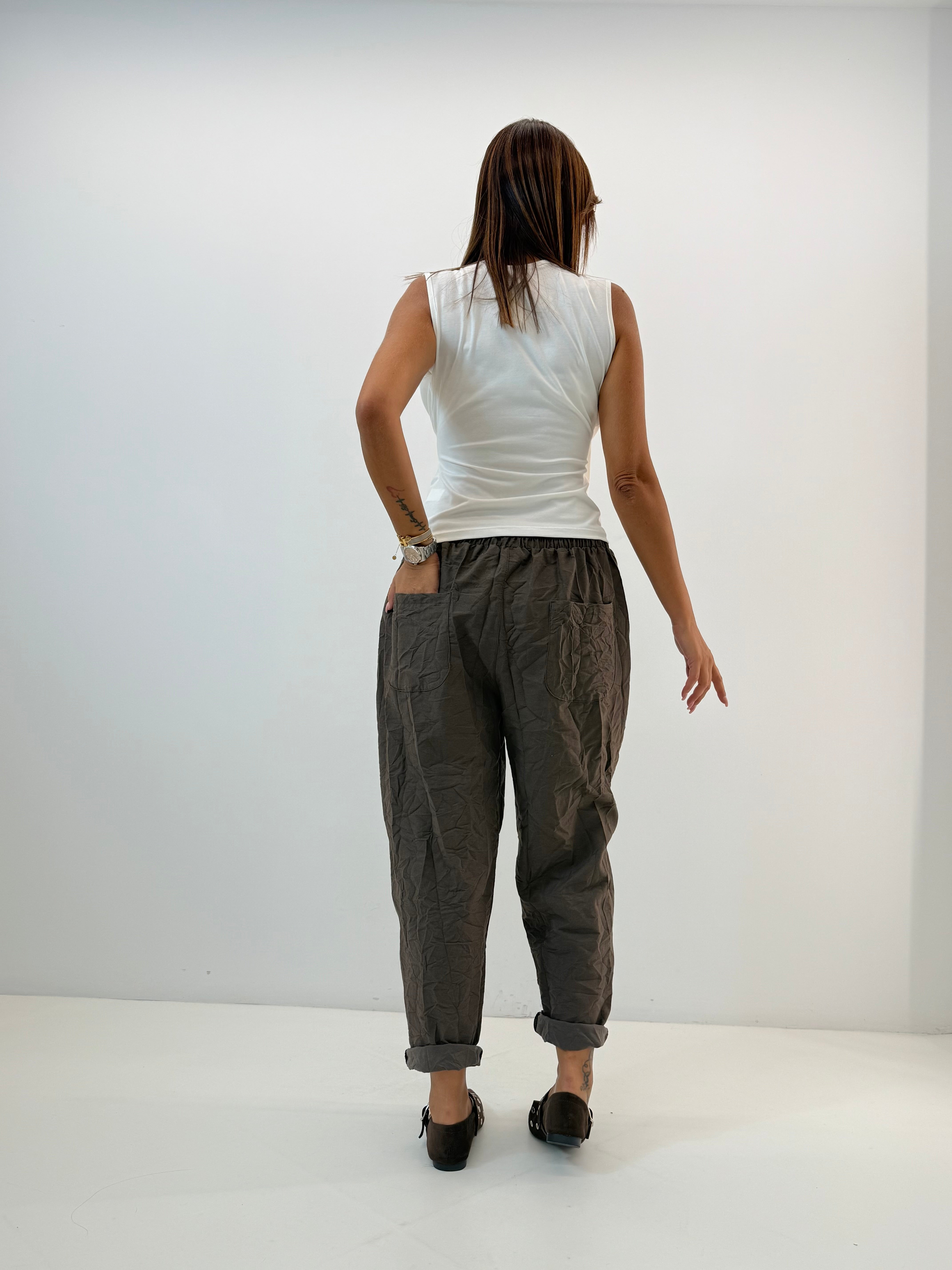 Pantalone in misto cotone, effetto stropicciato, modello baggy, fascia elastica in vita, tasche laterali a lunetta e tasche dietro. Orlo leggermente ristretto alla caviglia. Vestibilità comoda.