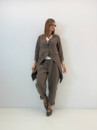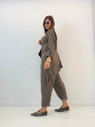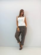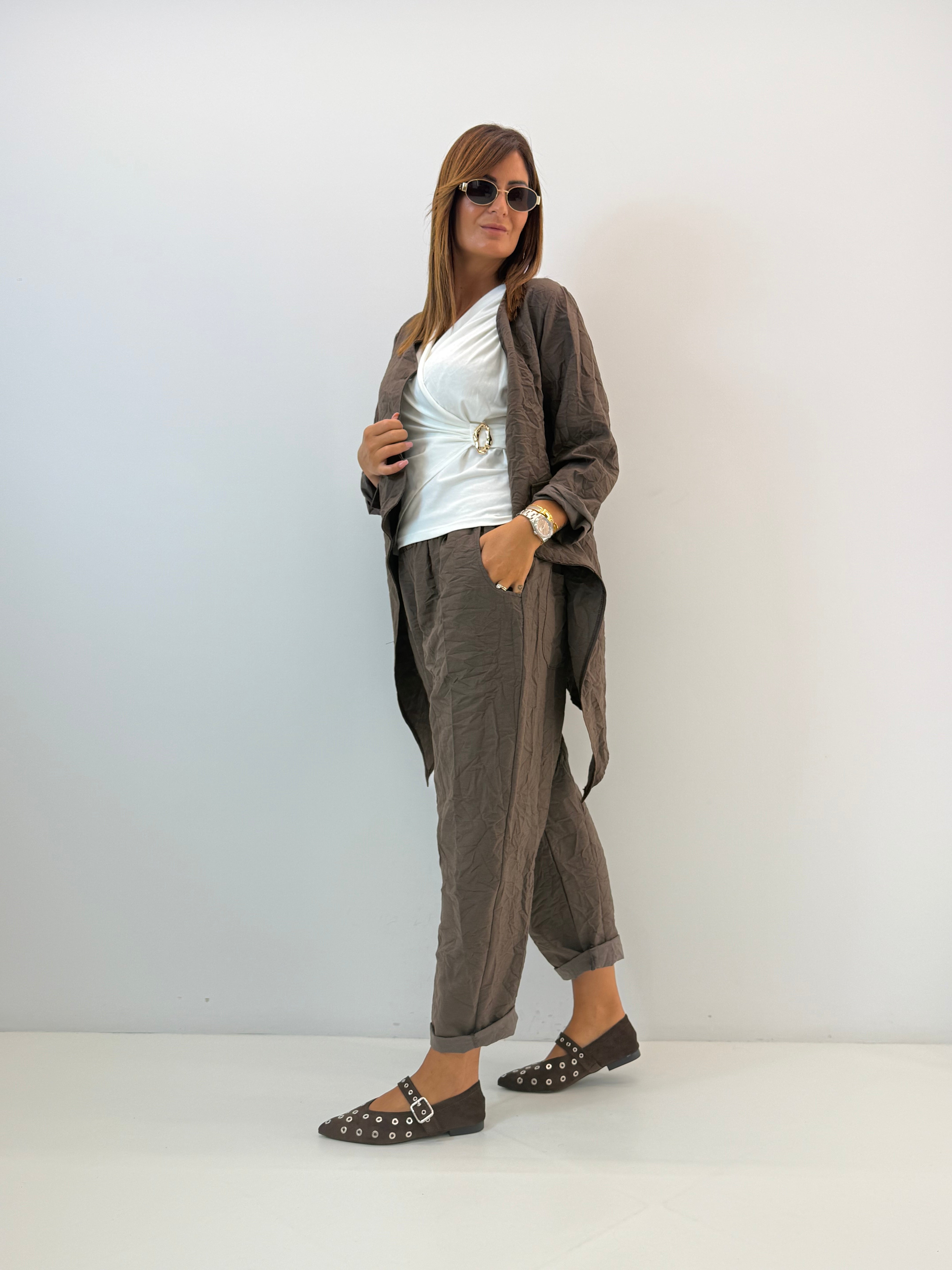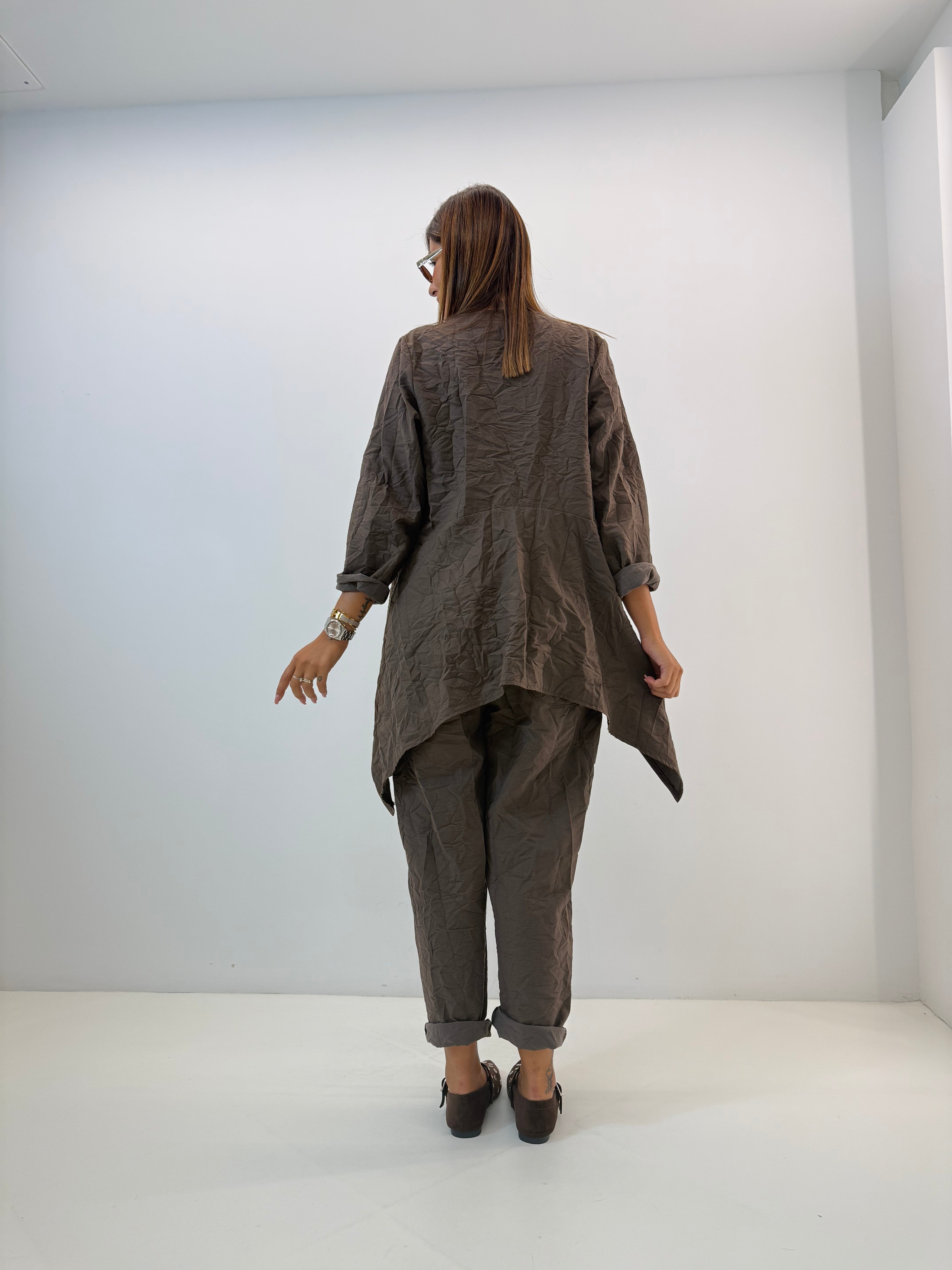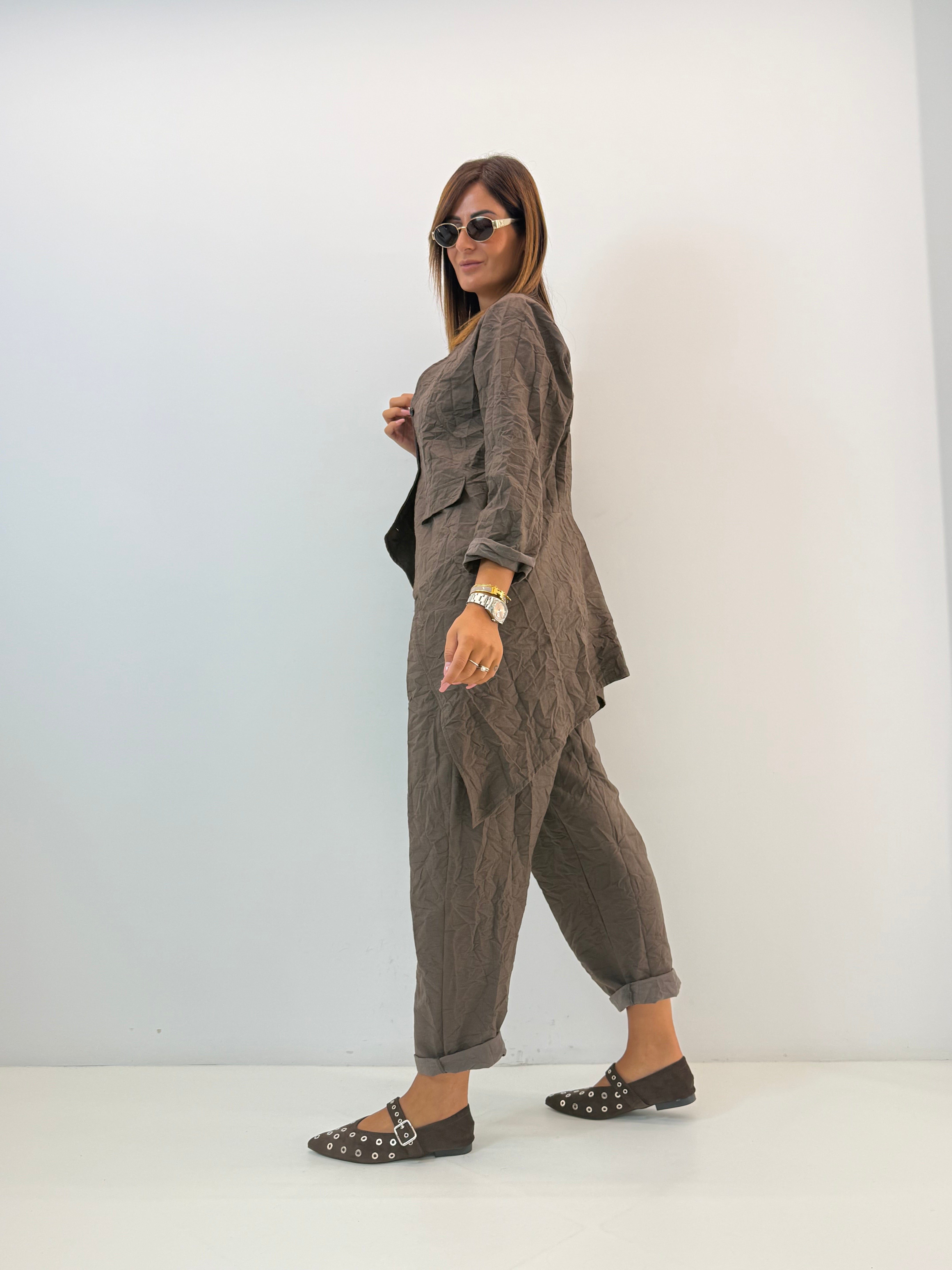 Pantalone in misto cotone, effetto stropicciato, modello baggy, fascia elastica in vita, tasche laterali a lunetta e tasche dietro. Orlo leggermente ristretto alla caviglia. Vestibilità comoda.