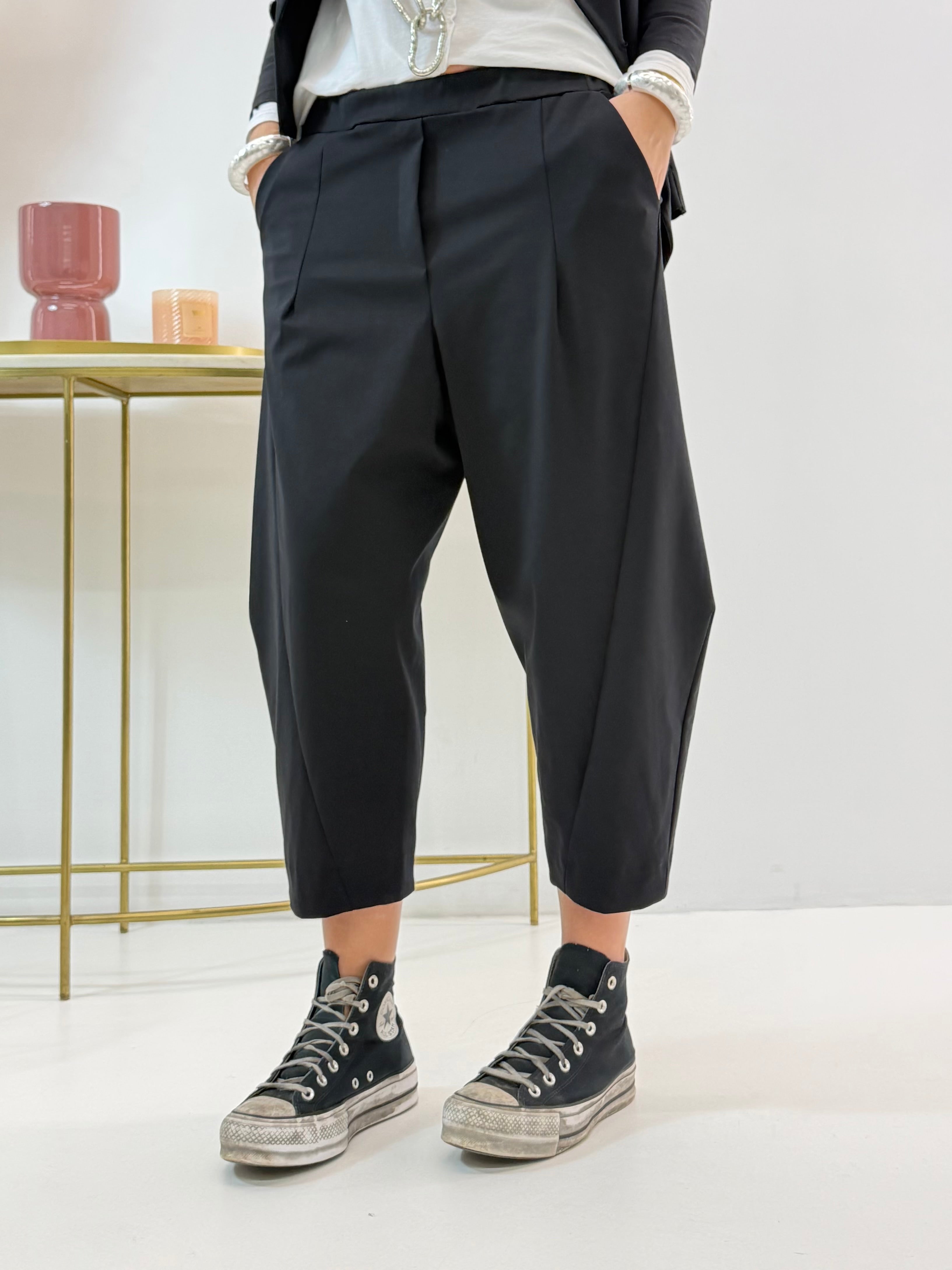 Pantalone in punto Milano più leggero, con fascia elasticizzata in vita, senza chiusure ,tasche laterali a lunetta. Vestibilità comoda