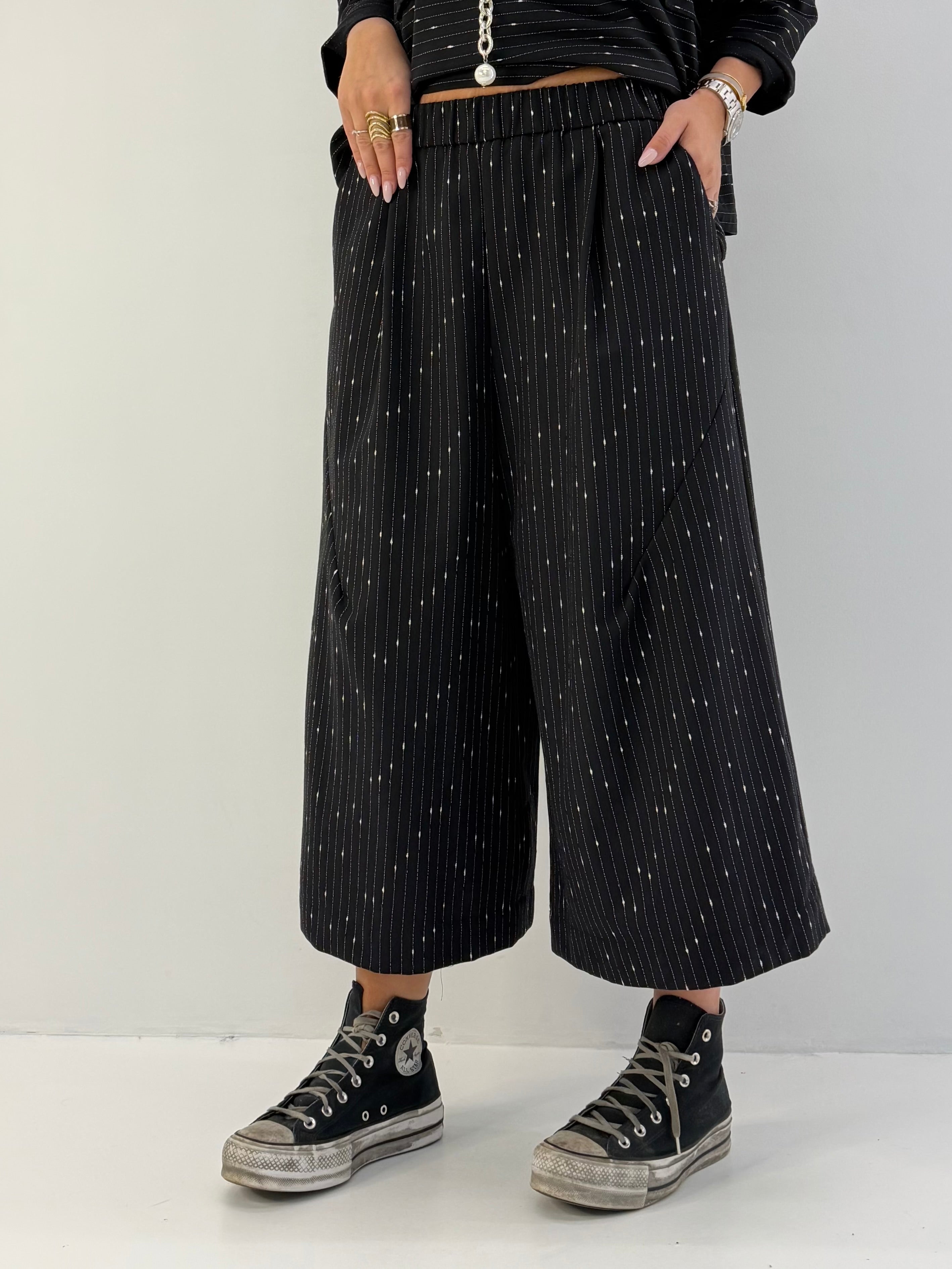 Pantaloni in tessuto gessato puntinato. Fascia elasticizzata in vita. Tasche laterali. Cavallo morbido. Taglio crop. Vestibilità ampia e comoda.