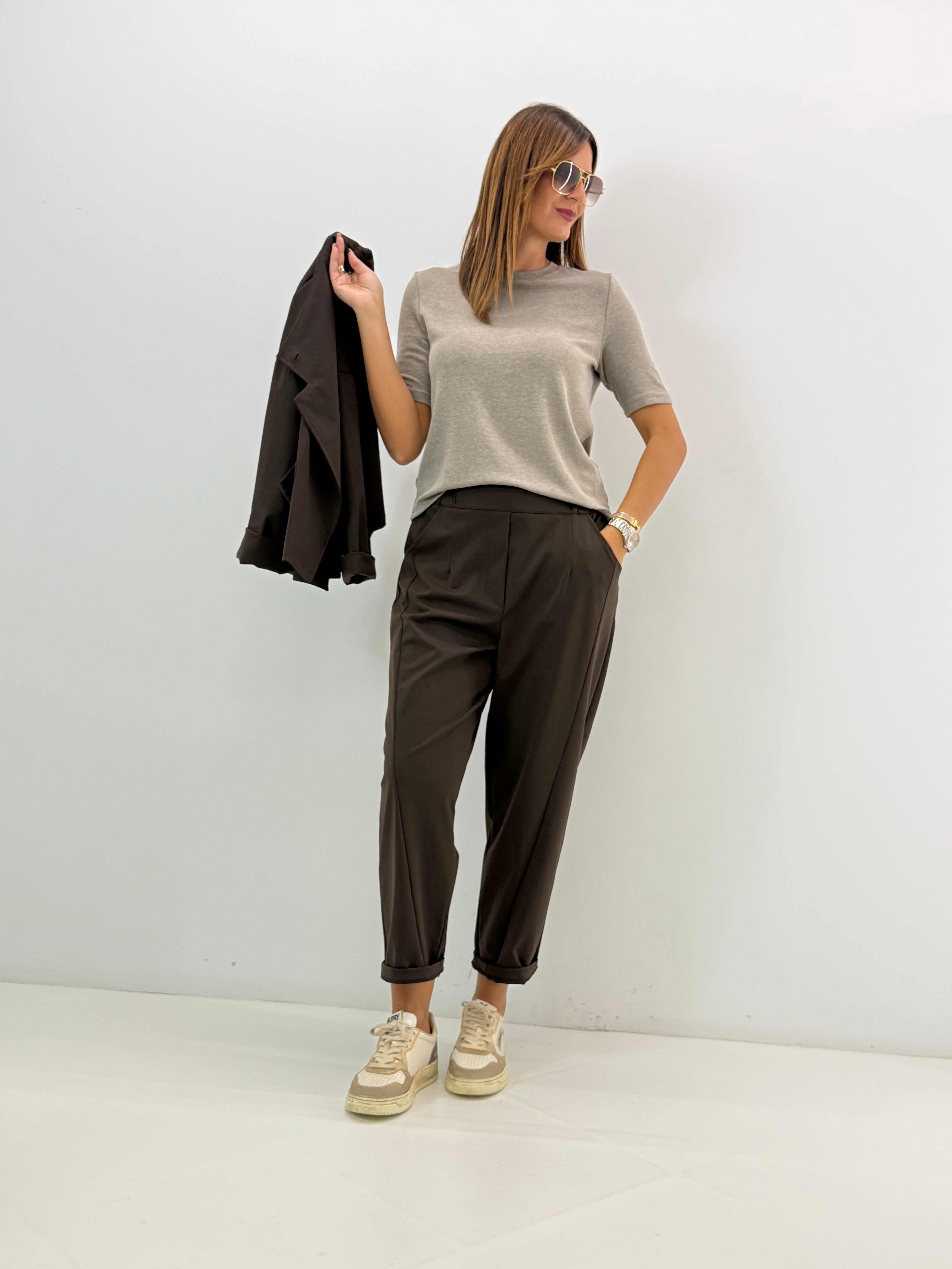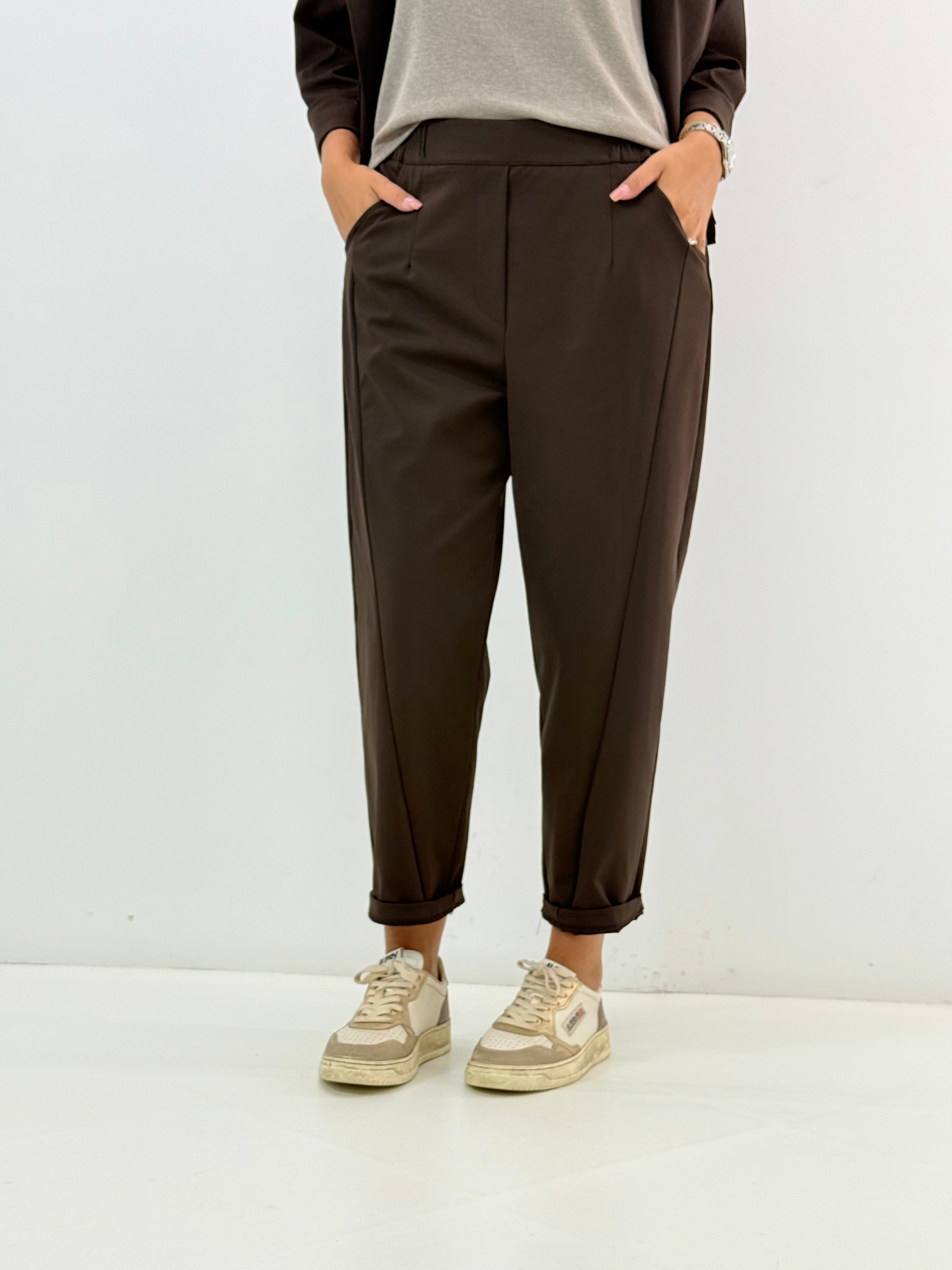 Pantalone in punto Milano, con fascia elasticizzata in vita dietro, senza chiusure ,tasche laterali a lunetta. Vestibilità comoda