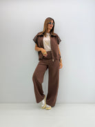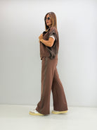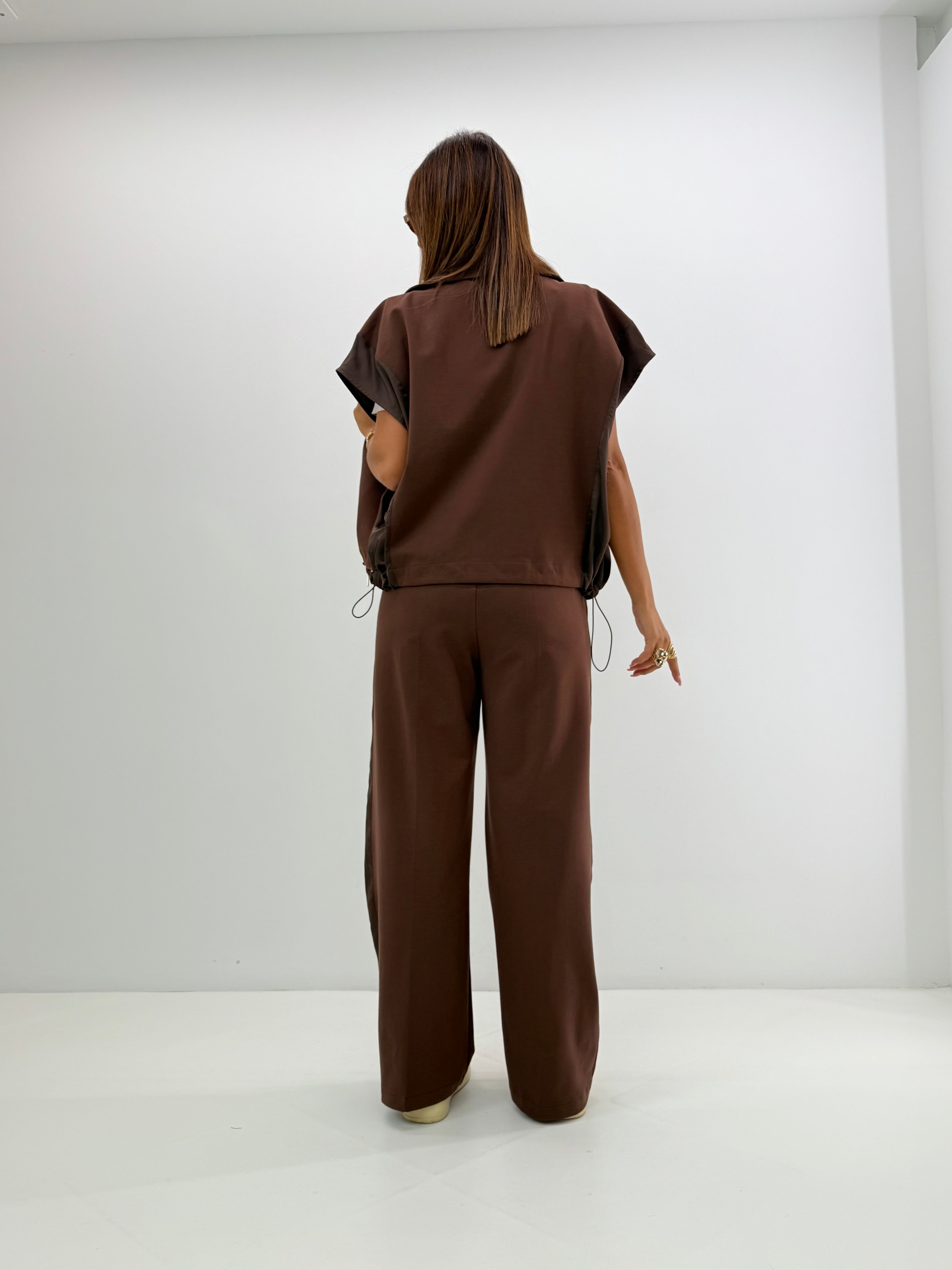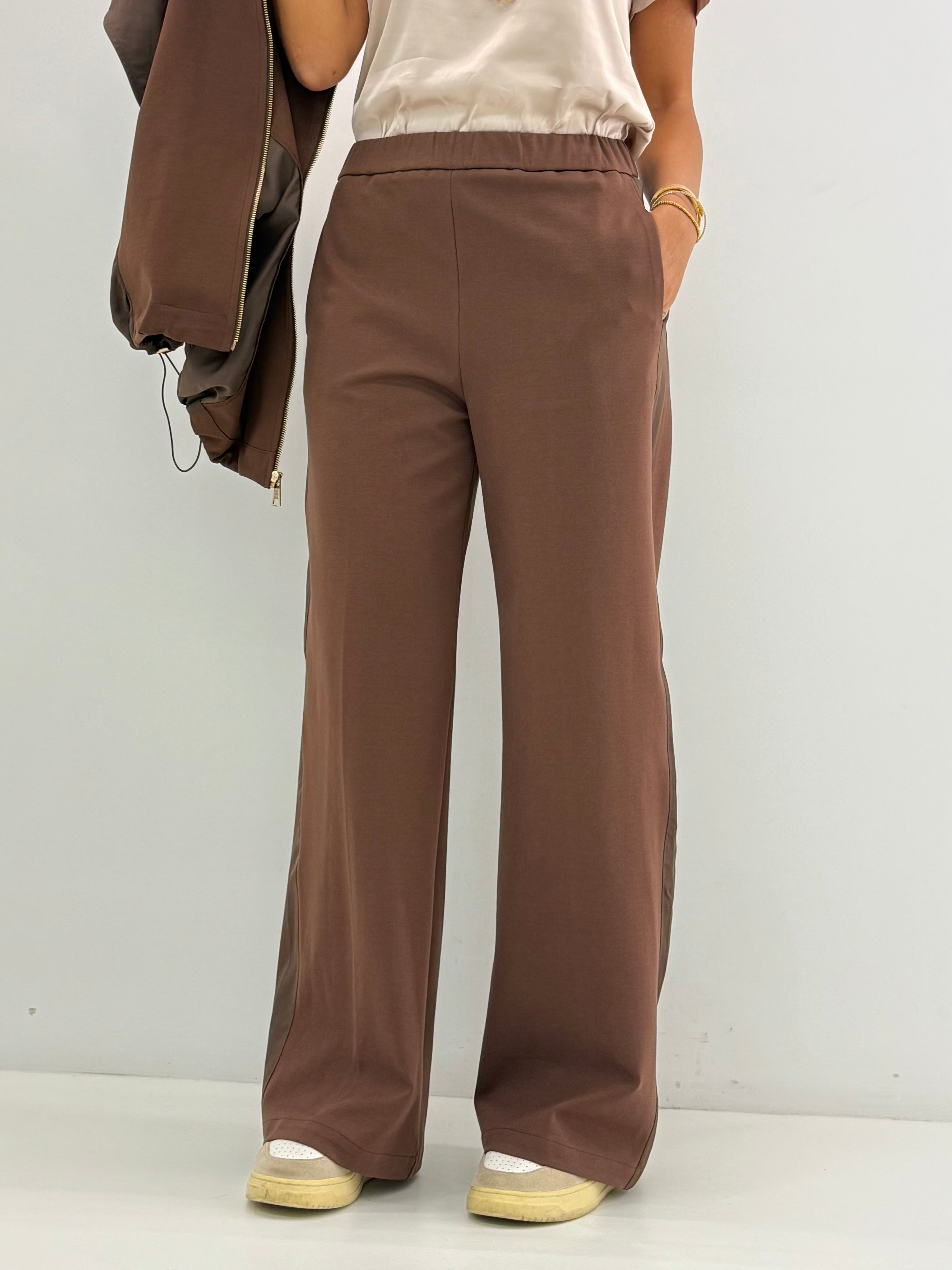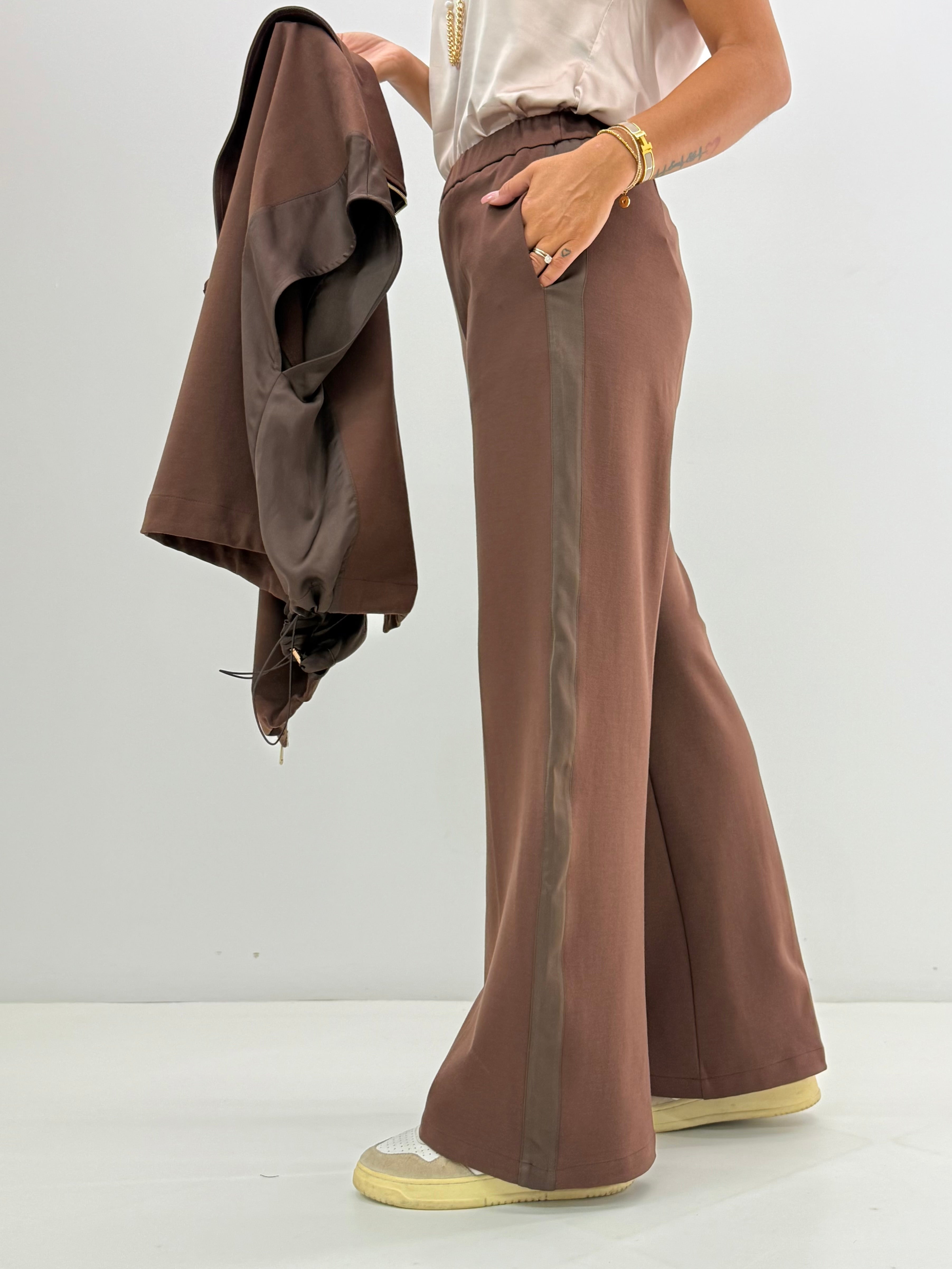 Pantalone in misto viscosa, tasche laterali a scomparsa, elastico in vita, modello a gamba larga con inserti laterali in saten.