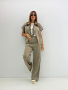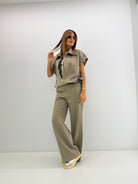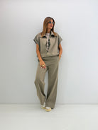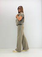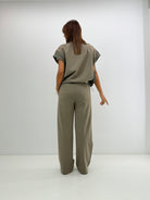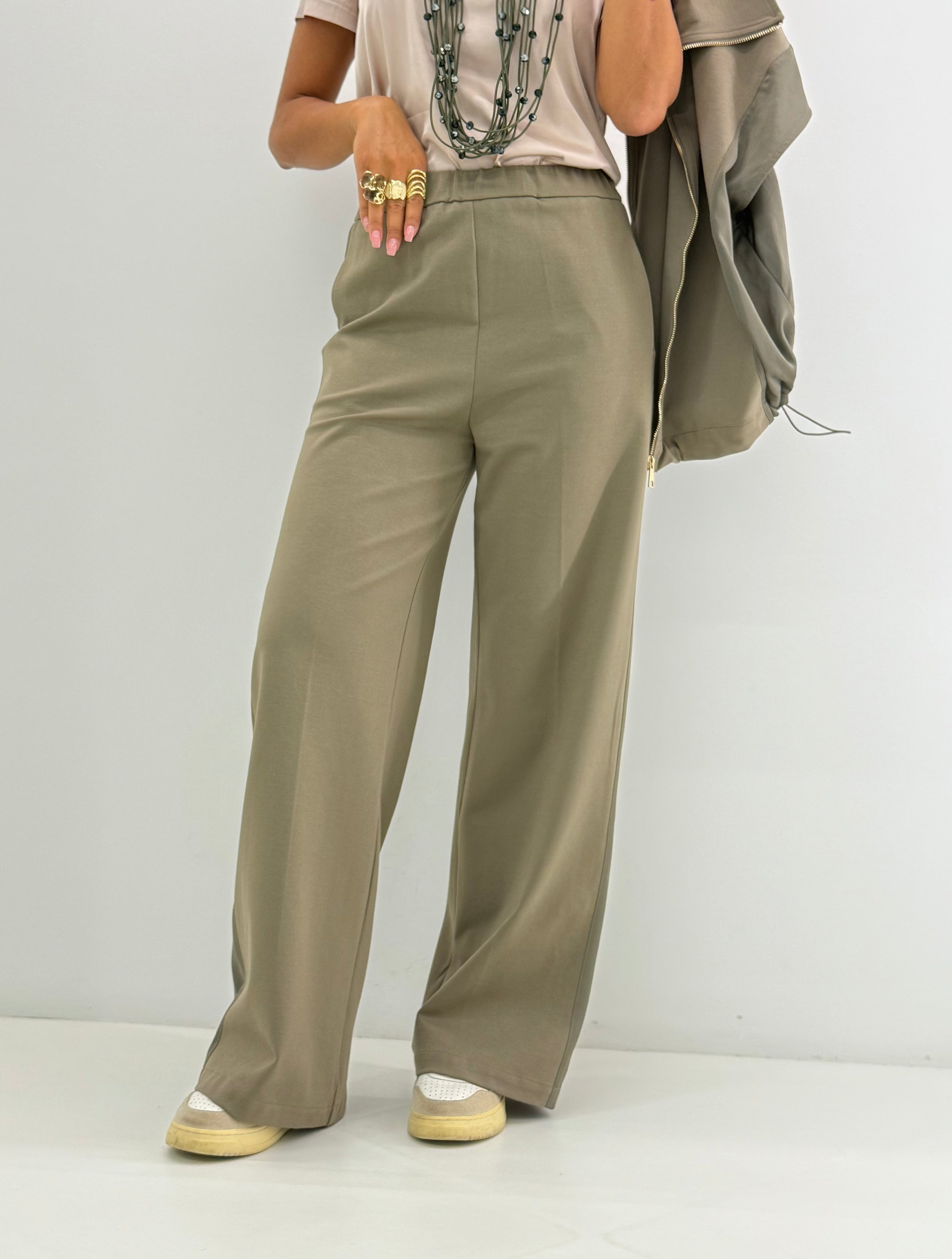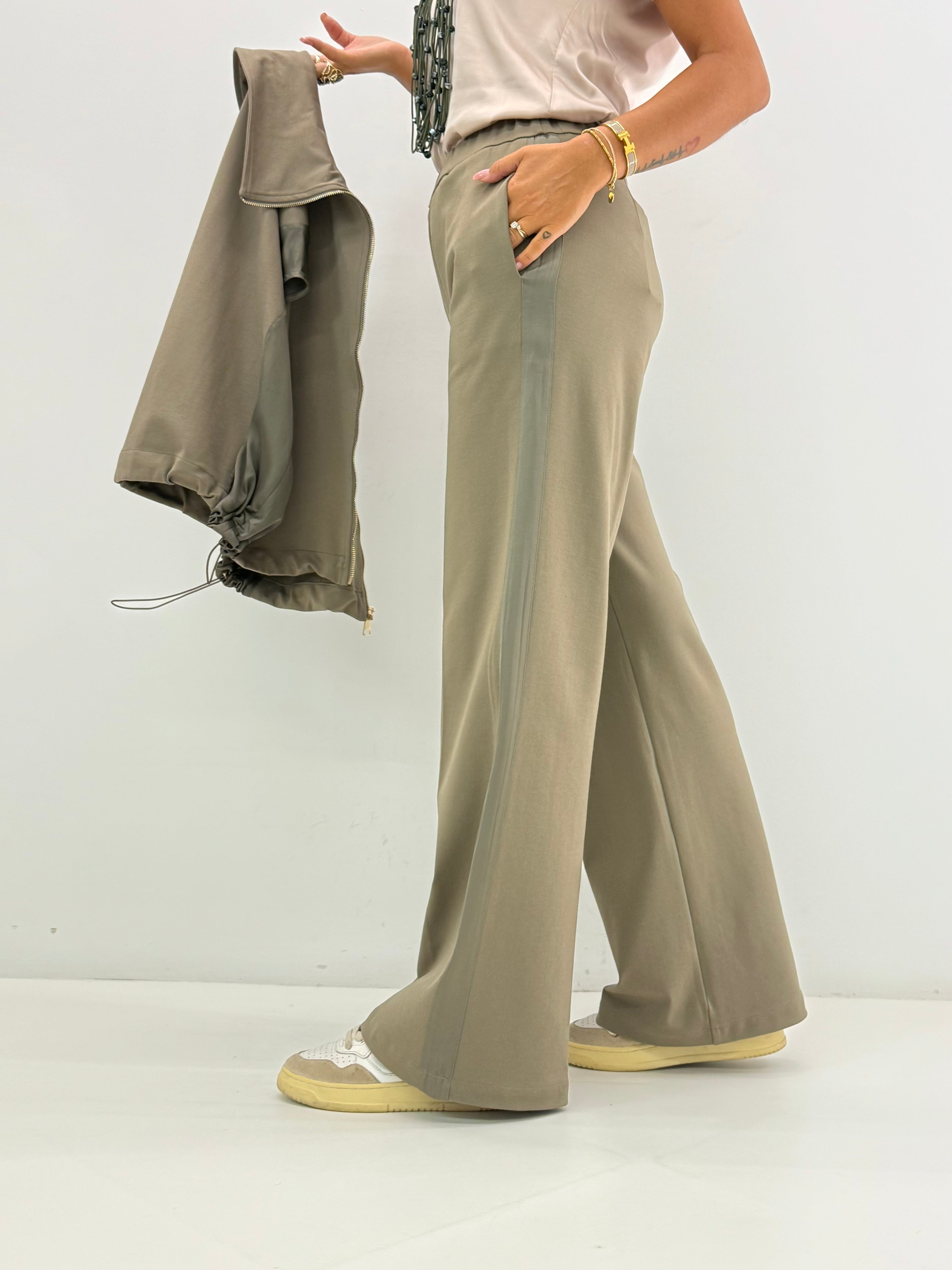 Pantalone in misto viscosa, tasche laterali a scomparsa, elastico in vita, modello a gamba larga con inserti laterali in saten.