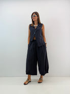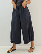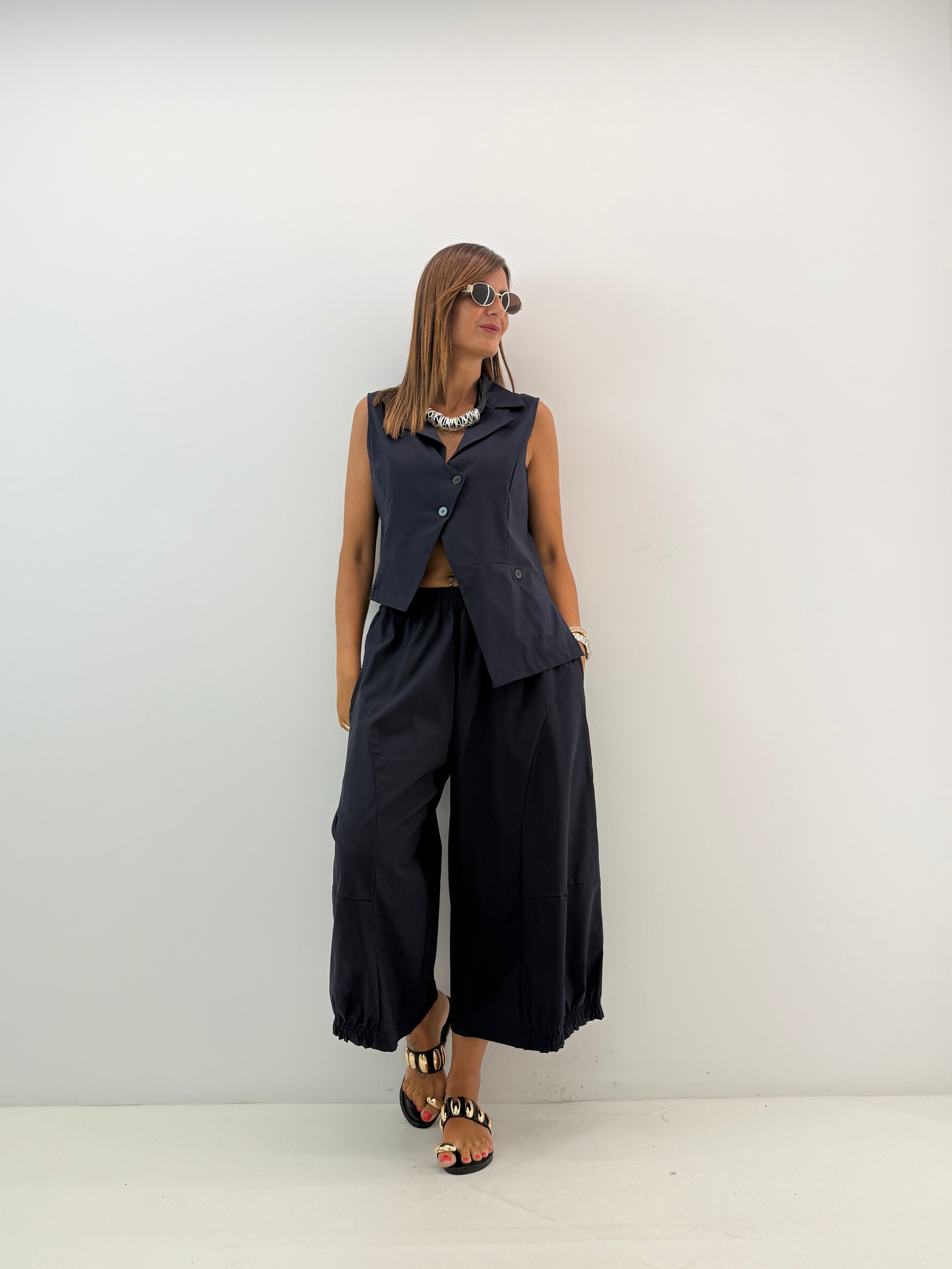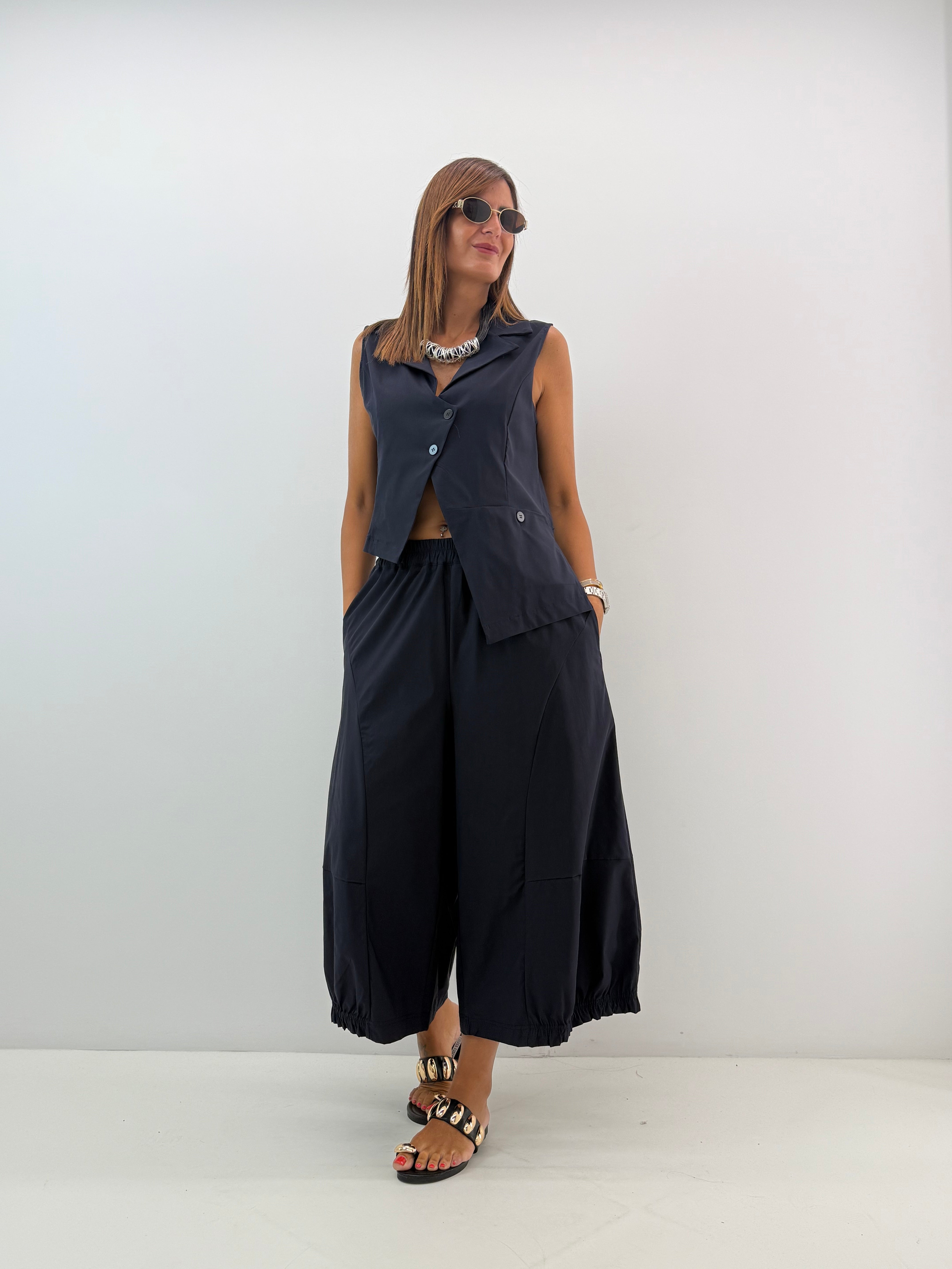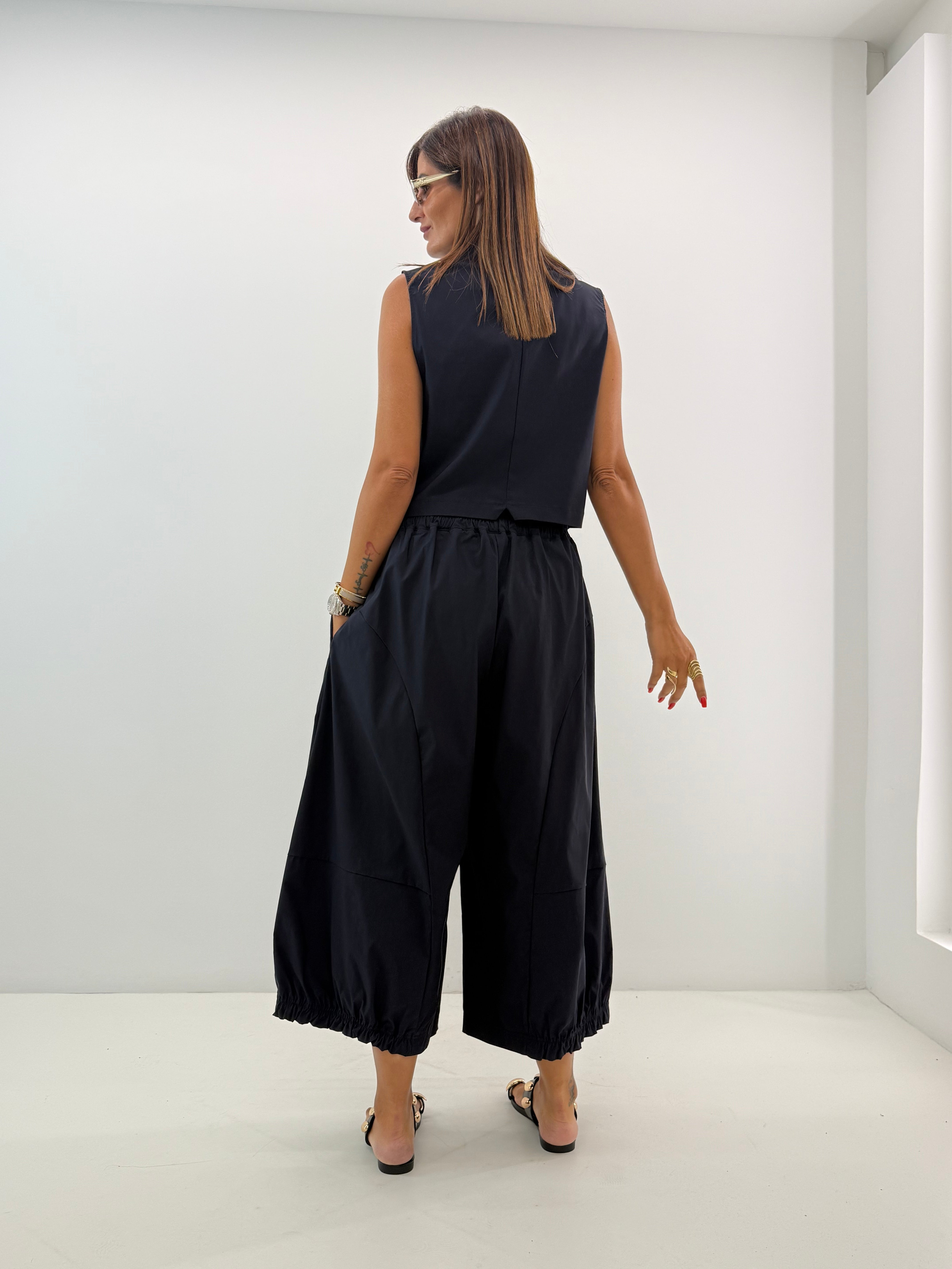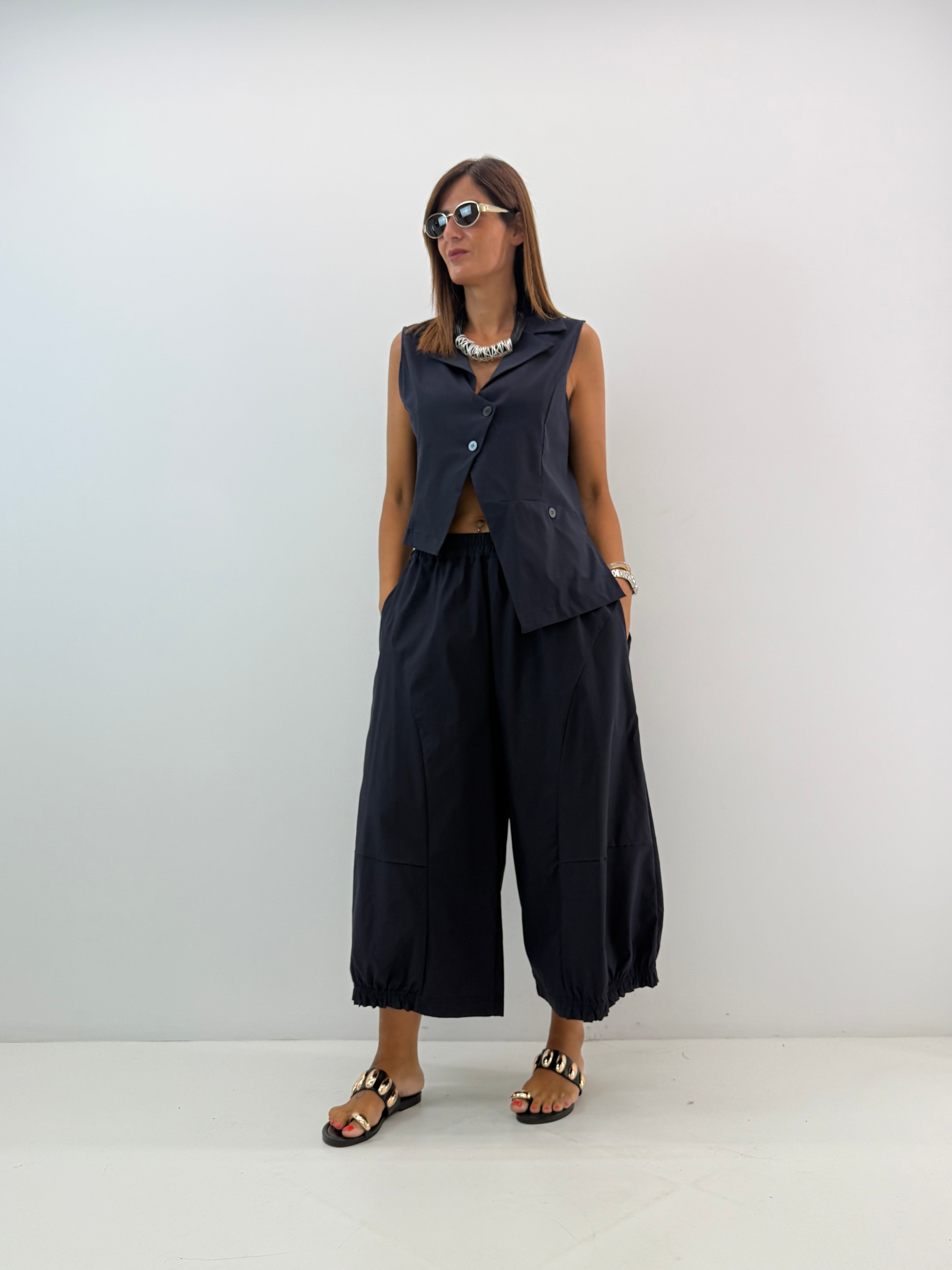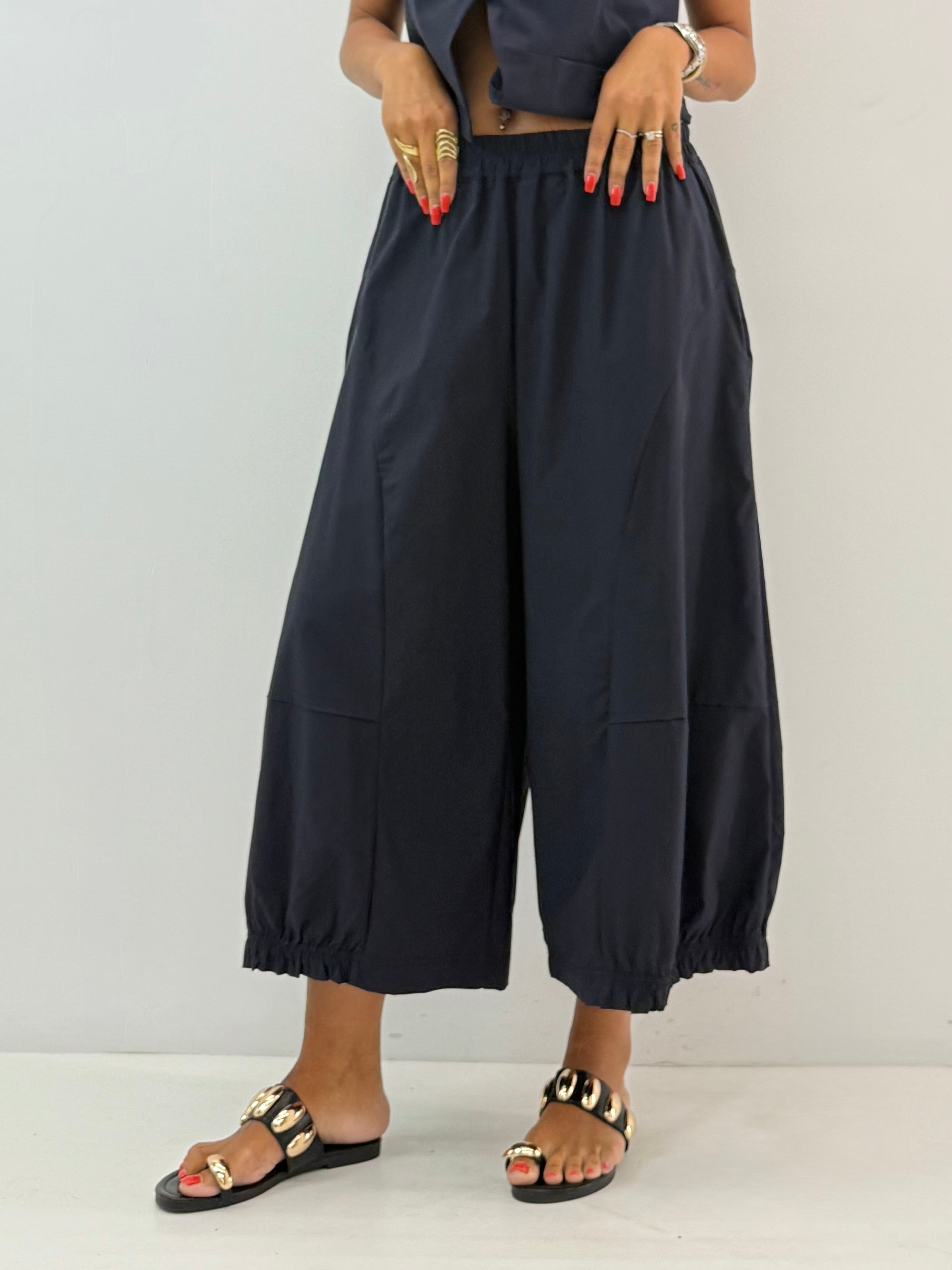 Pantalone in misto viscosa, modello baggy, fascia elastica in vita, tasche laterali a scomparsa. Orlo ampio con elastico. Vestibilità comoda.