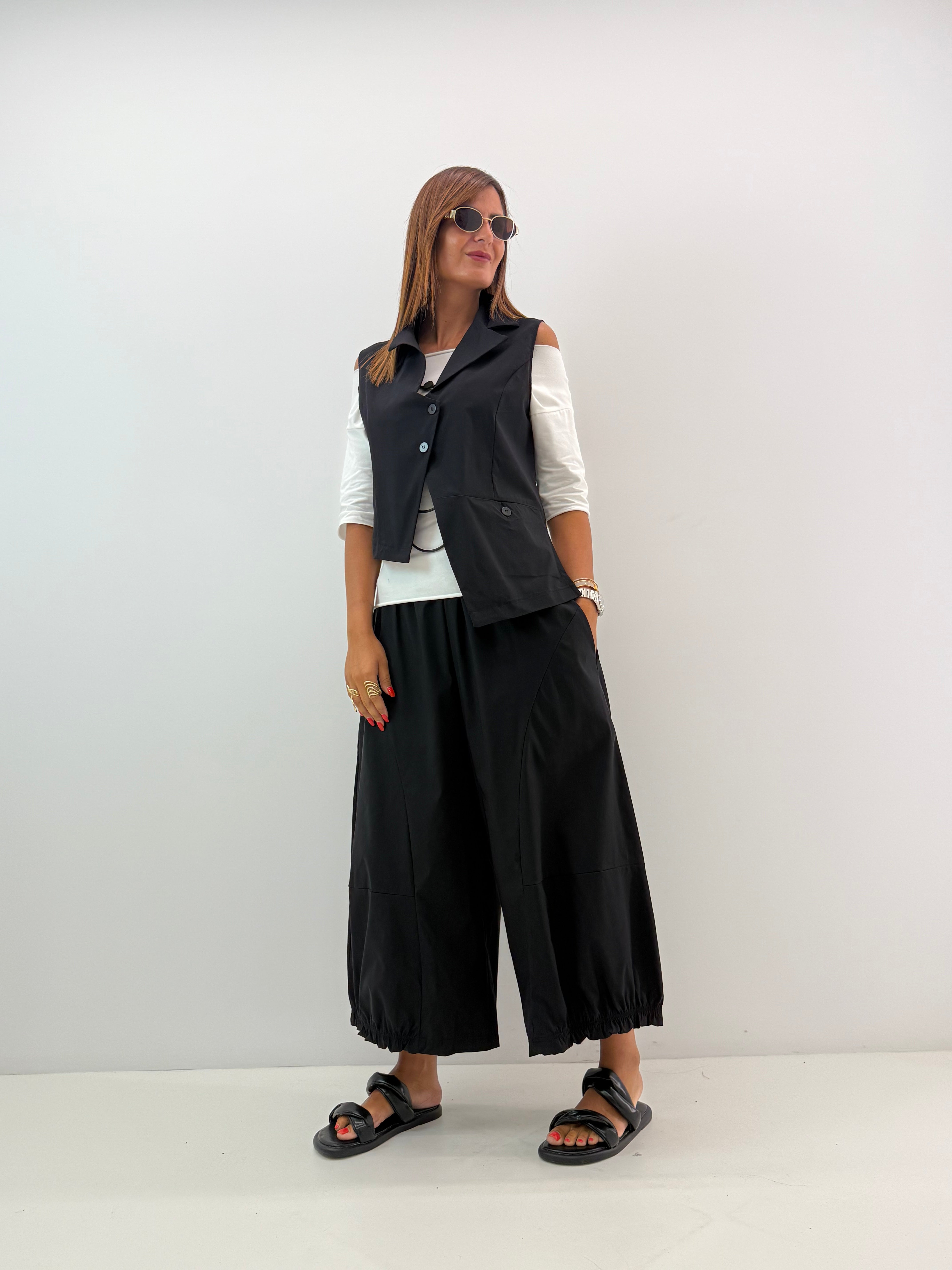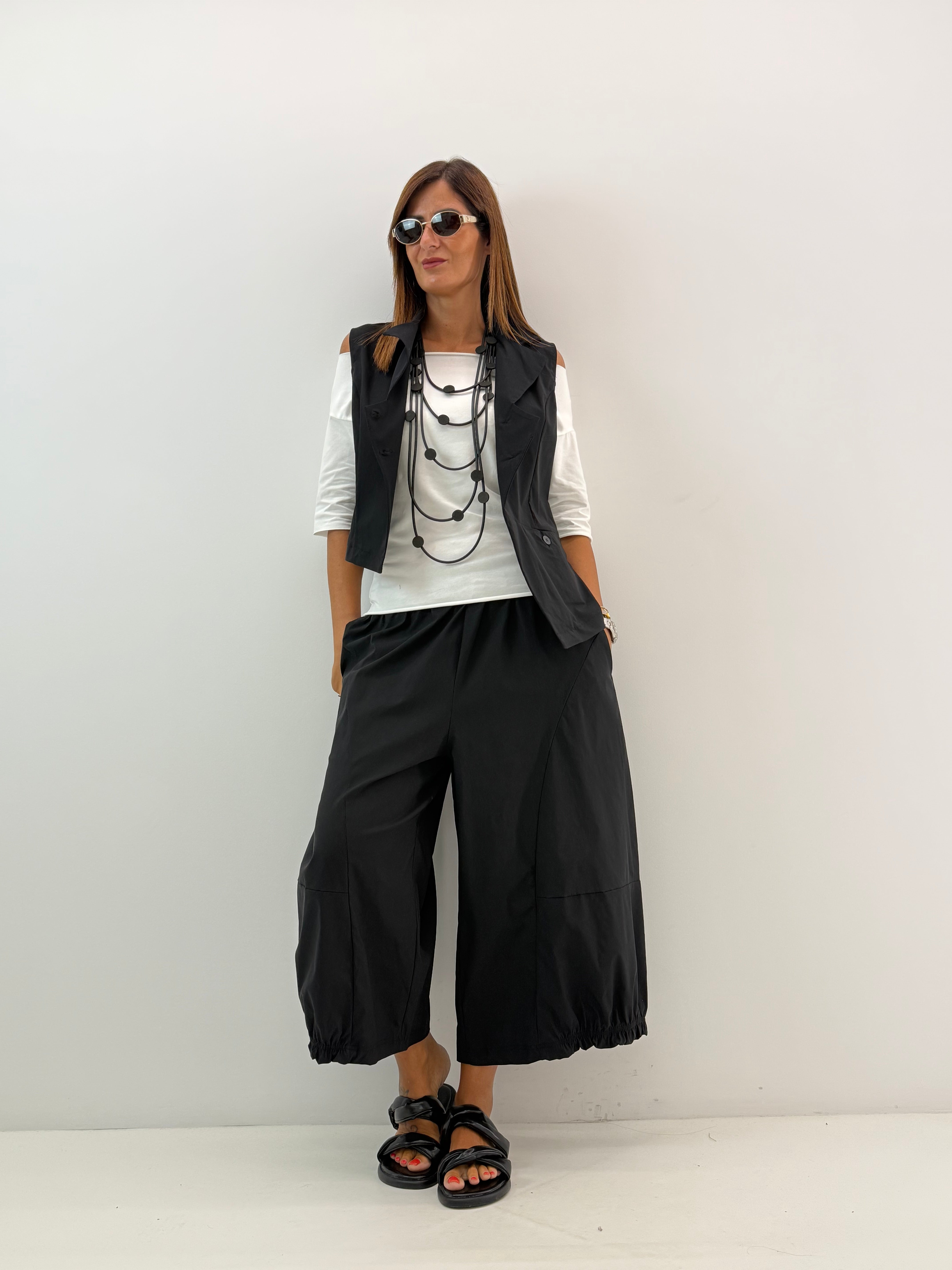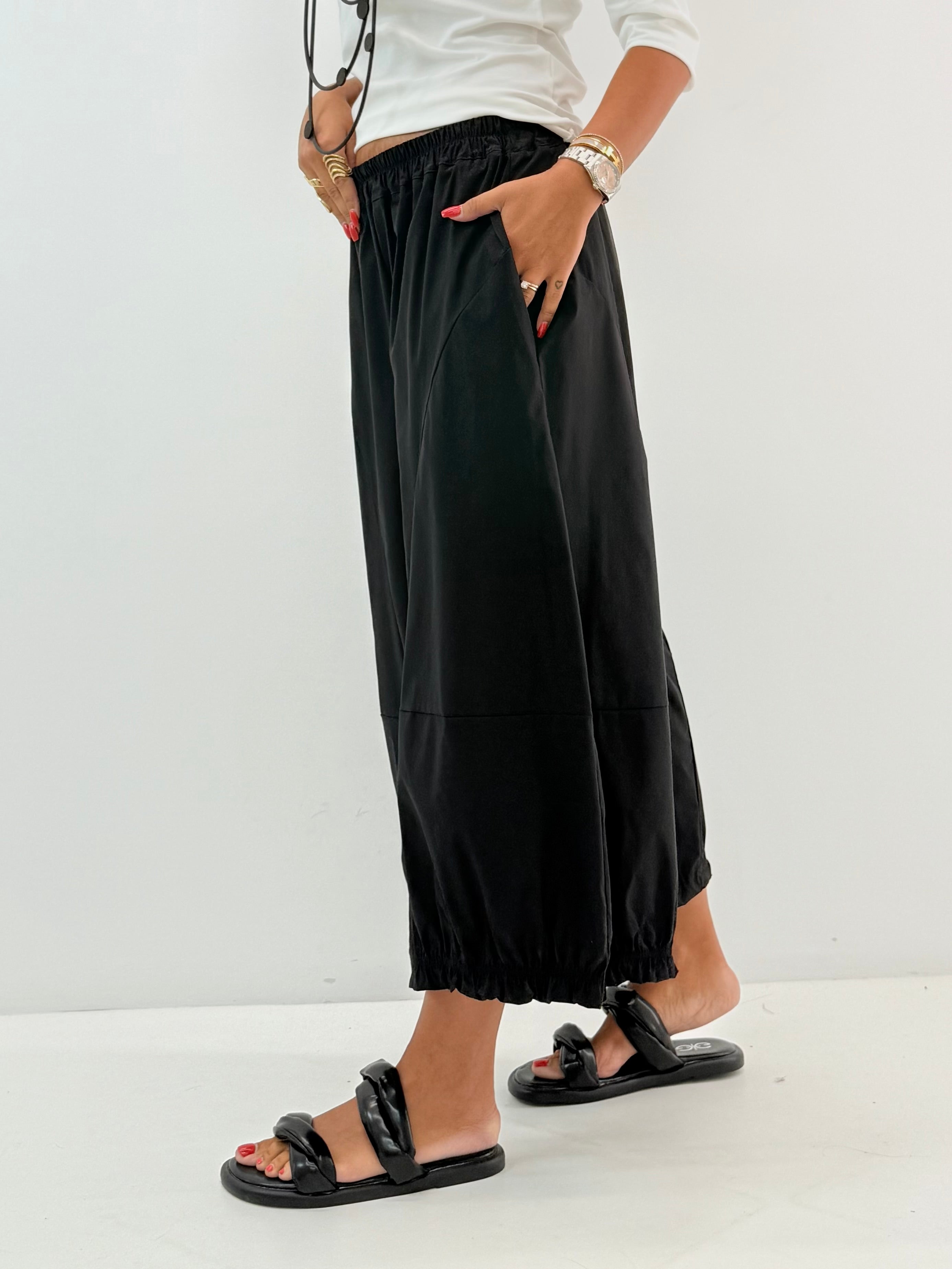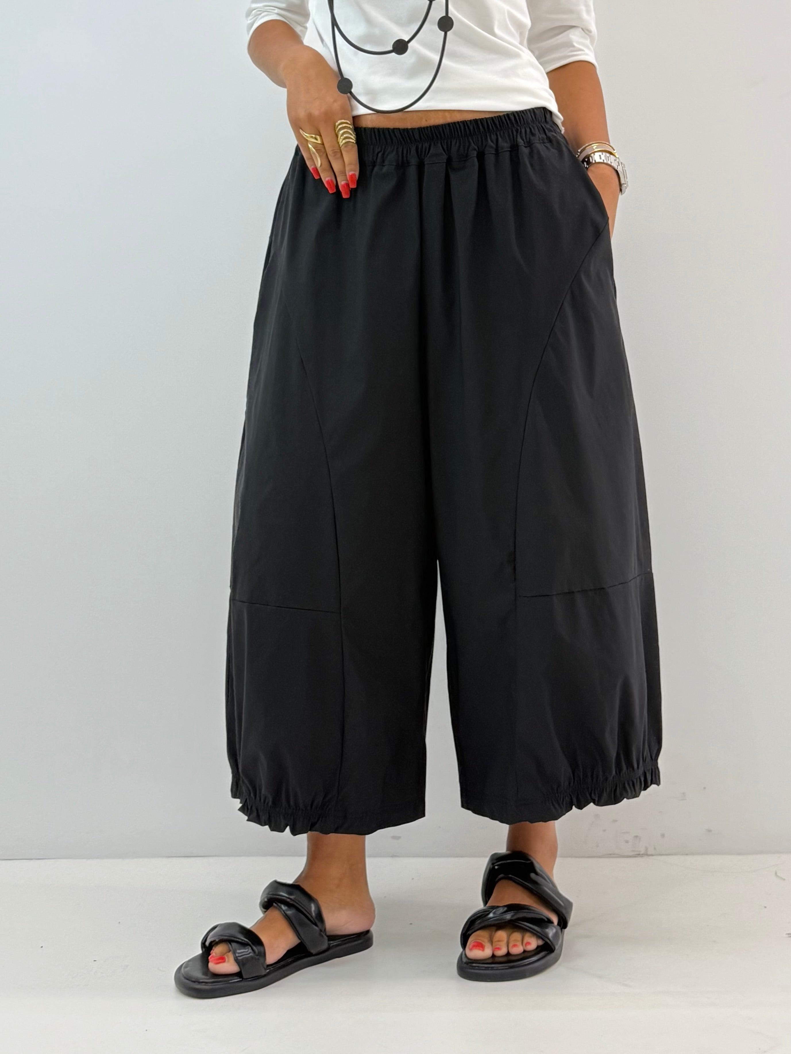 Pantalone in misto viscosa, modello baggy, fascia elastica in vita, tasche laterali a scomparsa. Orlo ampio con elastico. Vestibilità comoda.