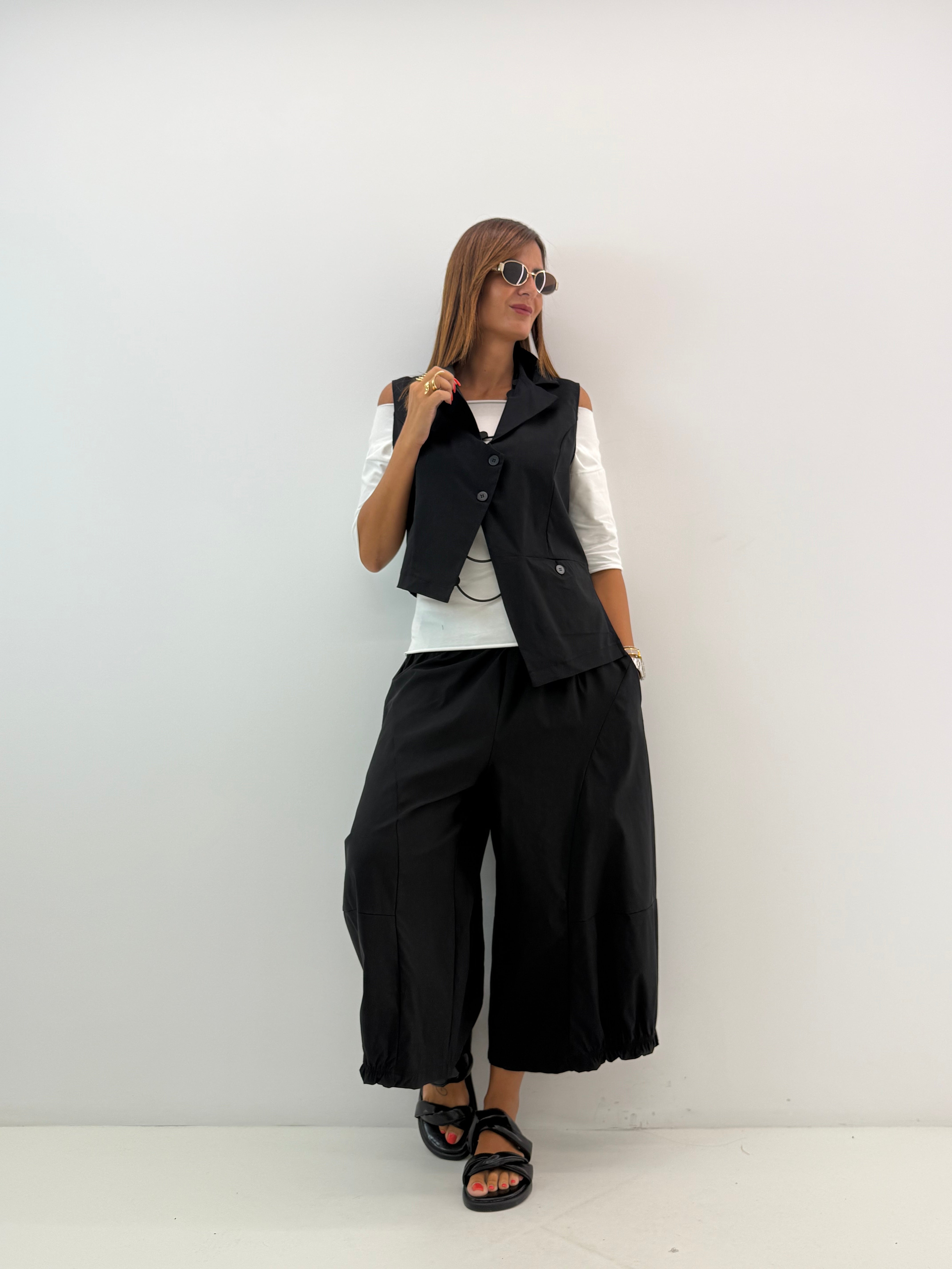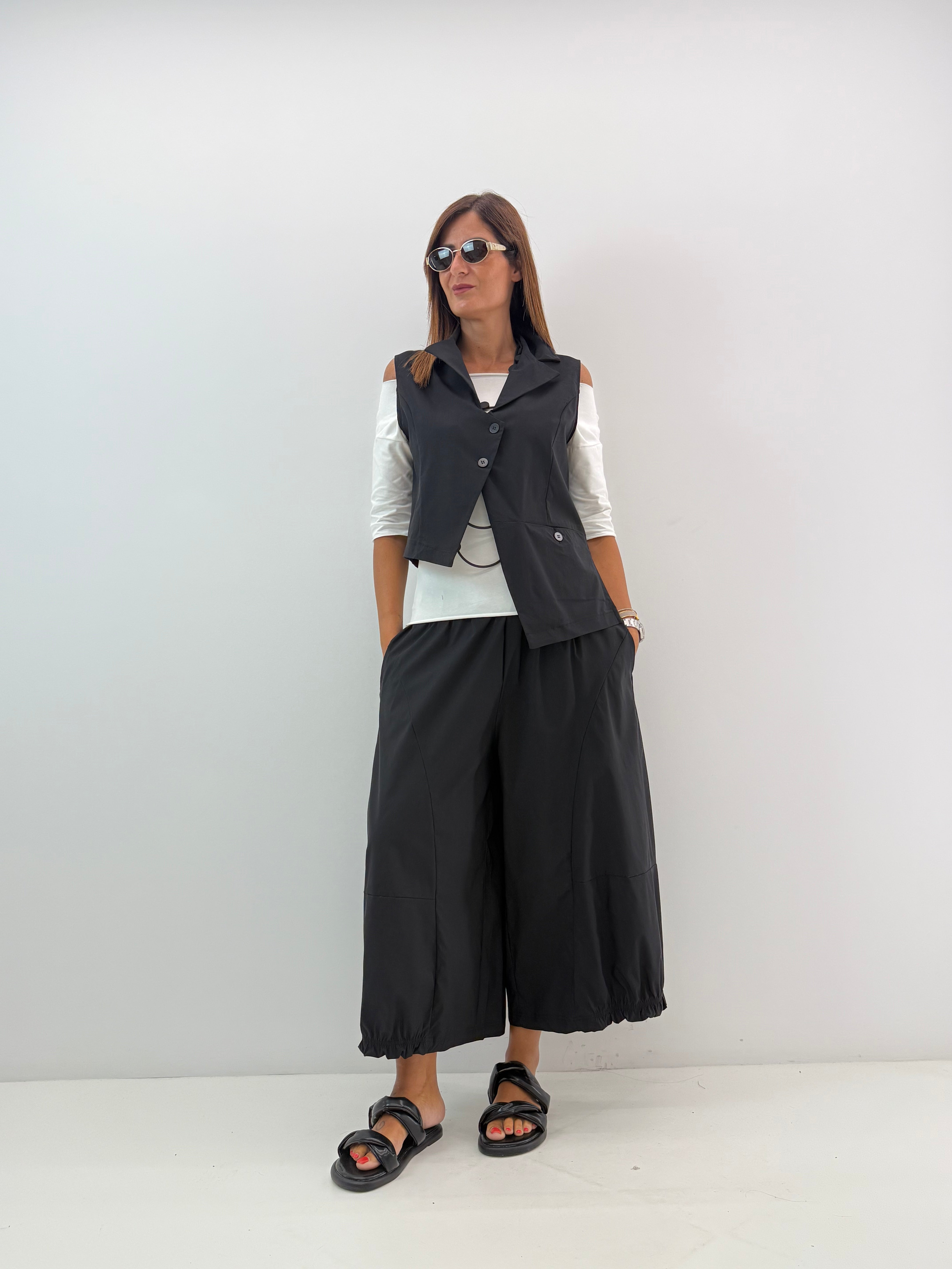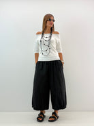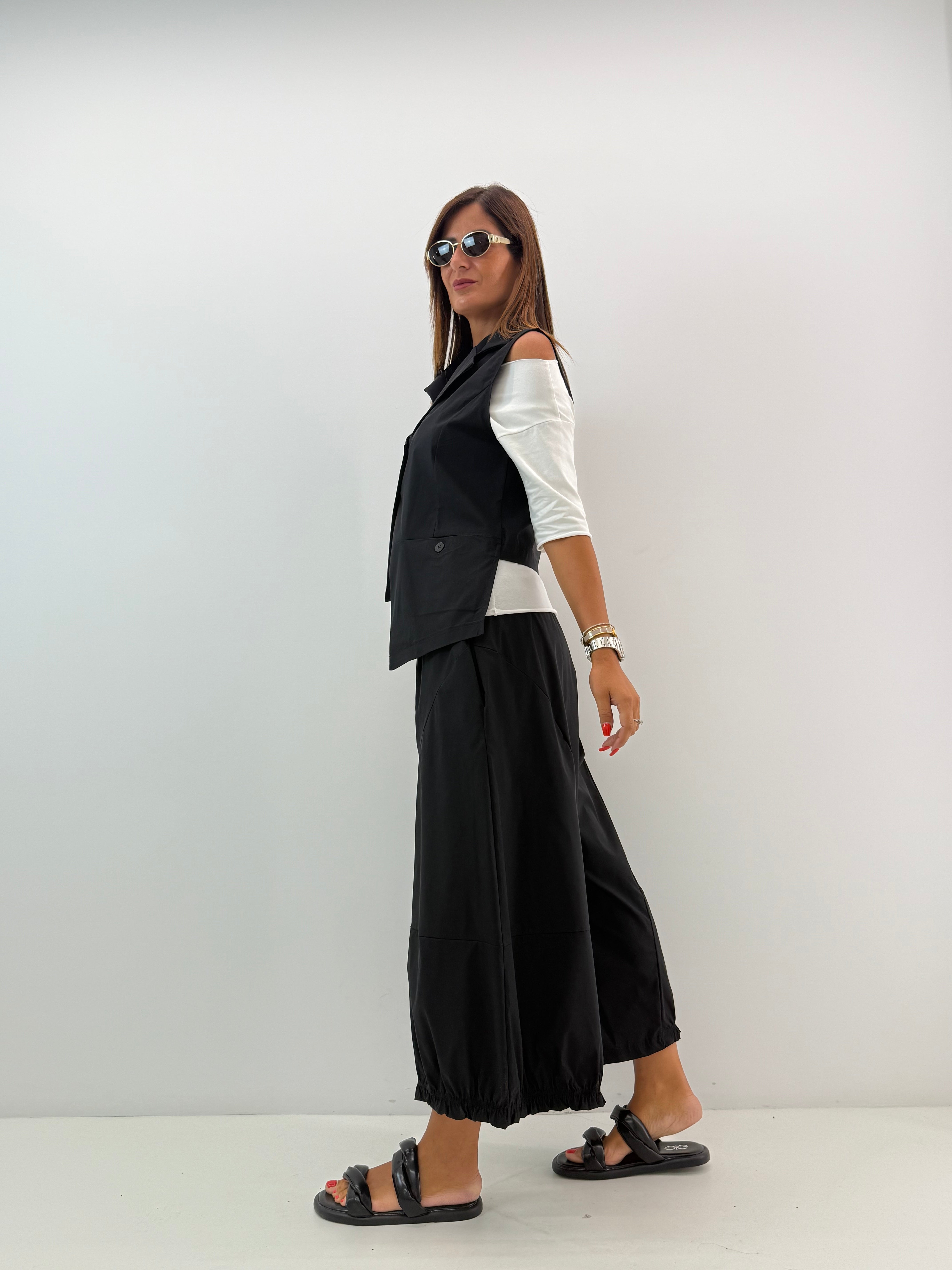Pantalone in misto viscosa, modello baggy, fascia elastica in vita, tasche laterali a scomparsa. Orlo ampio con elastico. Vestibilità comoda.
