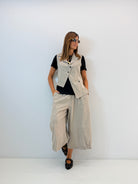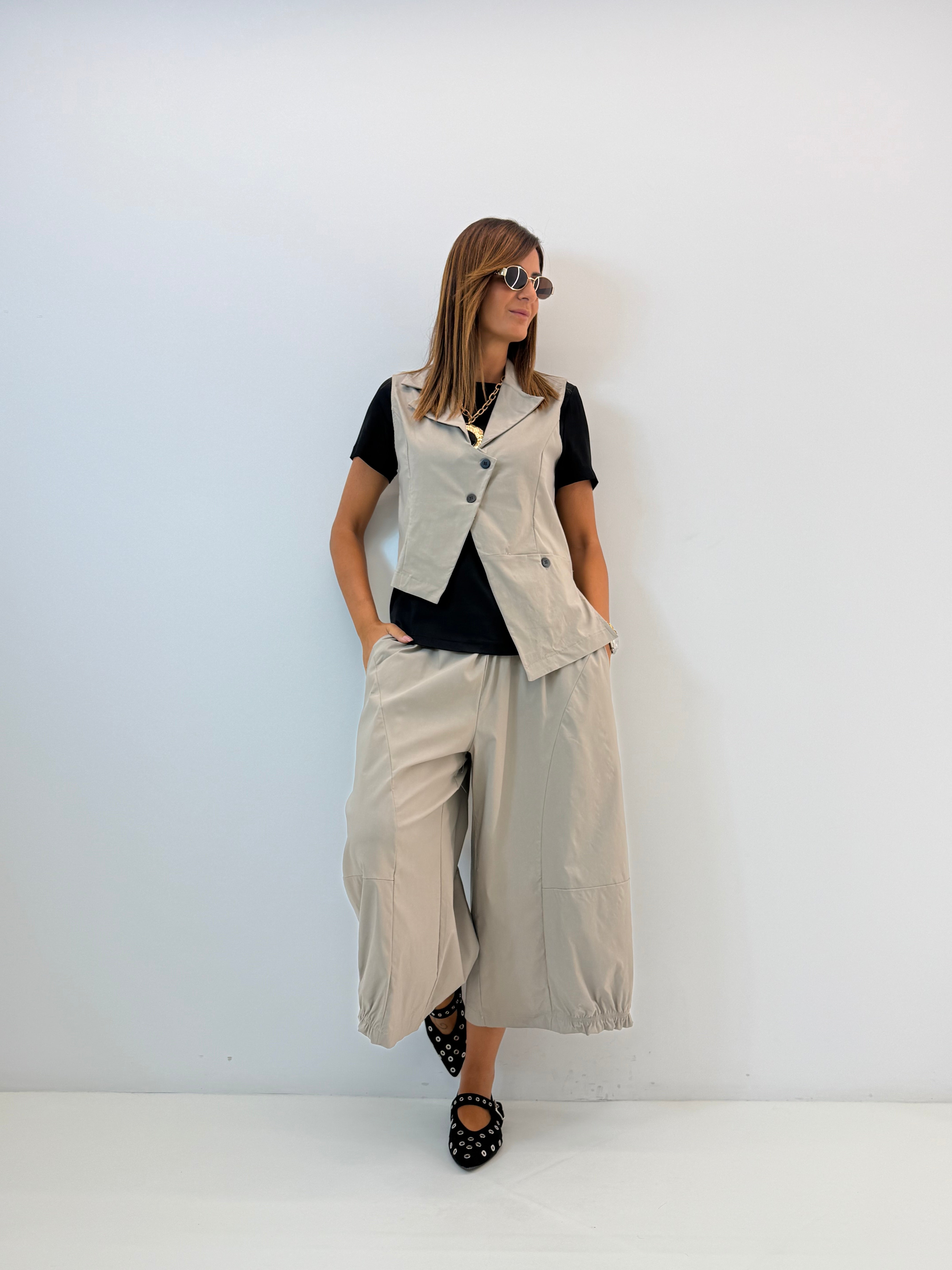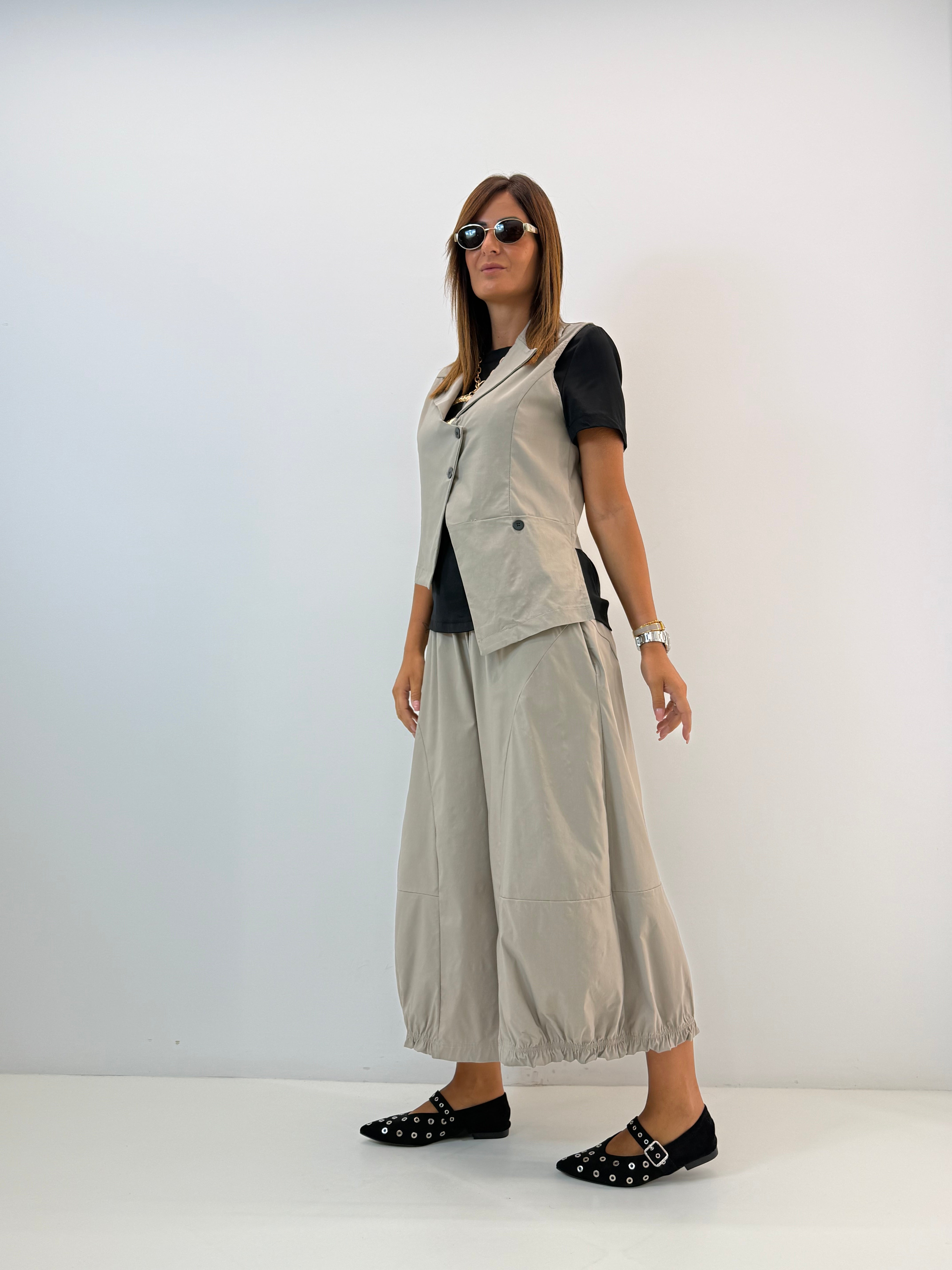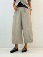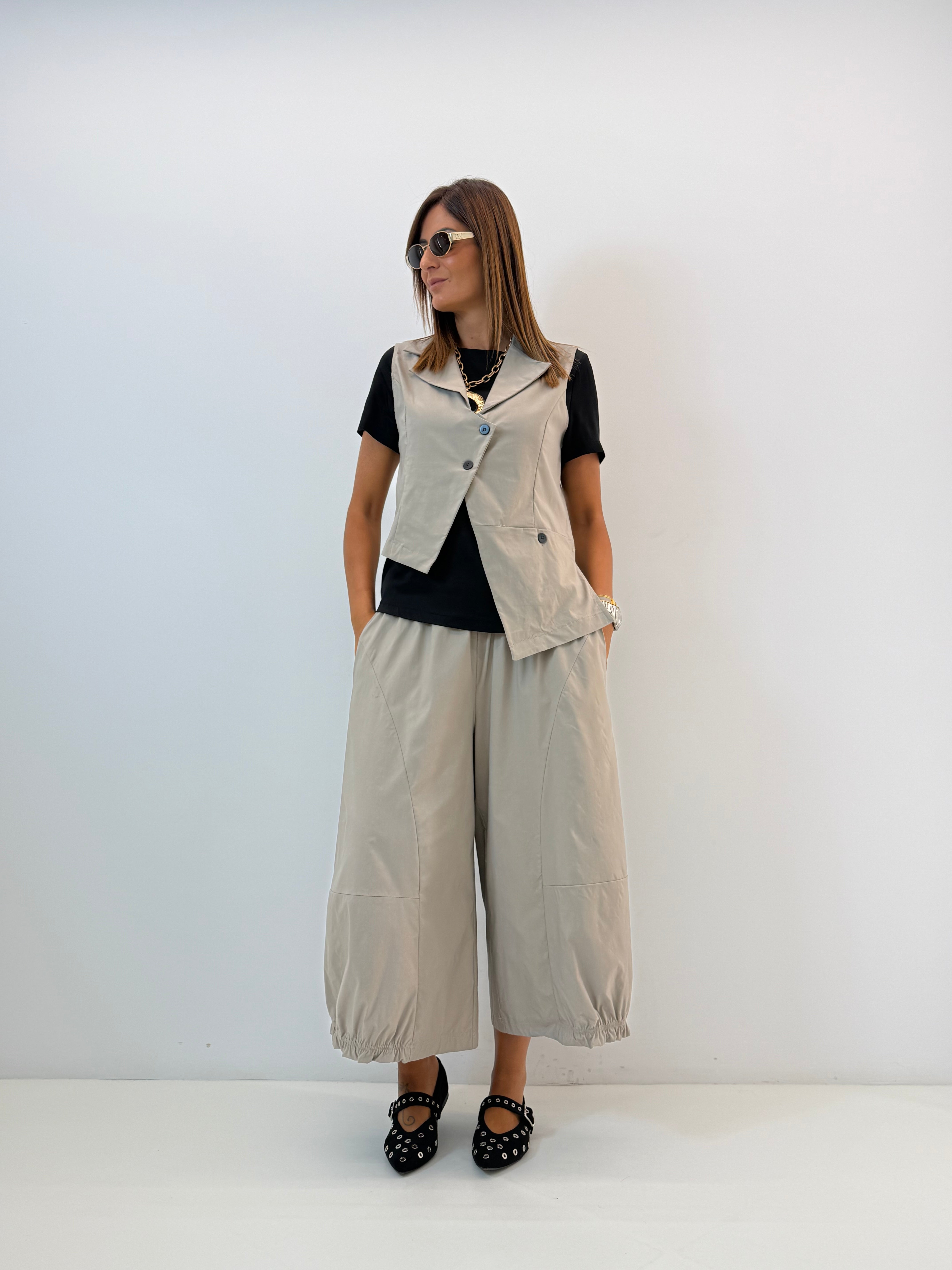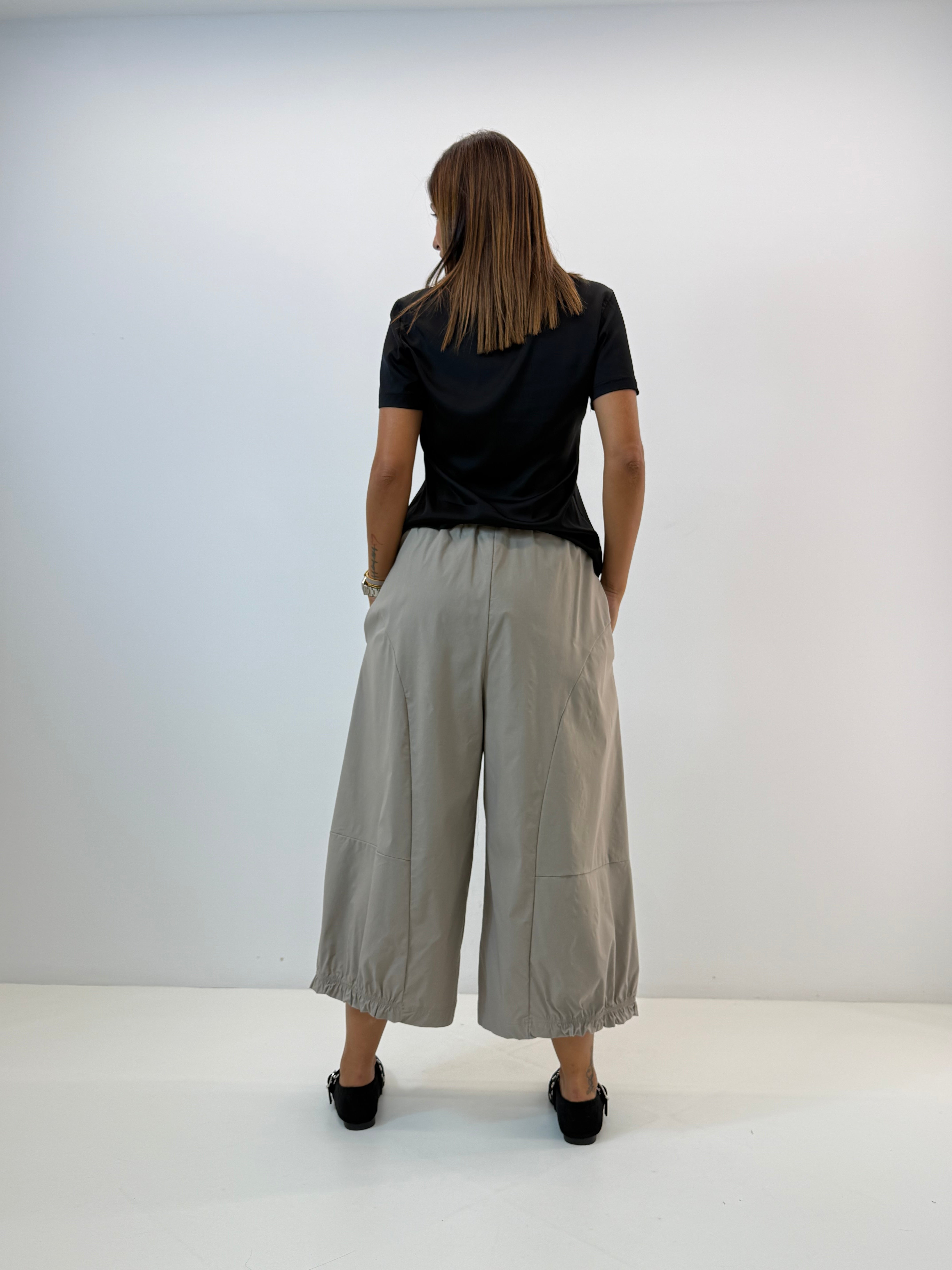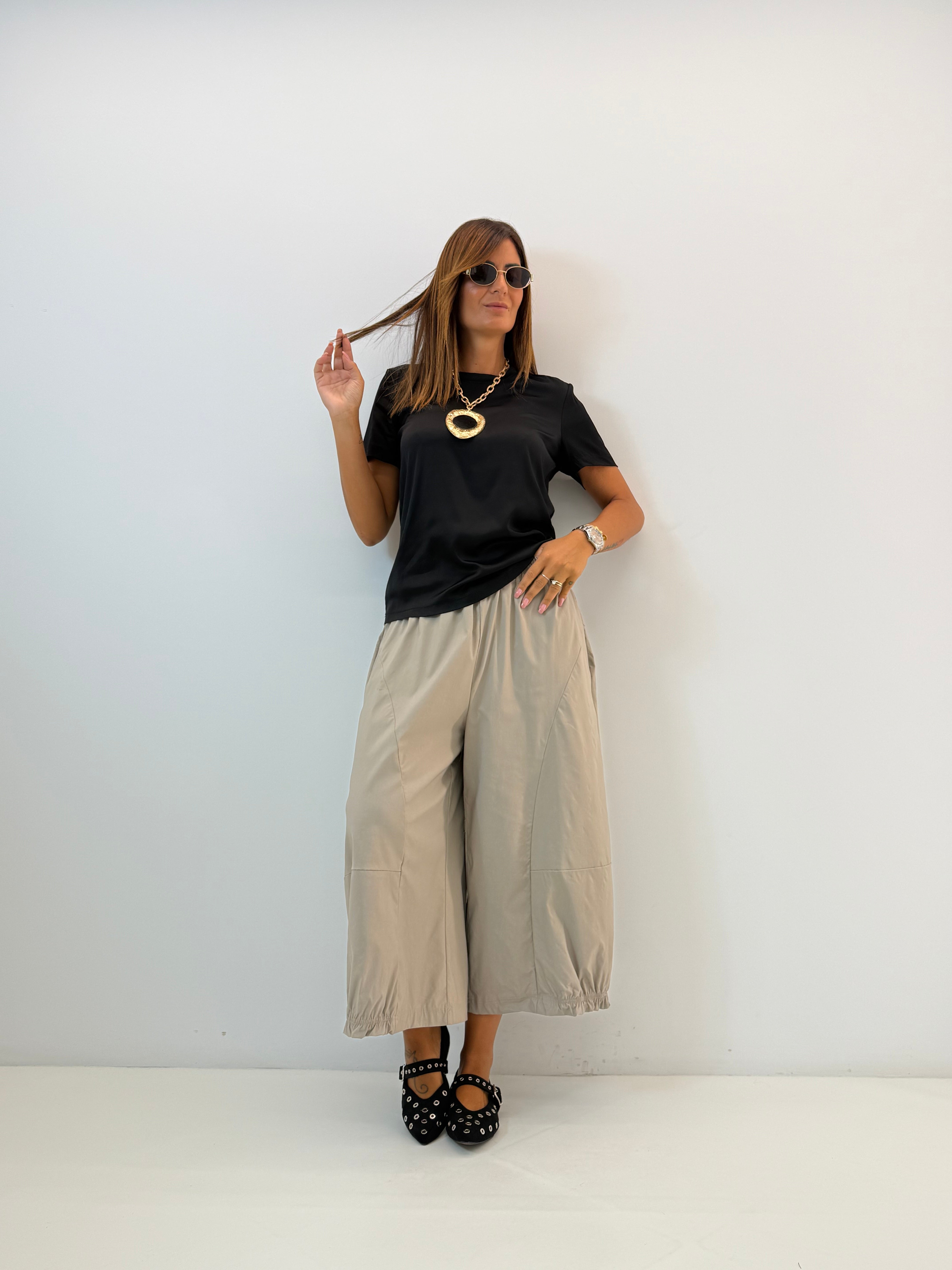 Pantalone in misto viscosa, modello baggy, fascia elastica in vita, tasche laterali a scomparsa. Orlo ampio con elastico. Vestibilità comoda.