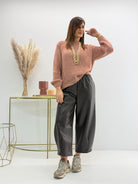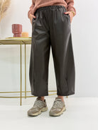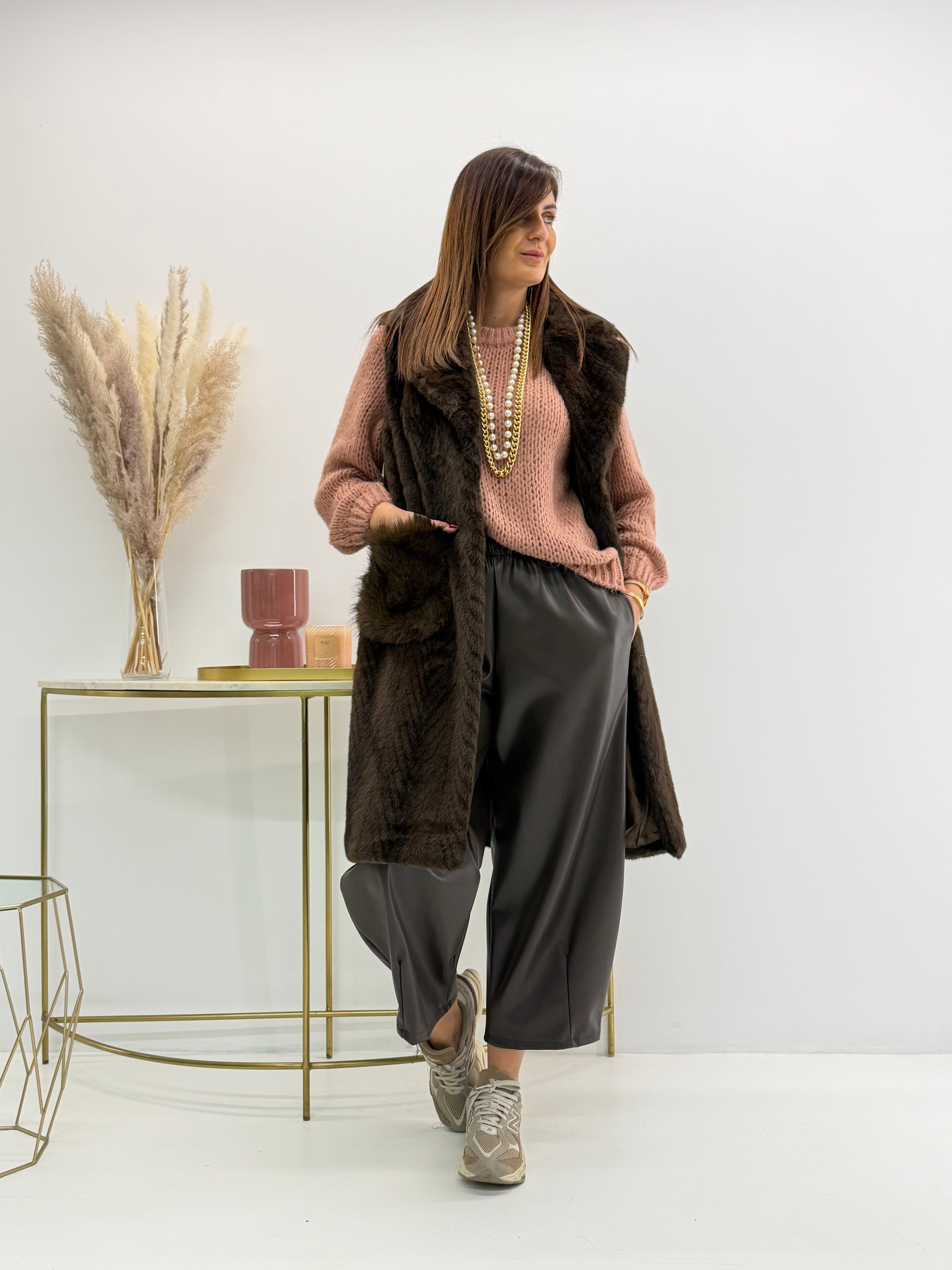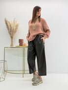 Pantalone in ecopelle. Tasche laterali a scomparsa, senza chiusura, elastico in vita, orlo leggermente ristretto con pinces.