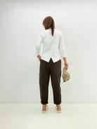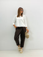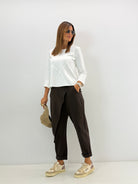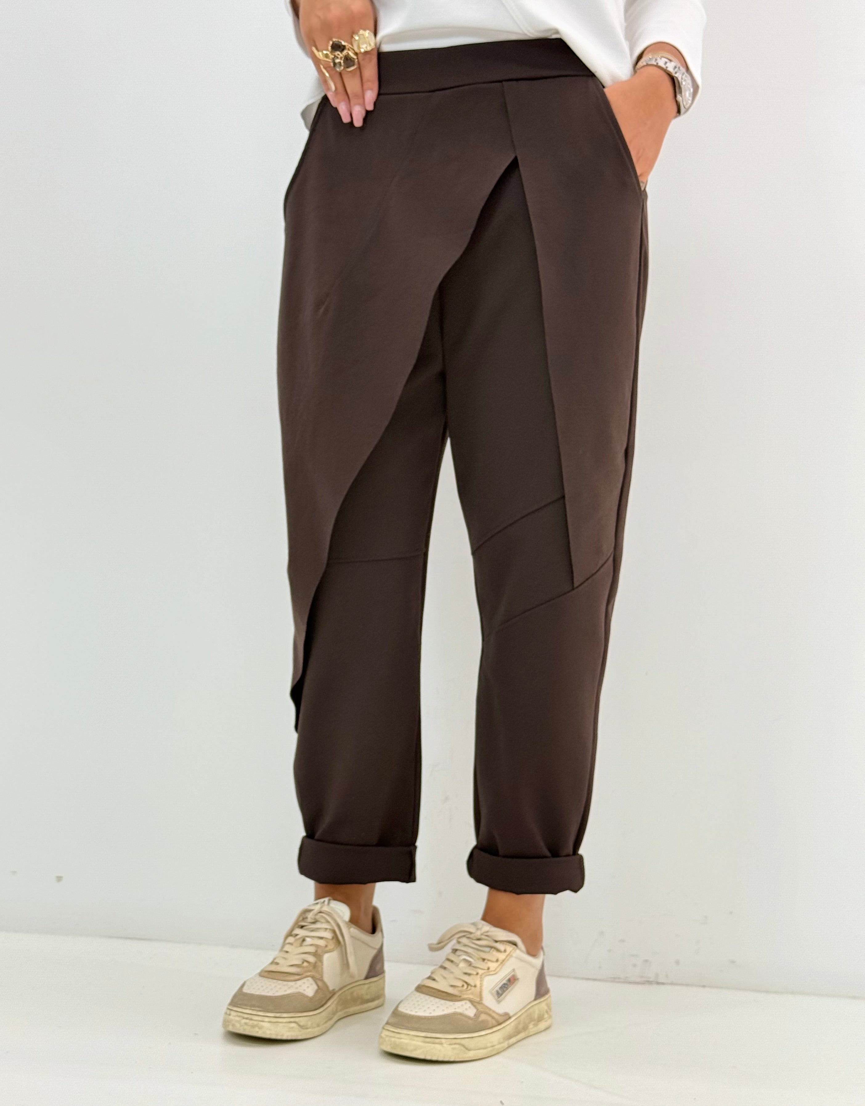 Pantalone in punto Milano, modello baggy, fascia elastica in vita, pattine trasversali davanti. Vestibilità comoda.