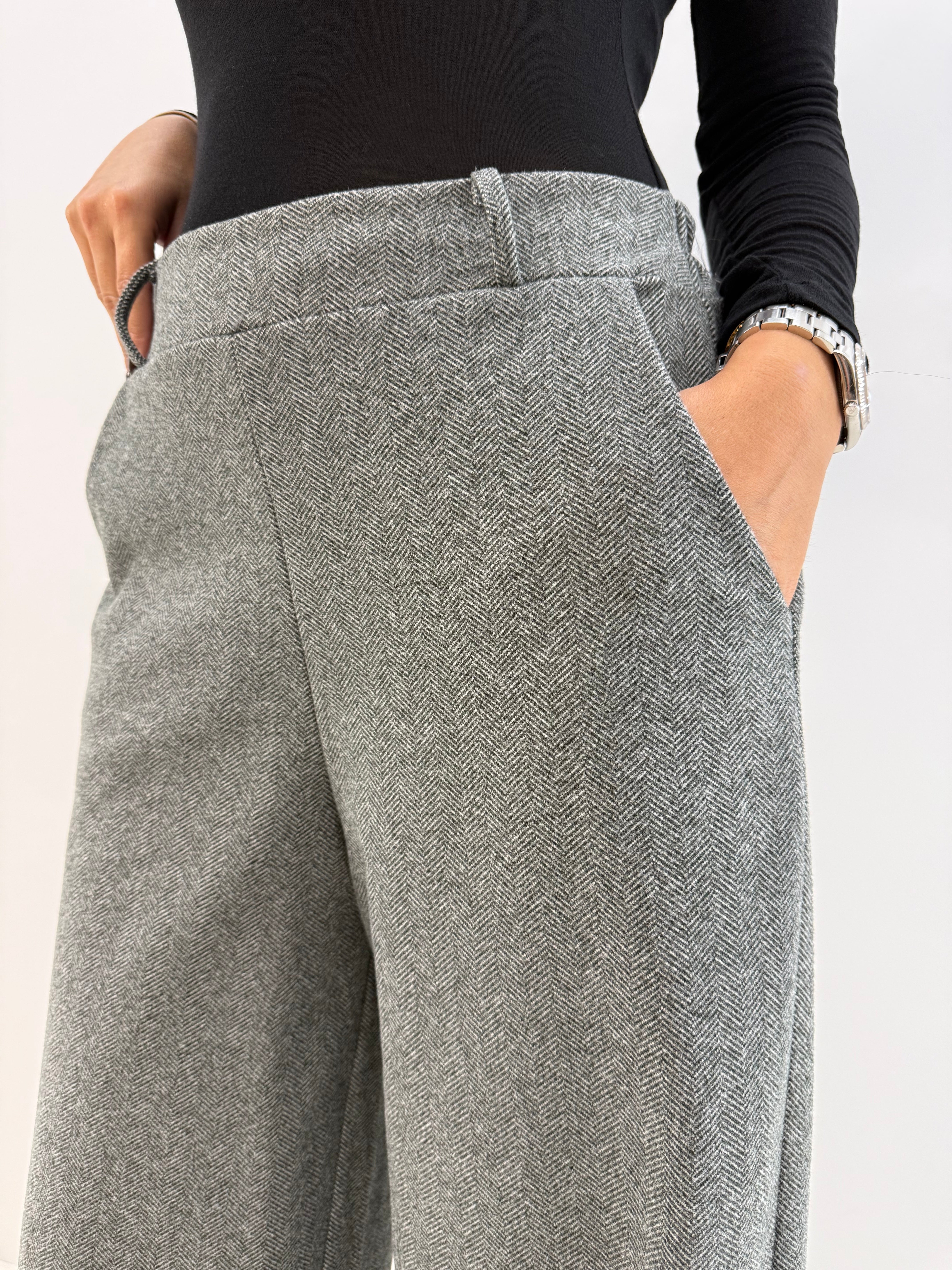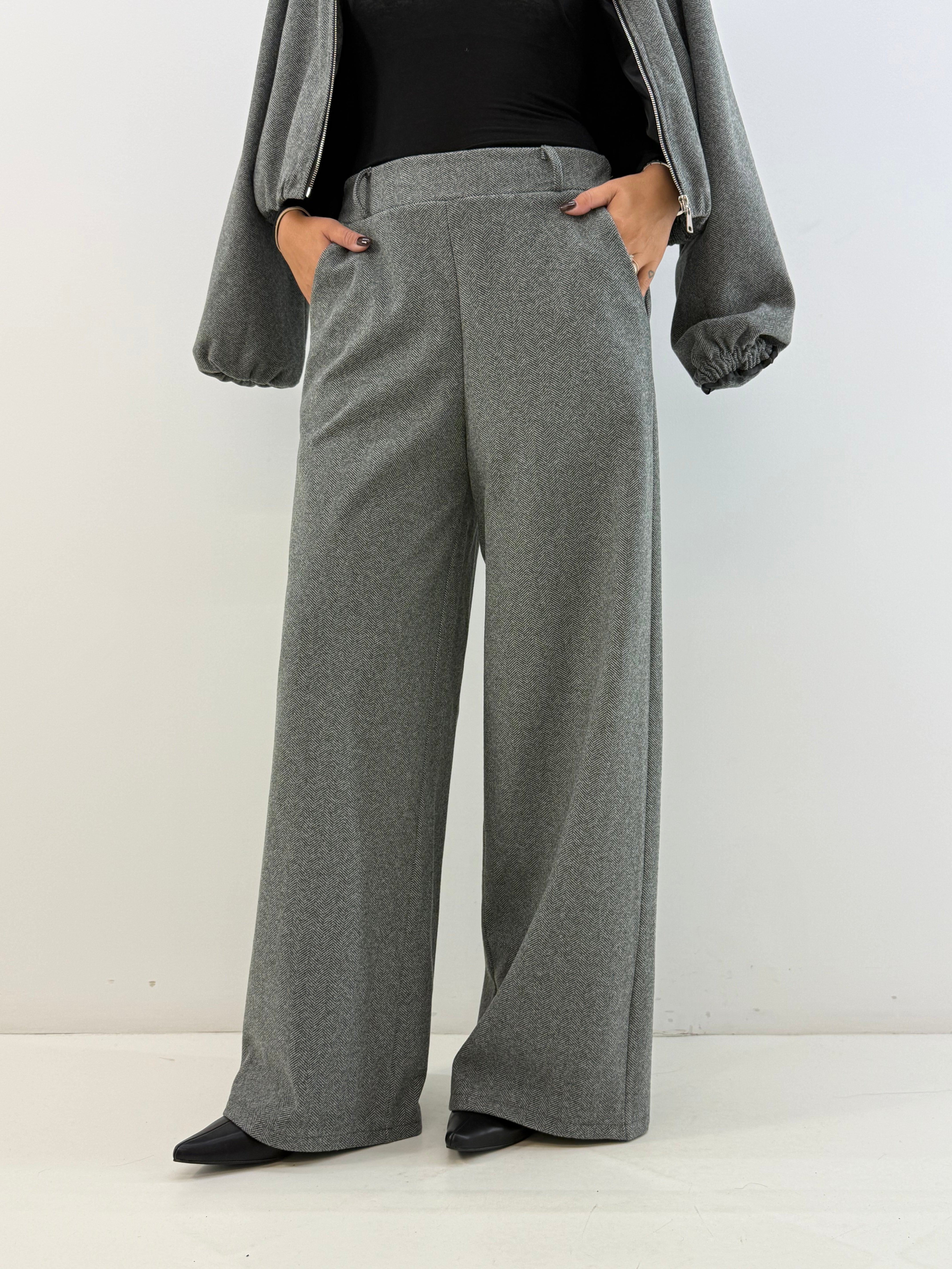 Pantaloni a gamba larga in tessuto spigato grigio, elastico in vita passanti per cintura e tasche laterali, senza chiusure.