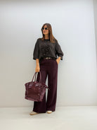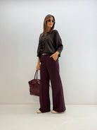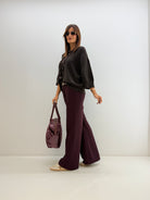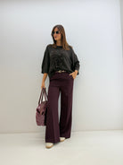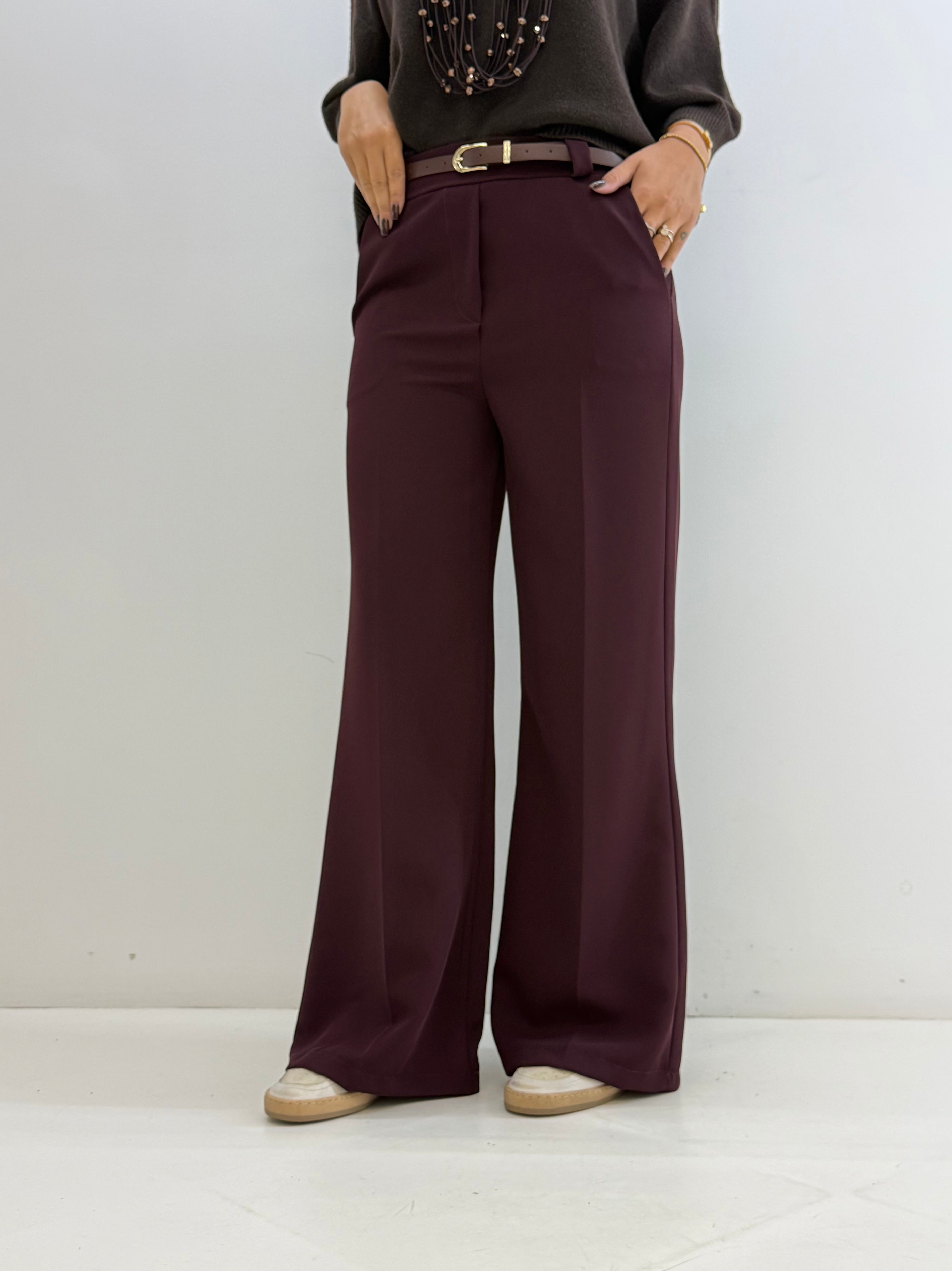 Pantalone con tasche laterali a lunetta, elastico in vita dietro, passanti per cintura, modello a gamba larga. Vestibilità a taglie.