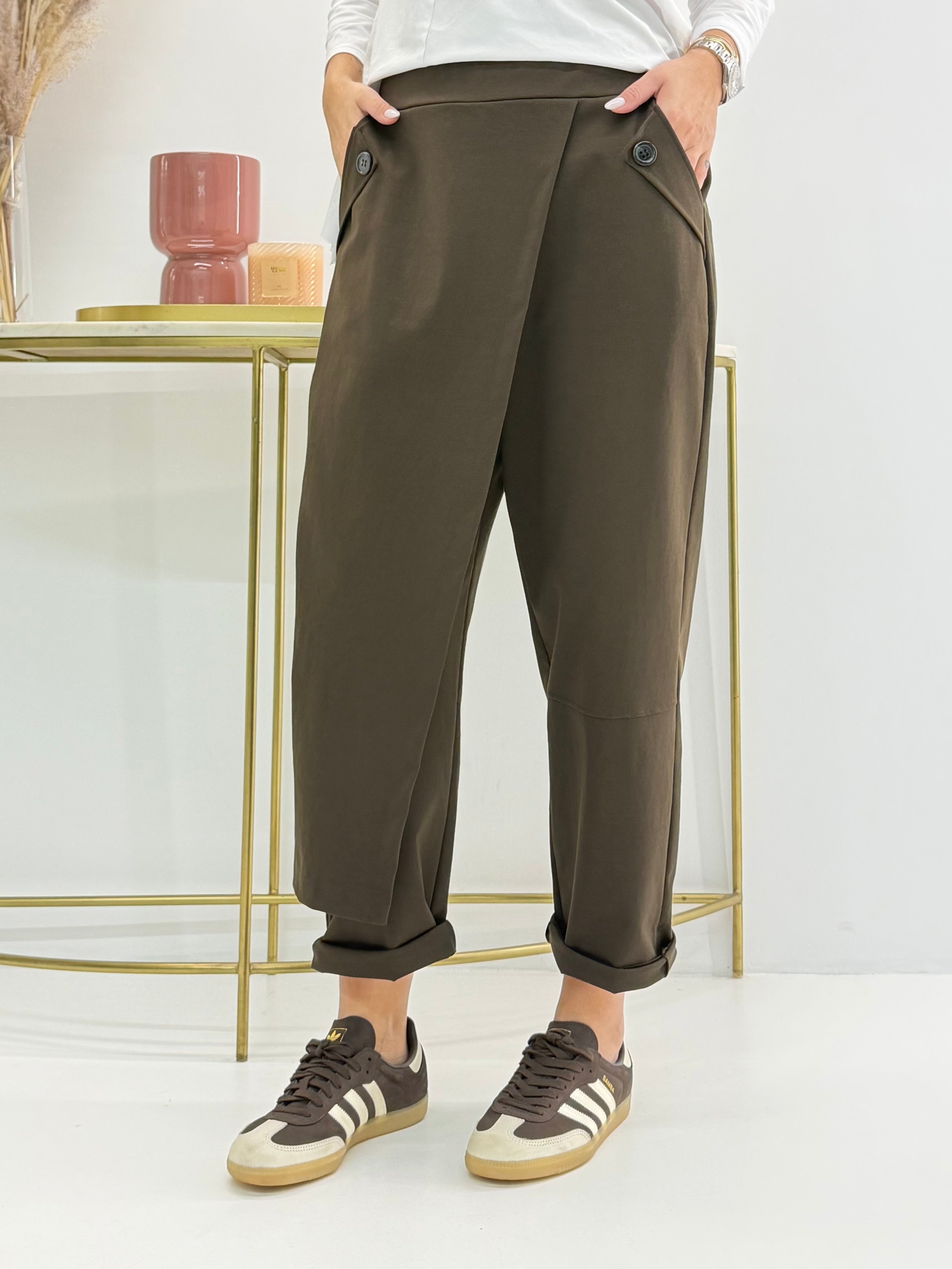 Pantaloni in punto Milano, con fascia elasticizzata in vita dietro, tasche laterali a lunetta con applicazione di bottoncino, piega sul davanti.