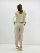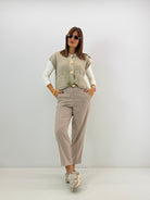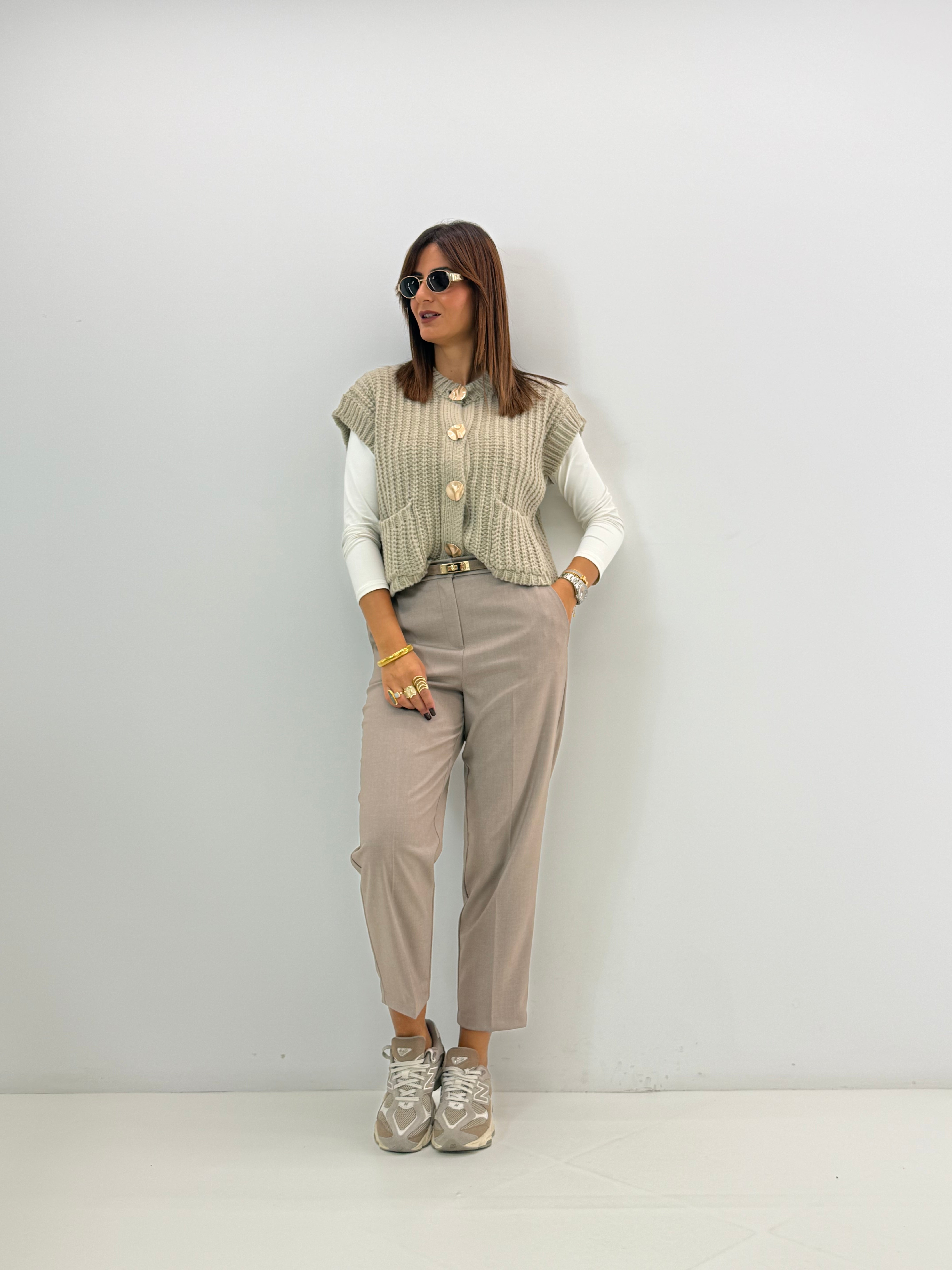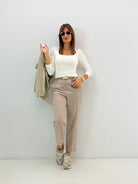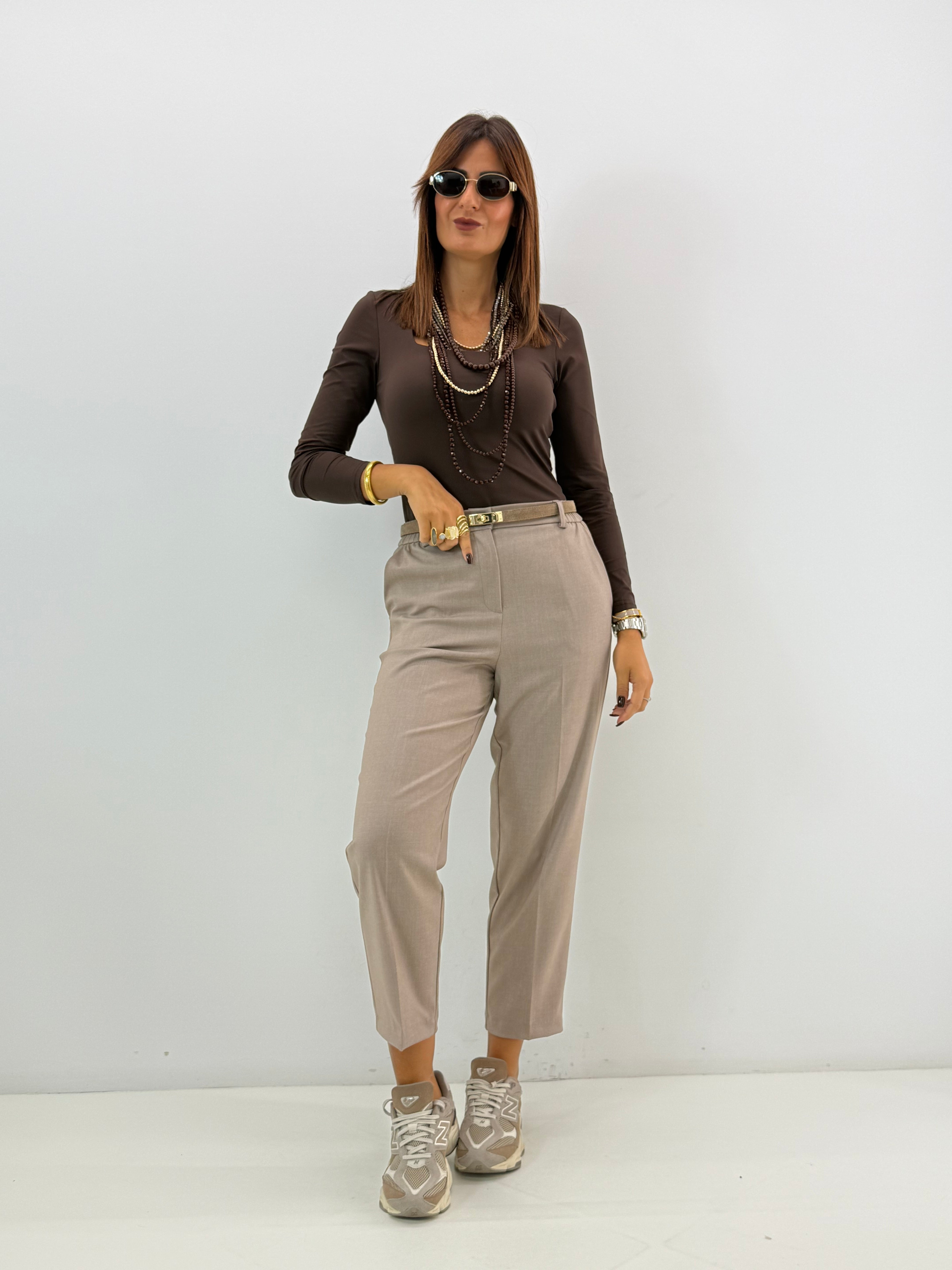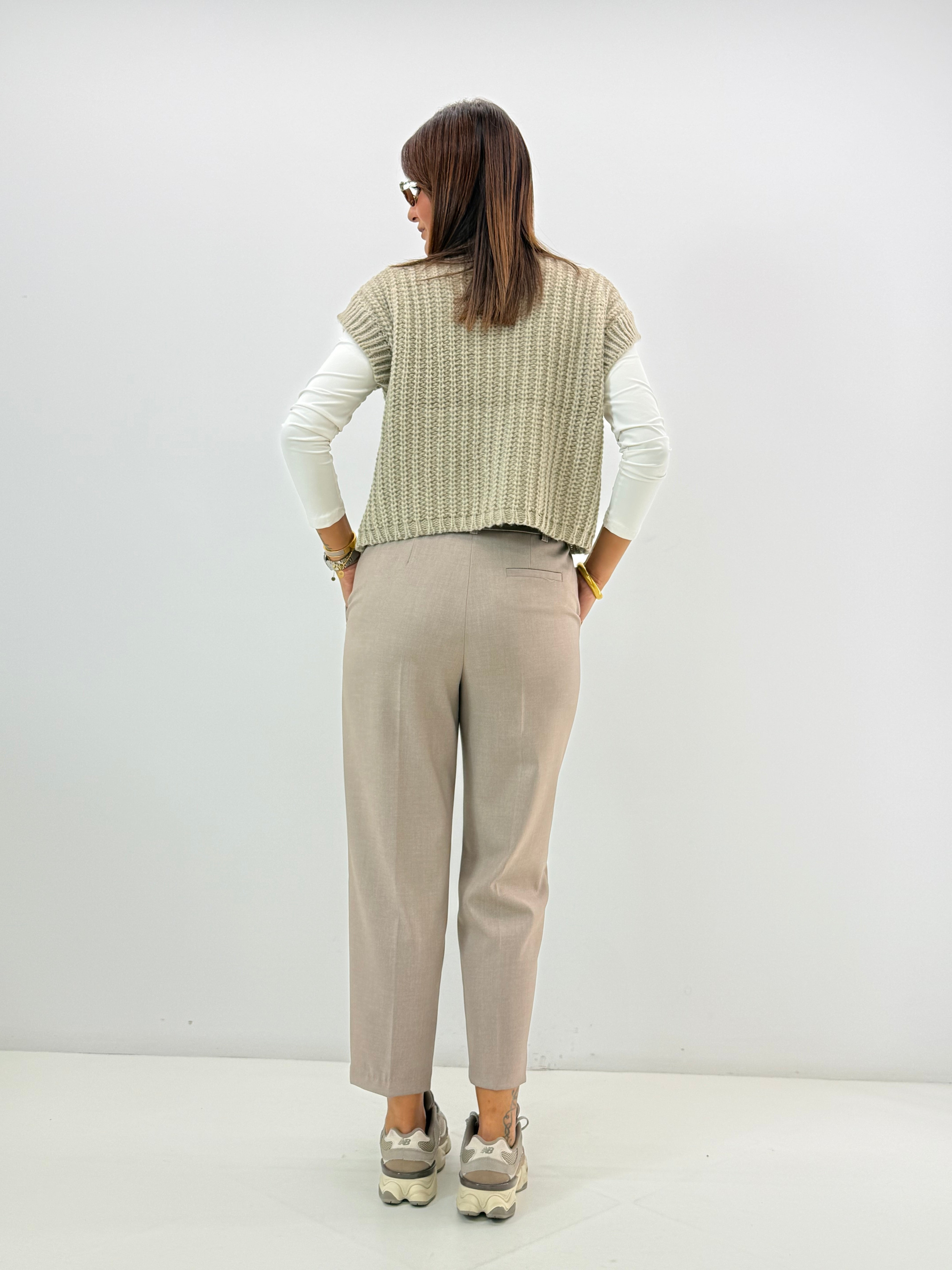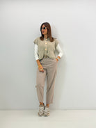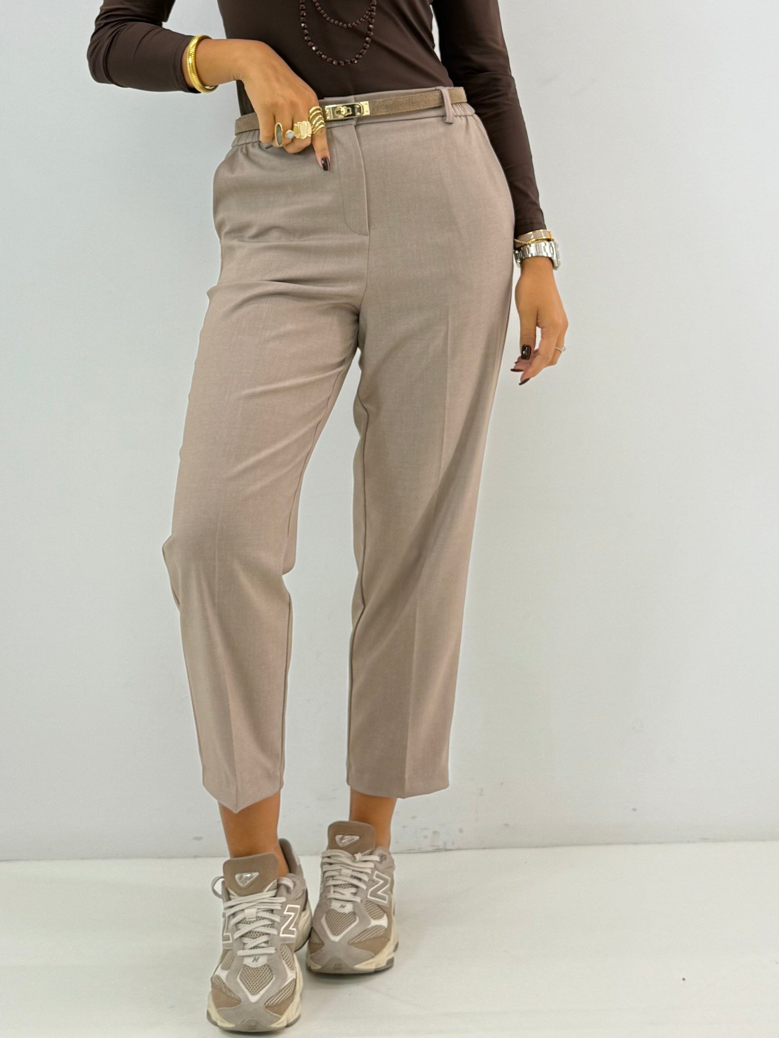 Pantalone con tasche laterali a lunetta, chiusura con bottone e zip, passanti per cintura, elastico in vita dietro. Vestibilità a taglie.