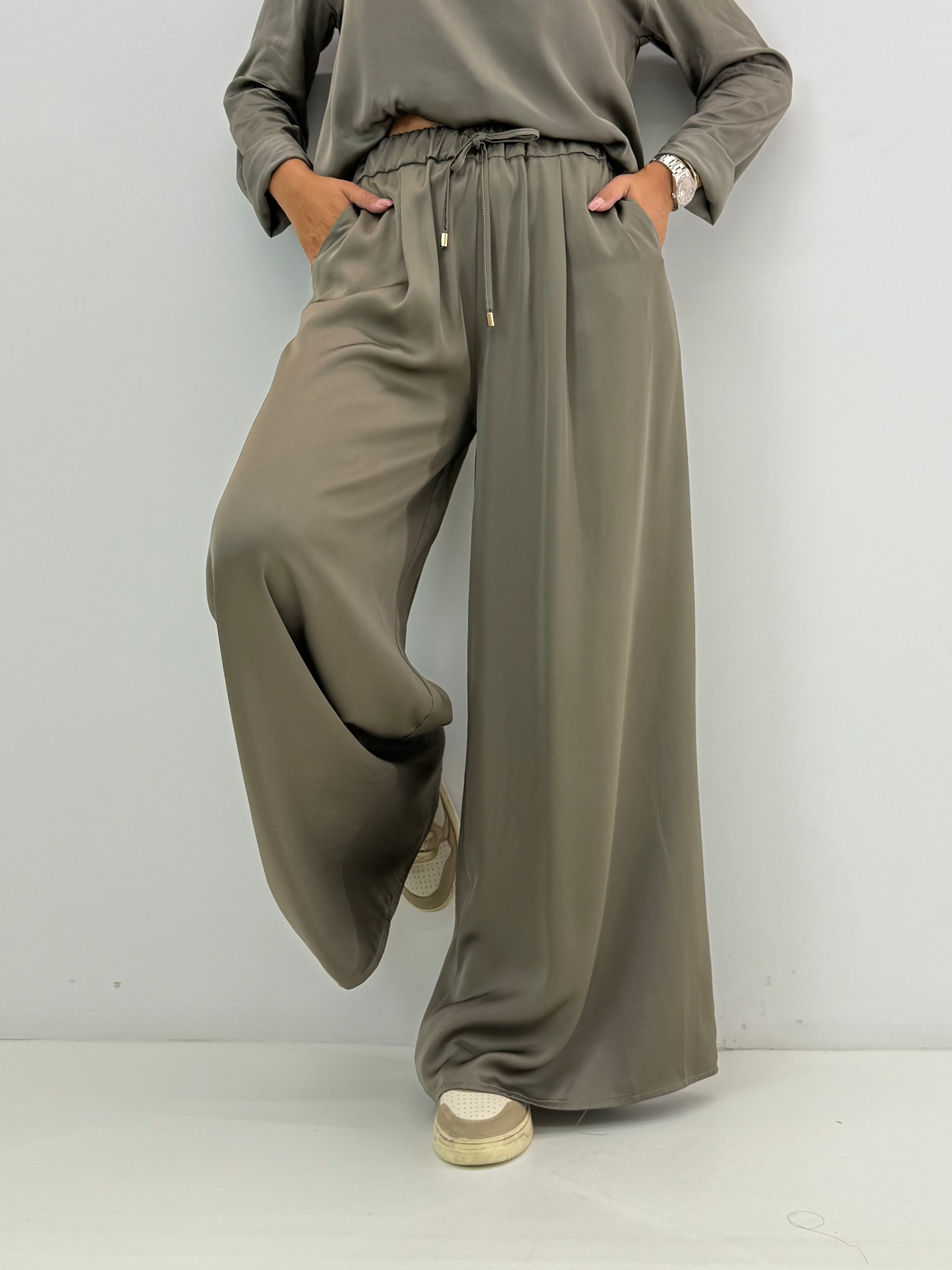 Pantalone palazzo in satin di viscosa, con elastico in vita e coulisse, tasche laterali a scomparsa. Vestibilità comoda e a taglie
