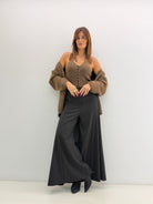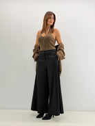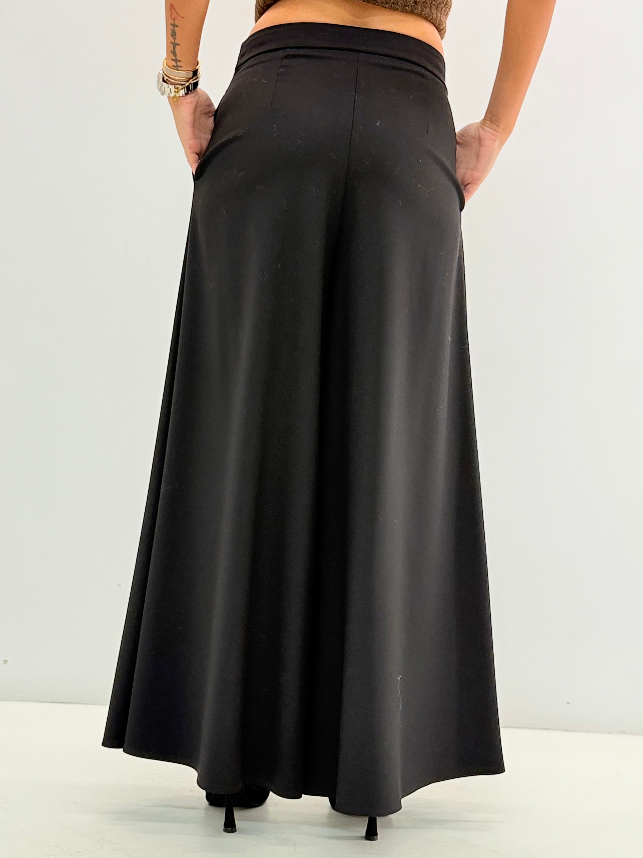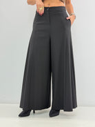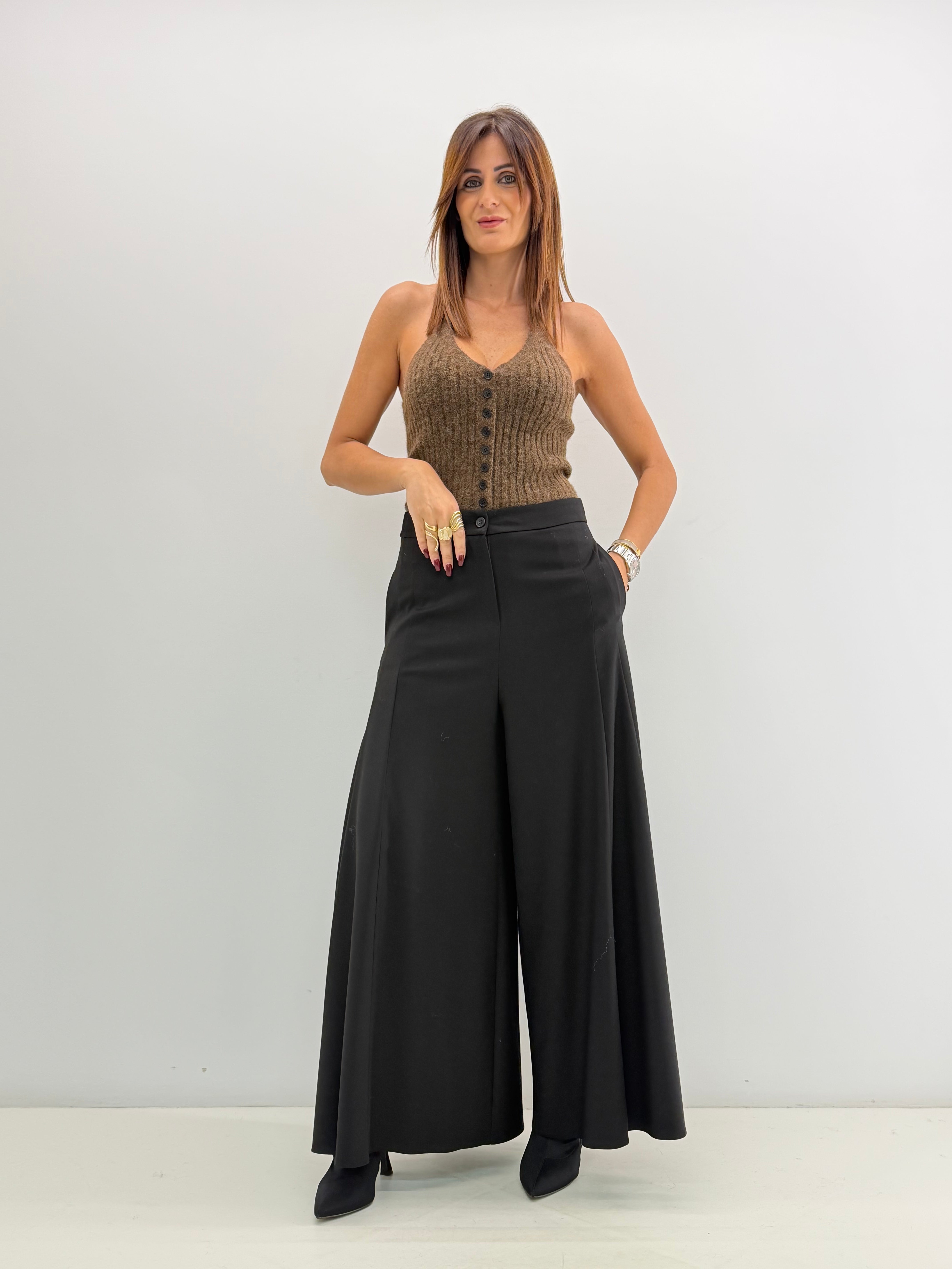 Pantalone con tasche laterali a scomparsa, chiusura con bottone e zip,  passanti per cintura, modello a palazzo. Vestibilità a taglie.