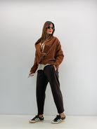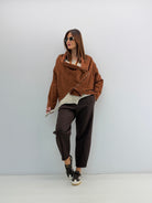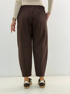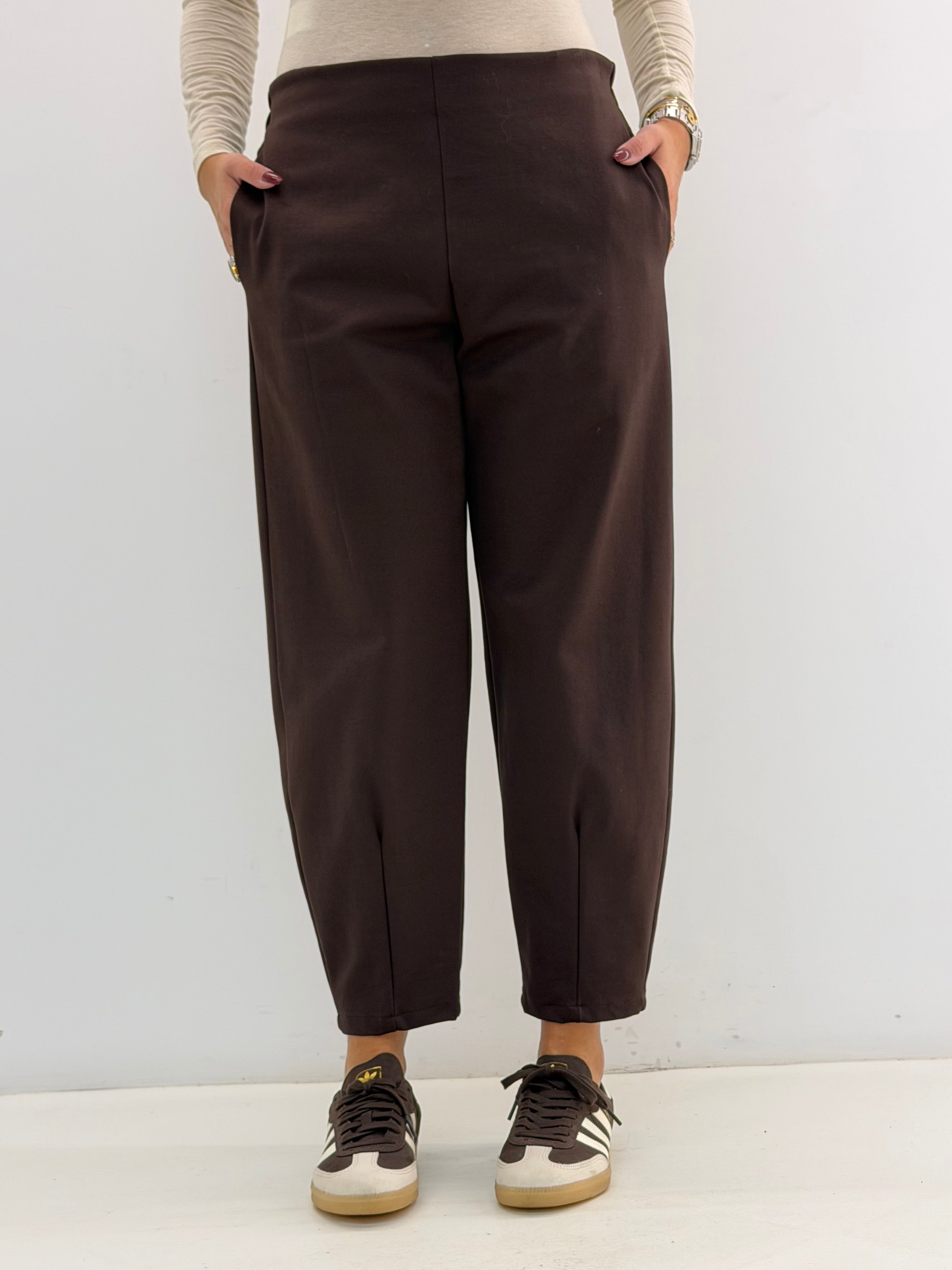 Pantaloni in misto cotone, con fascia elasticizzata in vita dietro ,orlo leggermente ristretto con pinces, tasche laterali nella cucitura, e una tasca applicata dietro. Vestibilità ampia e comoda.