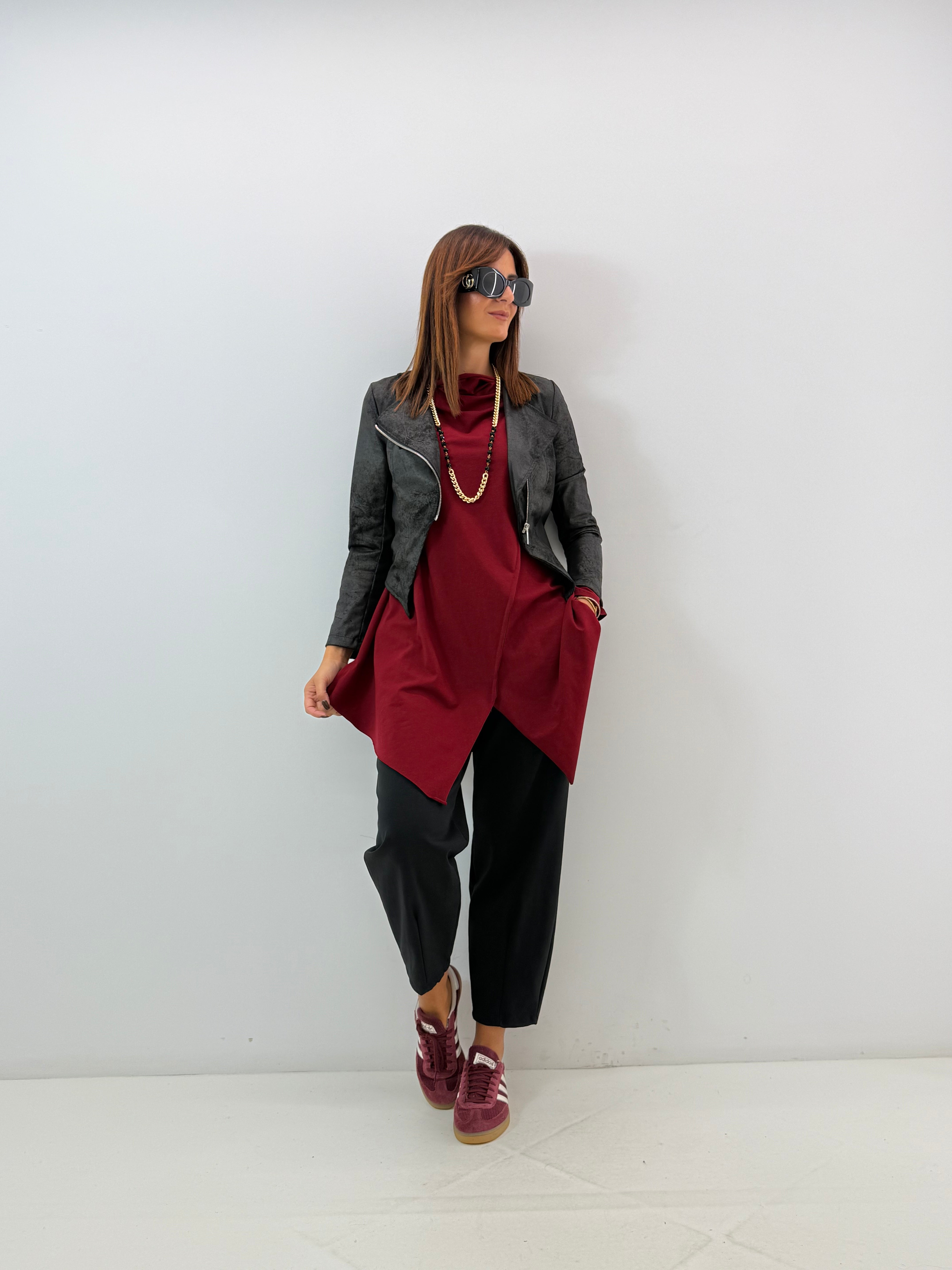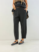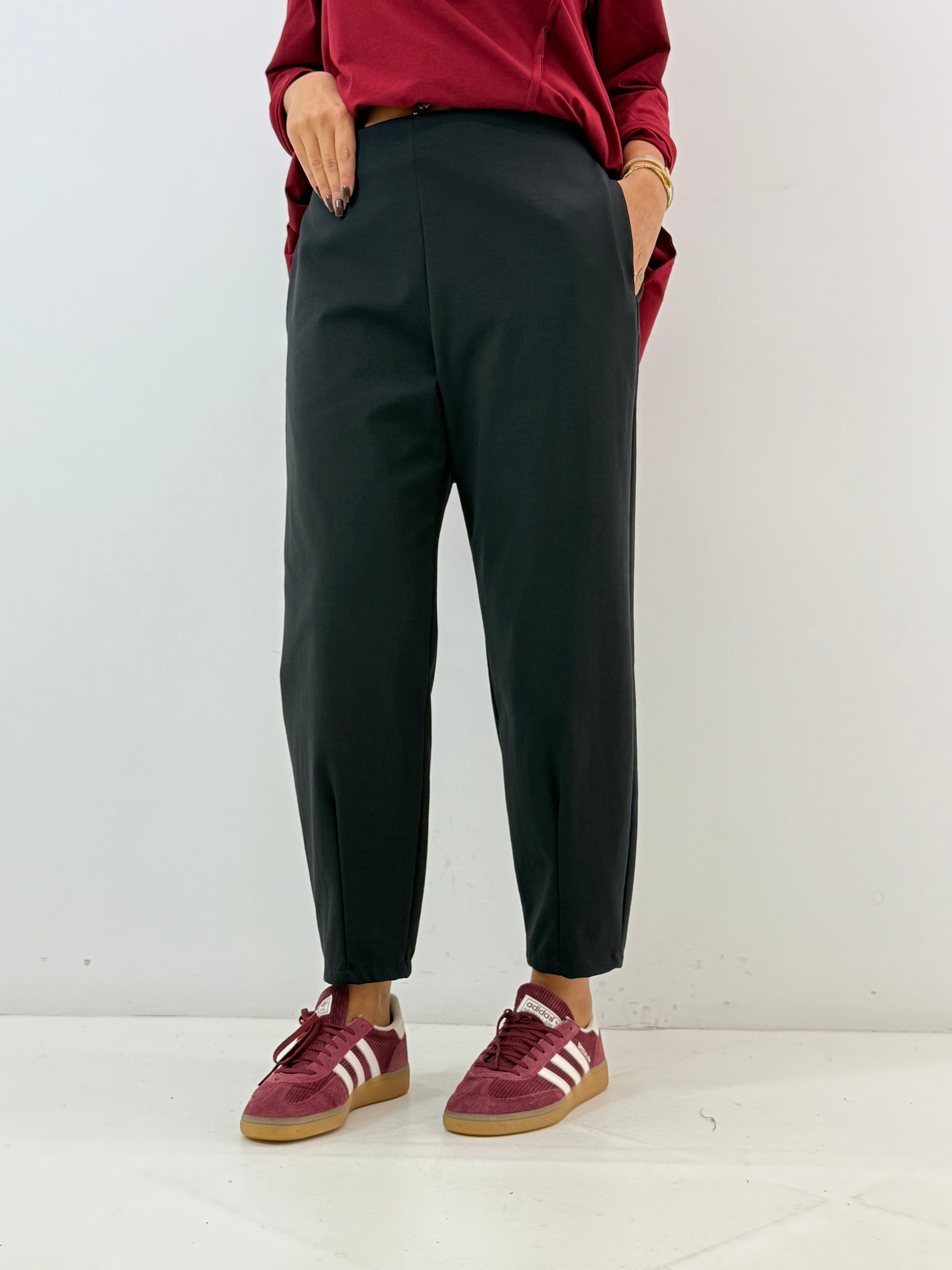 Pantaloni in misto cotone, con fascia elasticizzata in vita dietro ,orlo leggermente ristretto con pinces, tasche laterali nella cucitura, e una tasca applicata dietro. Vestibilità ampia e comoda.