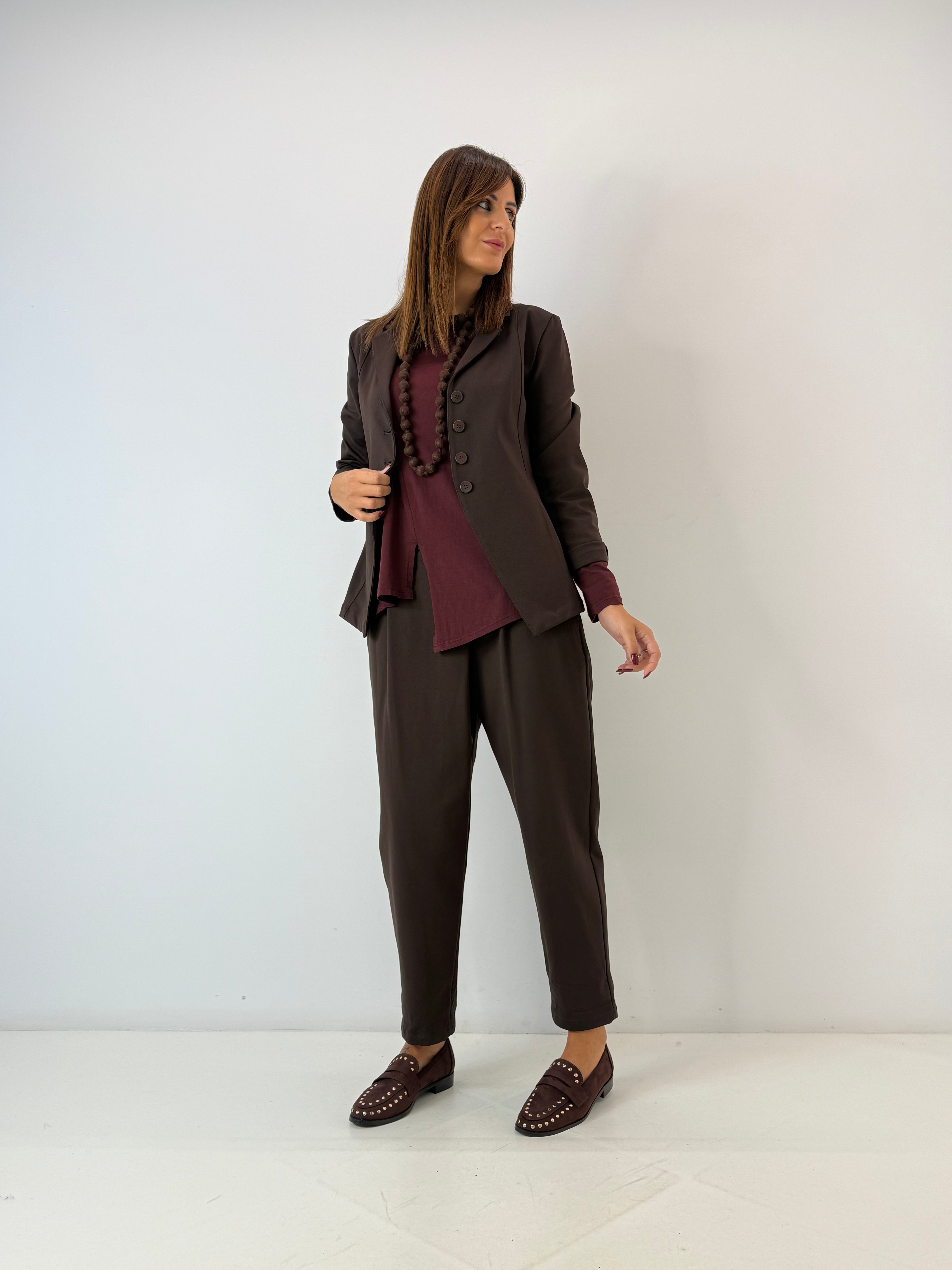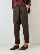 Pantaloni in punto Milano, con piega frontale . Fascia elasticizzata in vita dietro, passanti per cintura. Tasche laterali a scomparsa. Vestibilità comoda.