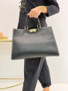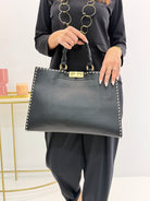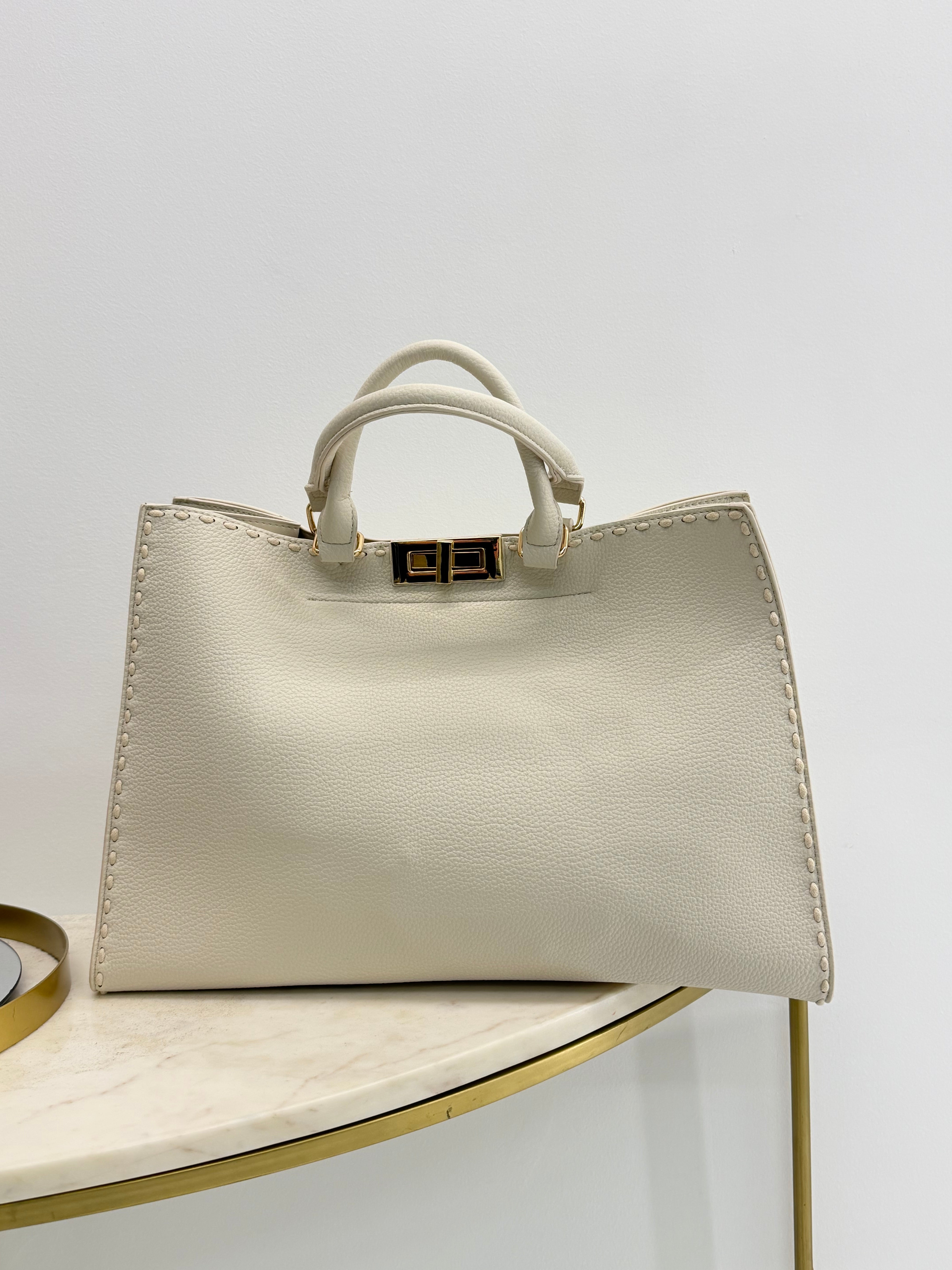 Borsa in eco pelle, manici corti e chiusura con zip interna e gancetto, perfetta per ogni occasione, tracolla removibile, taschina interna. Dettaglio esterno di cuciture sull'orlo.