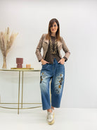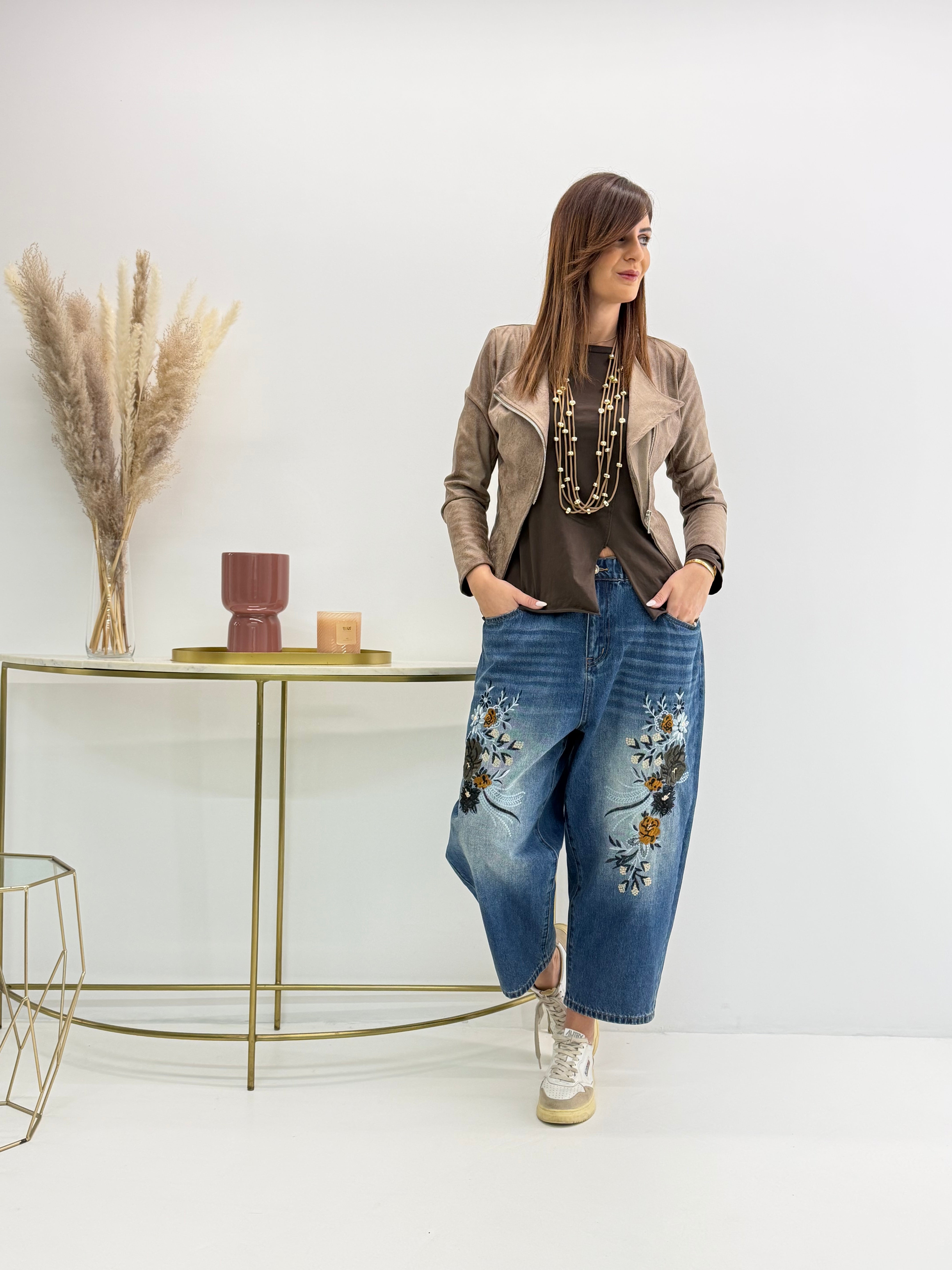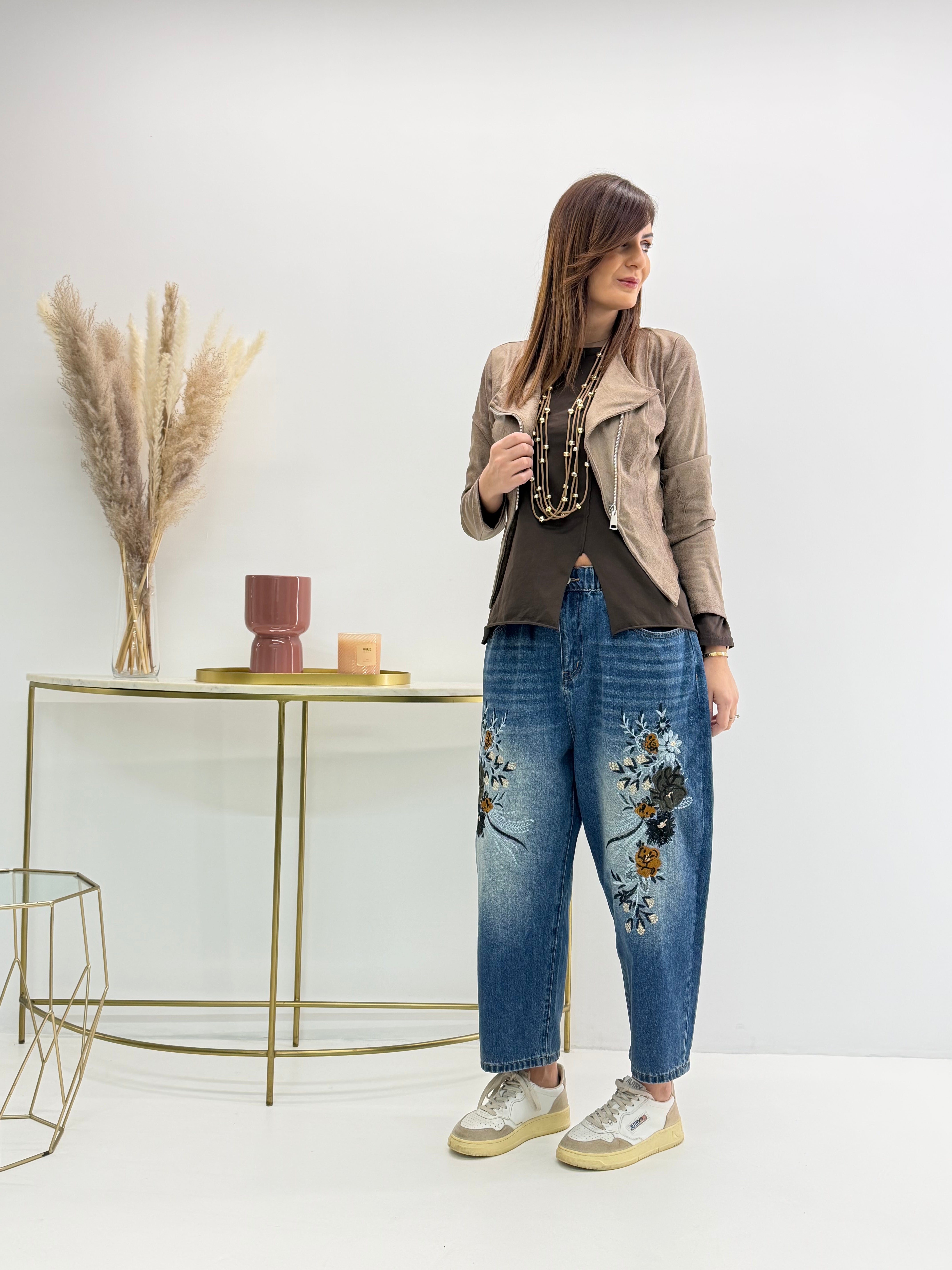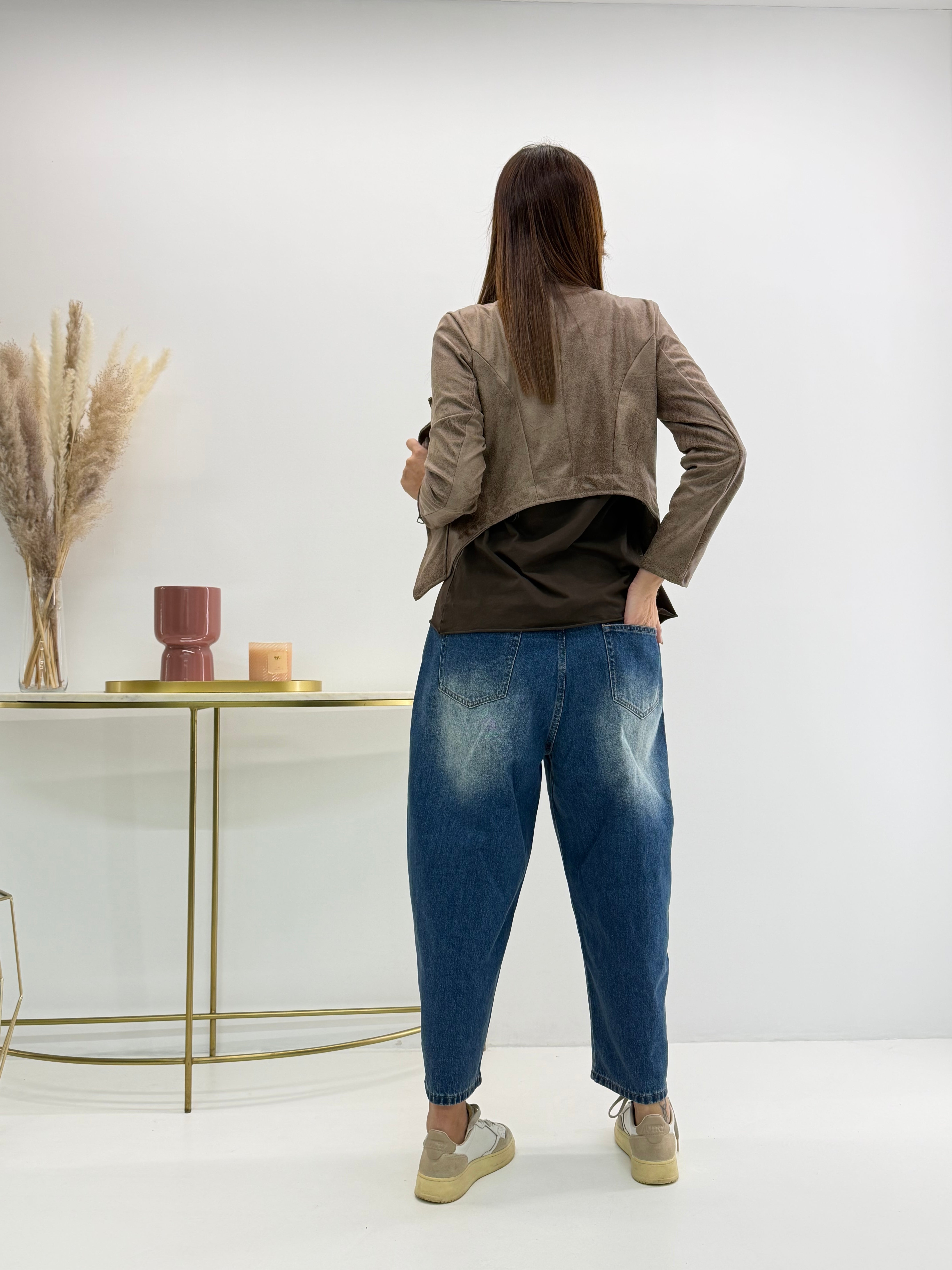 Giacca in morbida eco-pelle effetto scamosciato, chiusura con zip trasversale sul davanti, retro stondato e più corto. Vestibilità a taglie