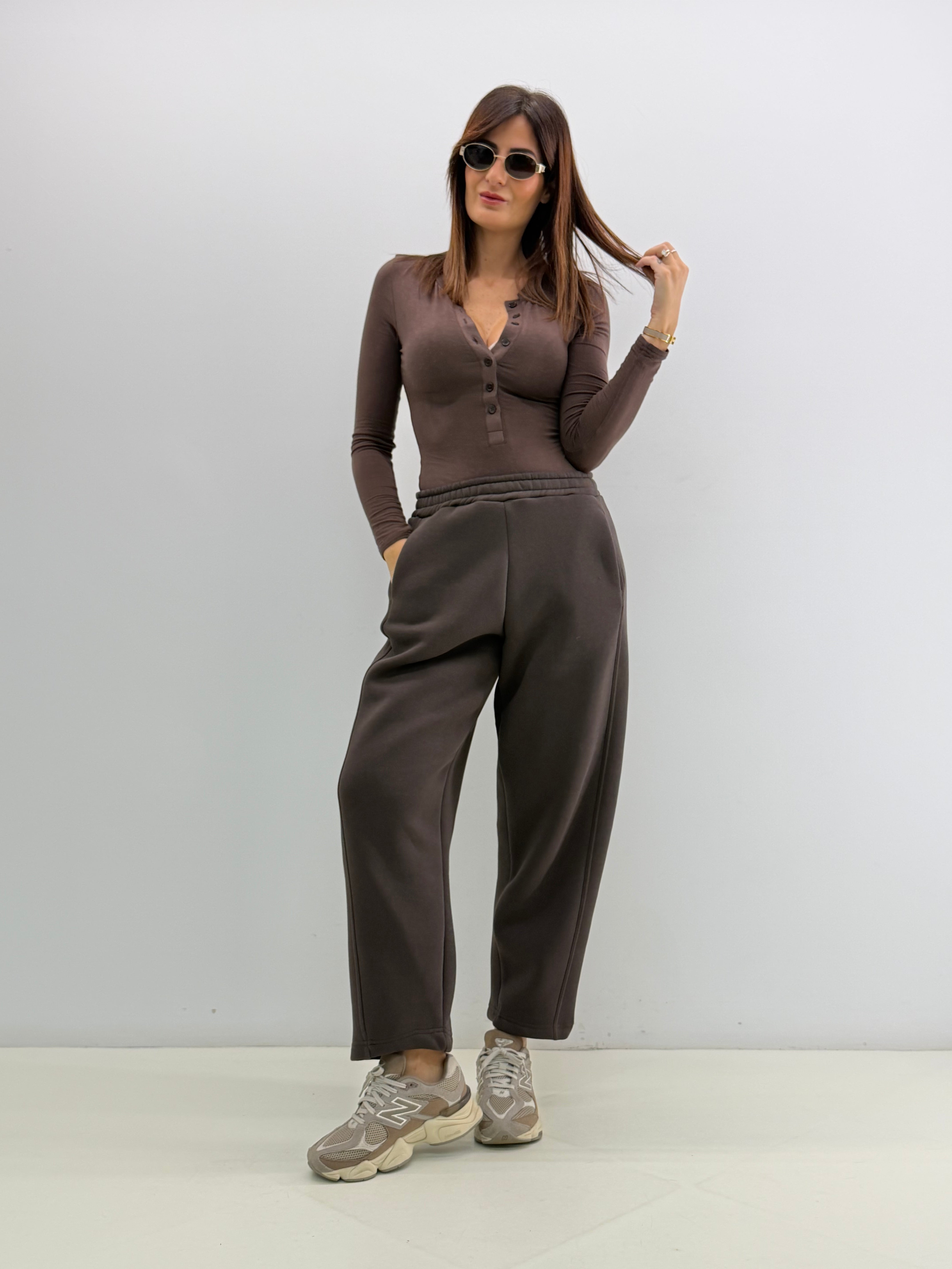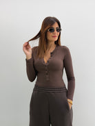 Body, bottoncini davanti, elasticizzato, chiusura con gancetti nella parte finale.